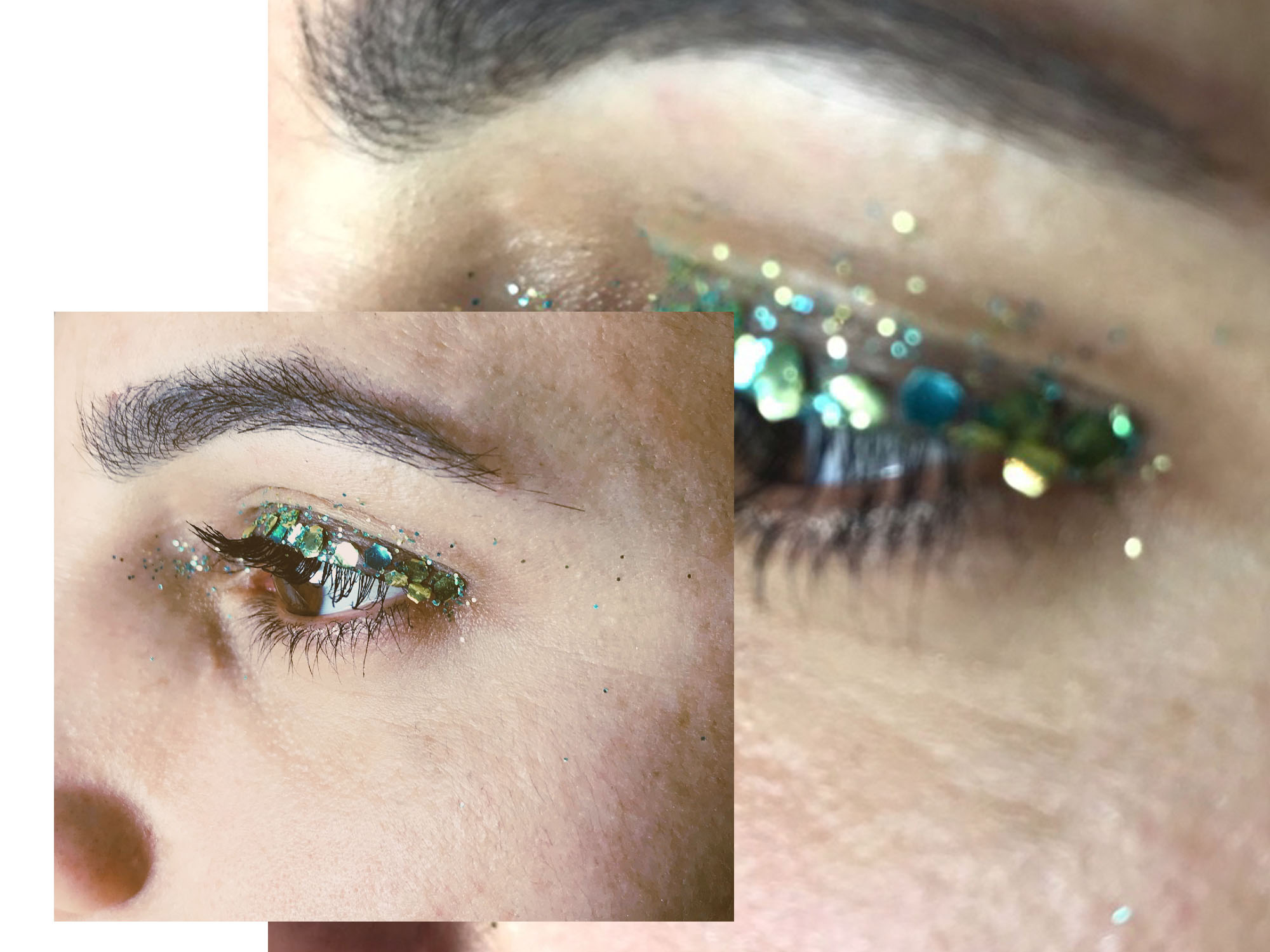 Leider ist die Sache mit dem Glitzer auftragen nicht ganz so einfach, denn schnell bröselt der Staub runter und meist geht ganz schön viel daneben. Genau aus diesem Grund habe ich kurzerhand beschlossen, dass Perfektion hier unangebracht scheint. Es geht um die Sache an sich und es macht nicht weniger glücklich, wenn links oder rechts ein bisschen mehr oder weniger Glitzer schimmert. Hauptsache ihr funkelt. Wie ihr wisst, trage ich Beauty-Produkte am liebsten mit den Fingern auf, um die beste Kontrolle zu behalten, Bloß bei Glitzer, da mache ich eine Ausnahme und setze tatsächlich auf Pinsel, um die Partikel anschließend nicht überall hängen zu haben.