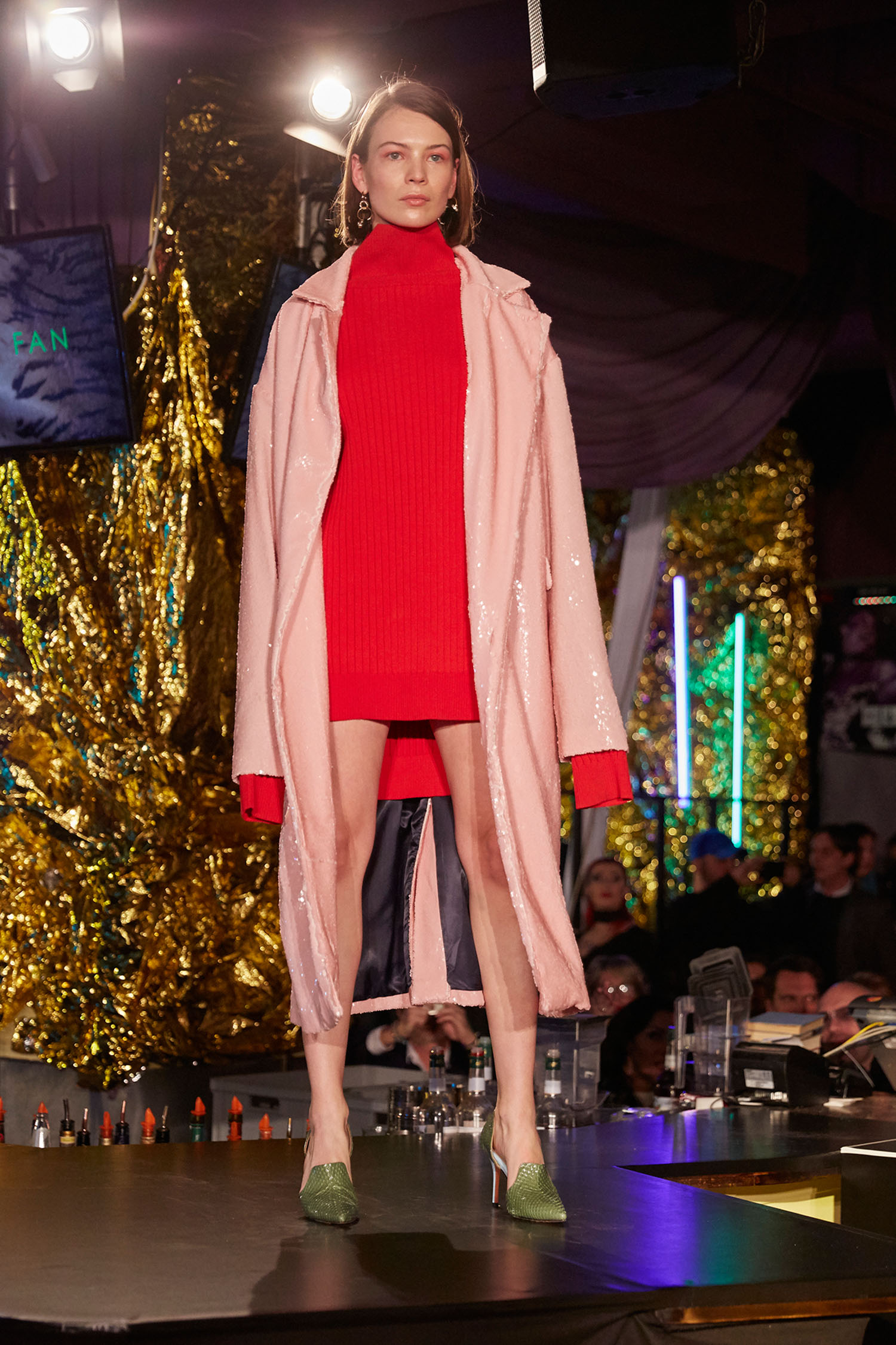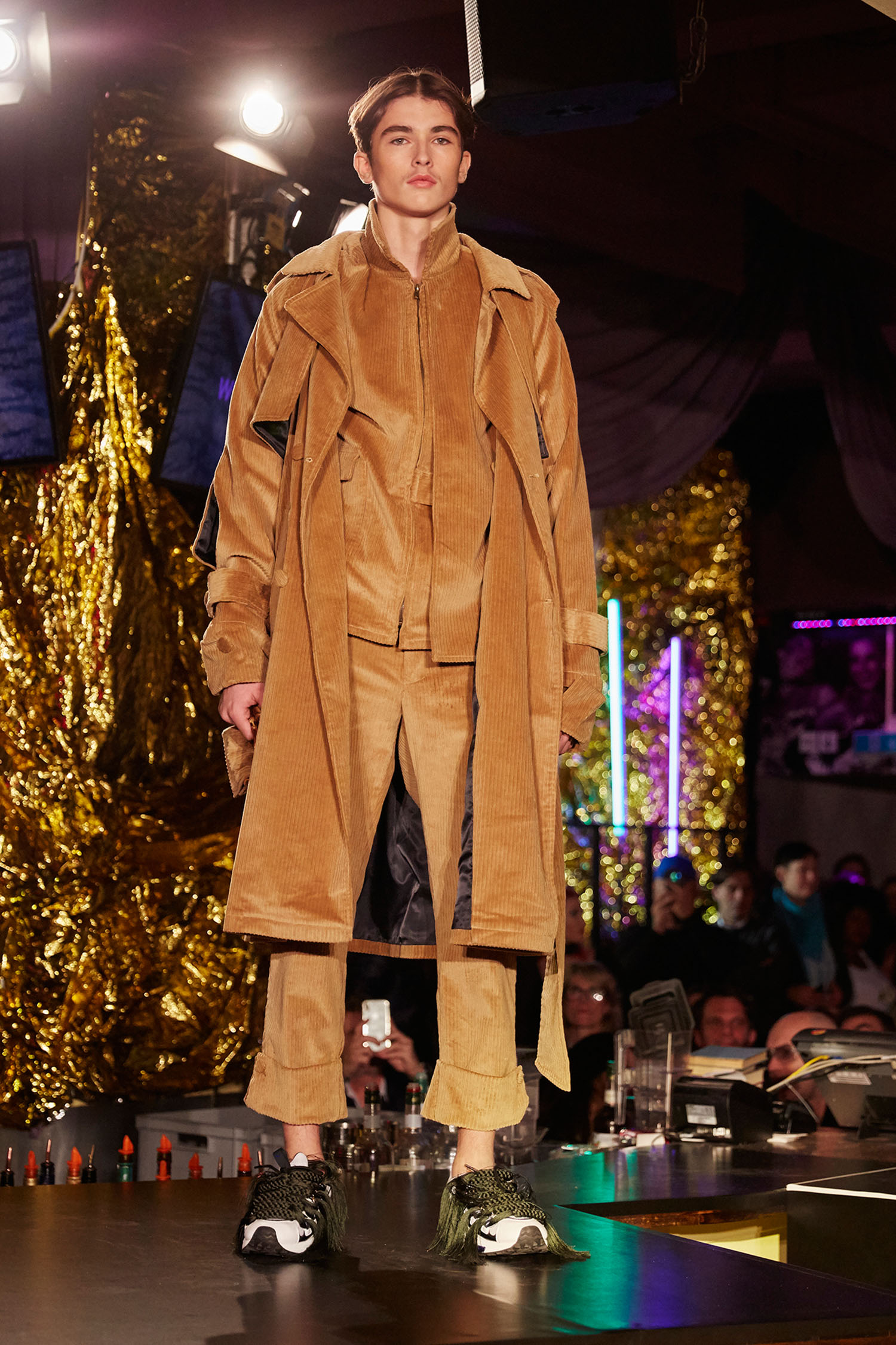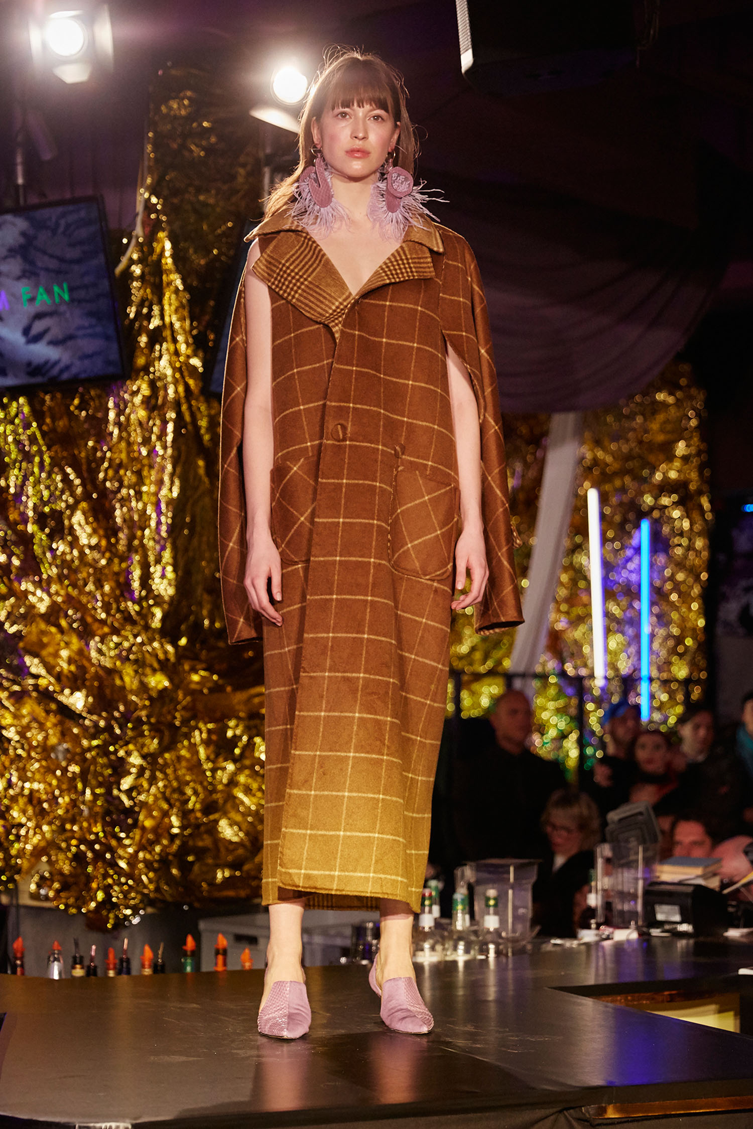 „It’s your time to shine“ – soll uns vor Augen führen, dass wir unsere Comfort Zone öfter mal wieder verlassen sollen, um in eine andere Welt einzutauchen. Und auch Mode sorgt regelmäßig dafür, dass wir uns ganz unterschiedlich kleiden, um andere Facetten von uns zum Ausdruck zu bringen. Sinnbildlich wählte der Designer eine Location, in der wir mutig sein müssen, um vor Publikum zu performen, in der wir in eine andere Rolle schlüpfen sollen, um uns anders zu fühlen und uns neu wahrzunehmen. Und genau hier schlägt er eine Brücke zu seinen Designs, die gestern Abend auf der Theke der Karaoke Bar präsentiert wurden. Uns muss nicht jeder Look komplett zusagen, um das Konzept und FANs Intention zu verstehen; wir können uns bei dem Berliner Designer ganz wunderbar einen Look (Song) aussuchen und ihn ganz nach unserem Gusto (oder im Vollplayback) interpretieren (zu singen).