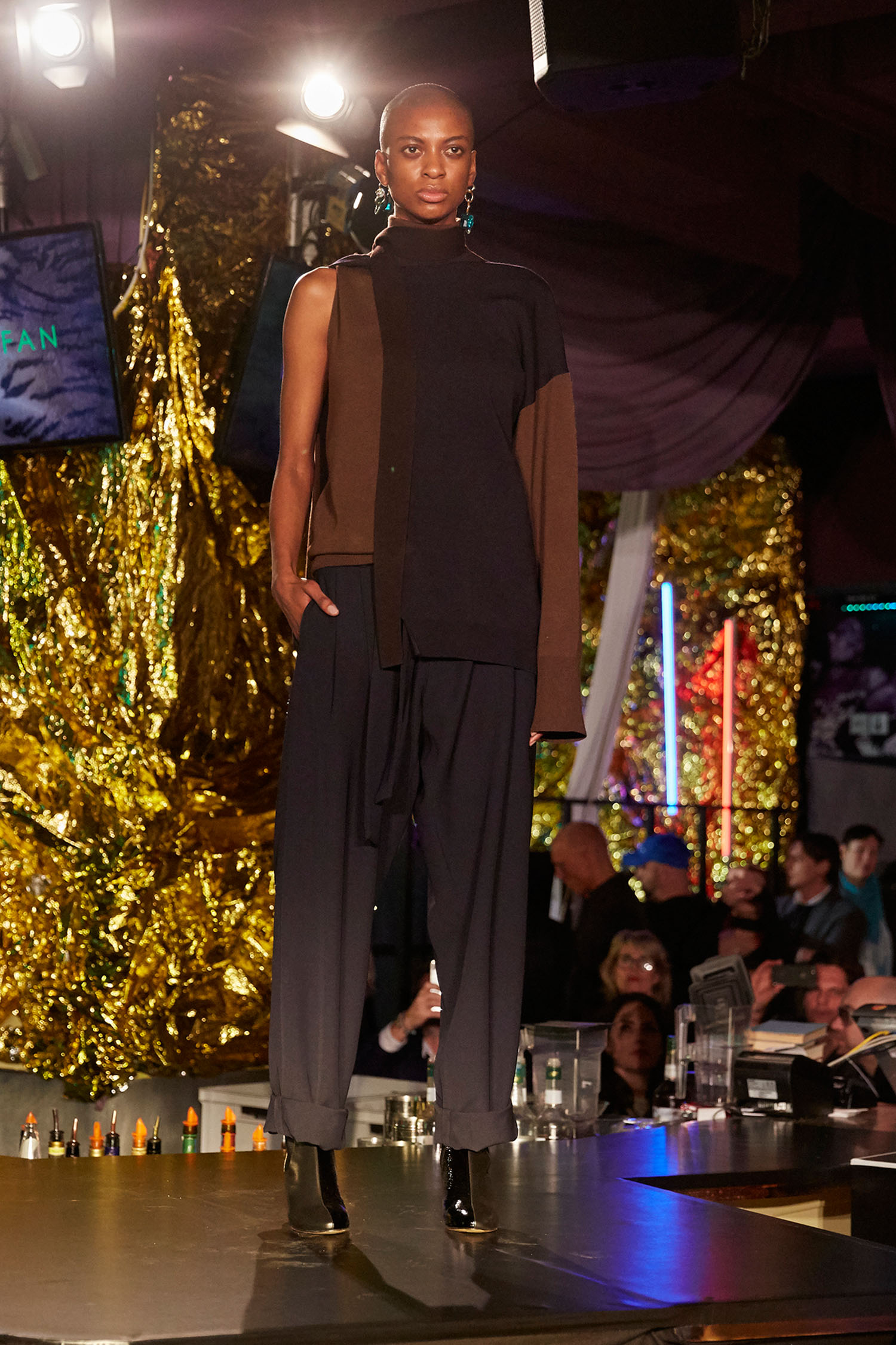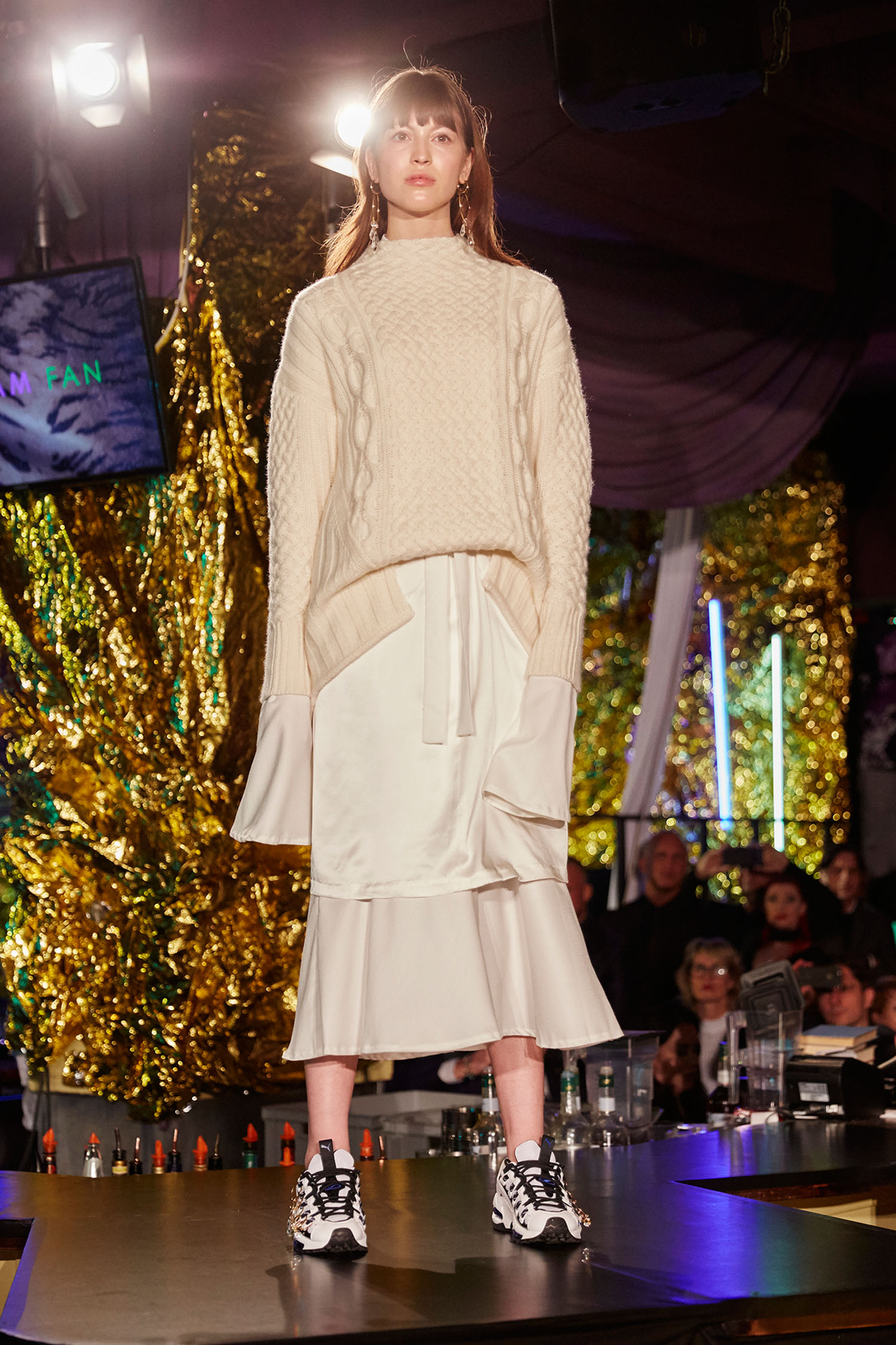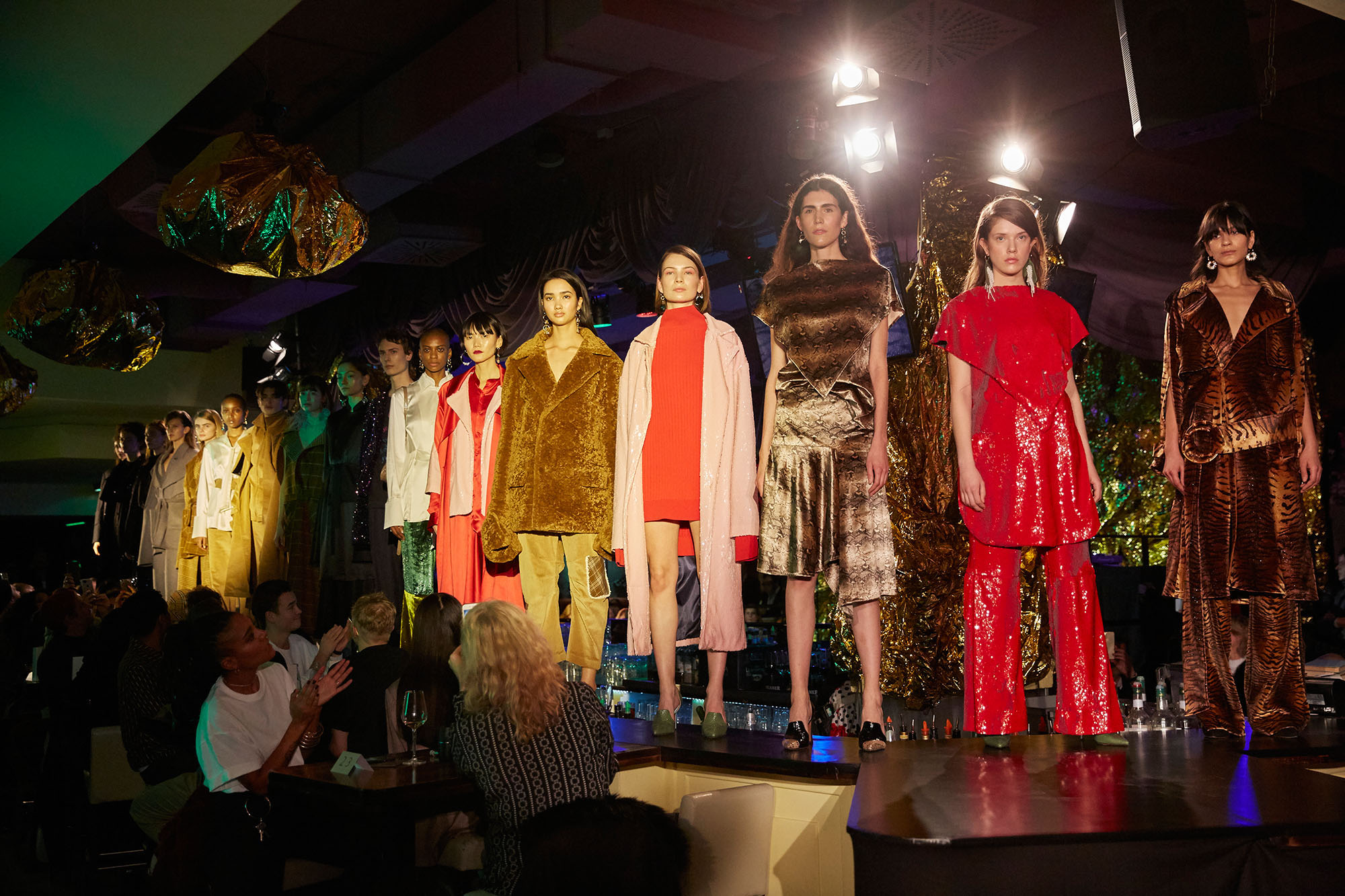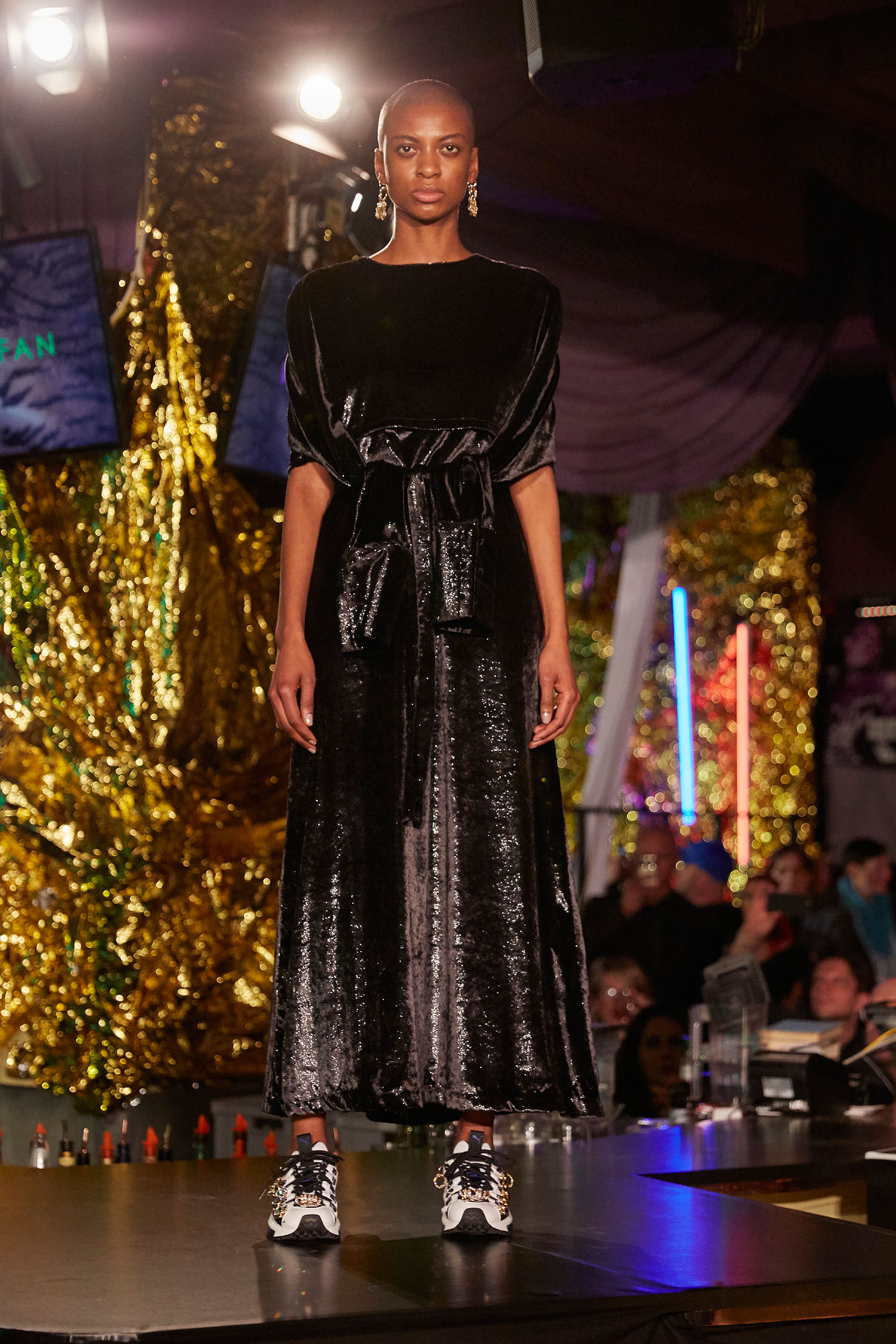„It’s your time to shine“ – soll uns vor Augen führen, dass wir unsere Comfort Zone öfter mal wieder verlassen sollen, um in eine andere Welt einzutauchen. Und auch Mode sorgt regelmäßig dafür, dass wir uns ganz unterschiedlich kleiden, um andere Facetten von uns zum Ausdruck zu bringen. Sinnbildlich wählte der Designer eine Location, in der wir mutig sein müssen, um vor Publikum zu performen, in der wir in eine andere Rolle schlüpfen sollen, um uns anders zu fühlen und uns neu wahrzunehmen. Und genau hier schlägt er eine Brücke zu seinen Designs, die gestern Abend auf der Theke der Karaoke Bar präsentiert wurden. Uns muss nicht jeder Look komplett zusagen, um das Konzept und FANs Intention zu verstehen; wir können uns bei dem Berliner Designer ganz wunderbar einen Look (Song) aussuchen und ihn ganz nach unserem Gusto (oder im Vollplayback) interpretieren (zu singen).