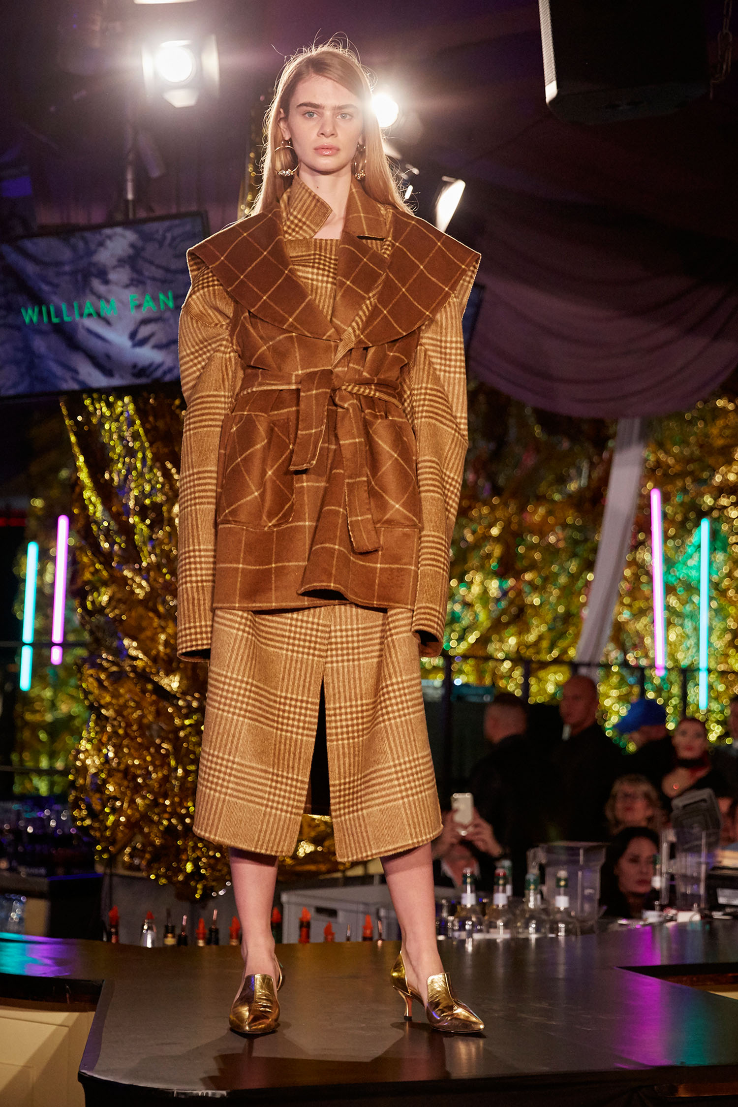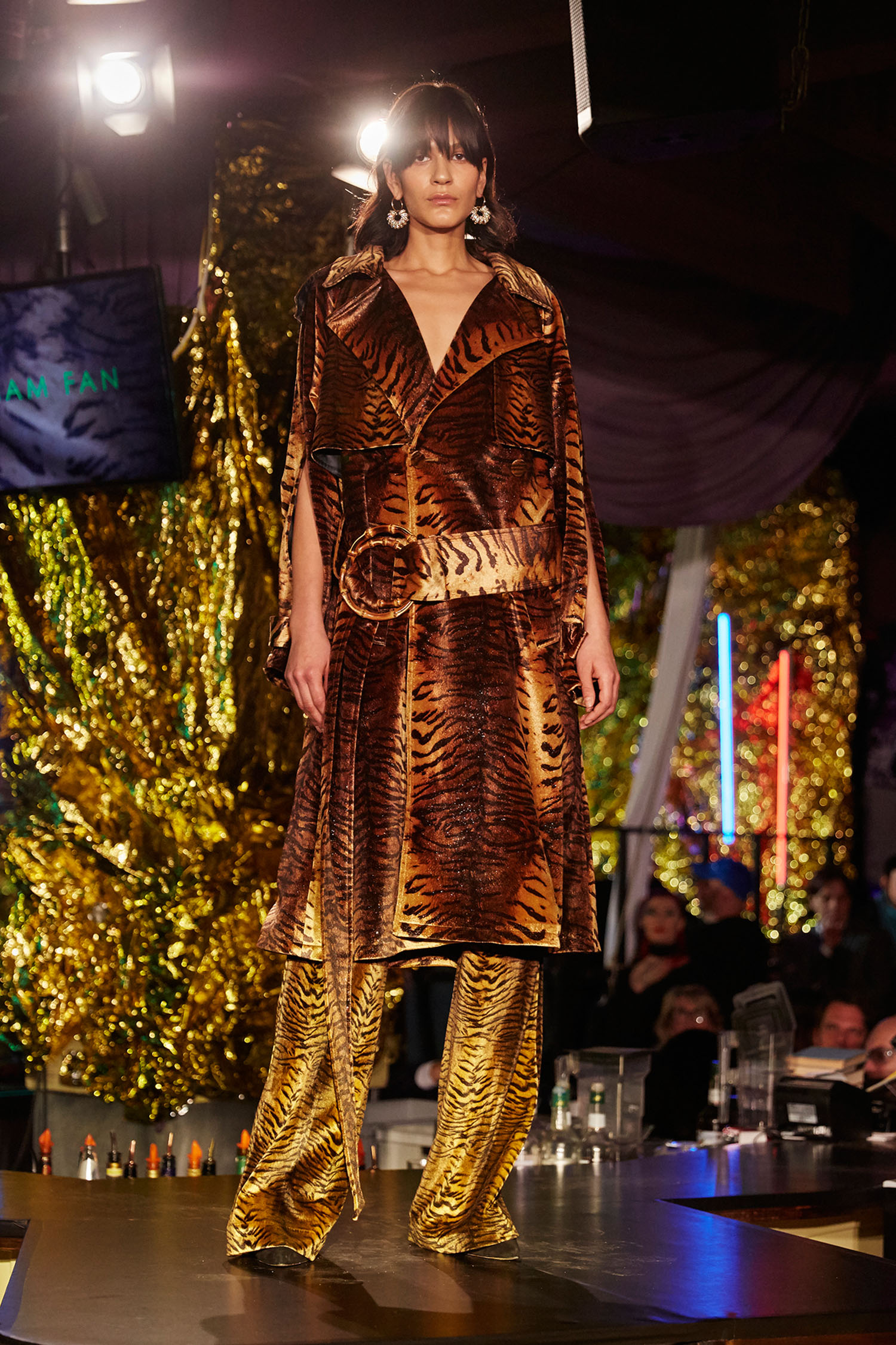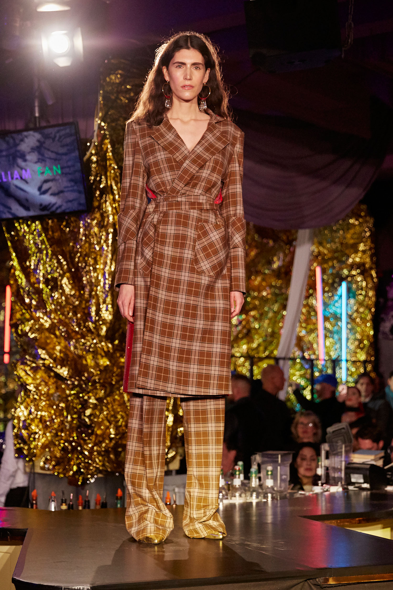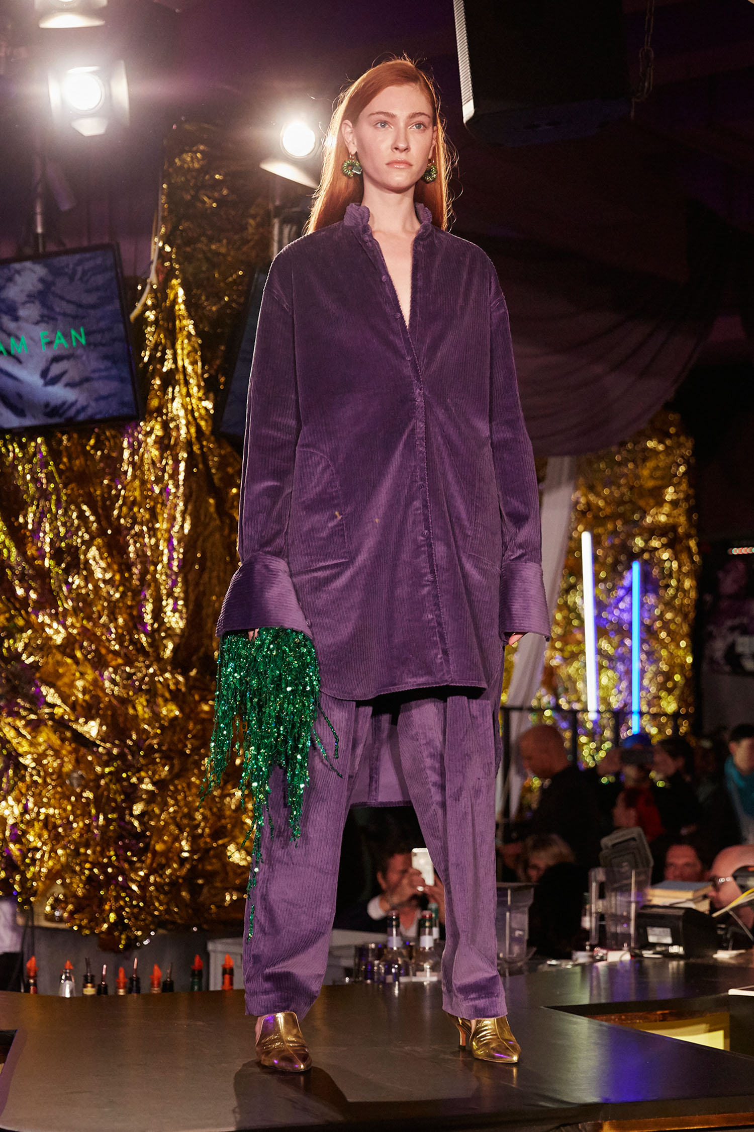 Animal Prints, laute und bunte Farben, effektreiche Texturen, die im Licht der Spiegelkugel reflektieren, treffen auf ruhige Silhouetten, klassische Schnitte und Materialien wie Cord. Die bekannten Trenchcoats von WILLIAM FAN sind neu aufgelegt in puderorsanem Paillettenstoff oder Tiger-Optik, sie erinnern an die Looks von Ikonen, die wir von der Showbühne kennen. Ebenso haben die vertrauten Town Heels eine Oberfläche aus Flieder erhalten und stehen zudem auf Kitten-Absätzen auf der Tanzfläche. Für die Fall/Winter 2019 erstellt WILLIAM FAN ebenso erstmals Ankleboots im Materialmix, raffinierte Zopfstrickpullover, Schlangen-Prints, Mohair-Cardigans und breite Gürtel für die Taille, sowie vermehrt Cocktailkleider mit einer femininen Silhouette. |