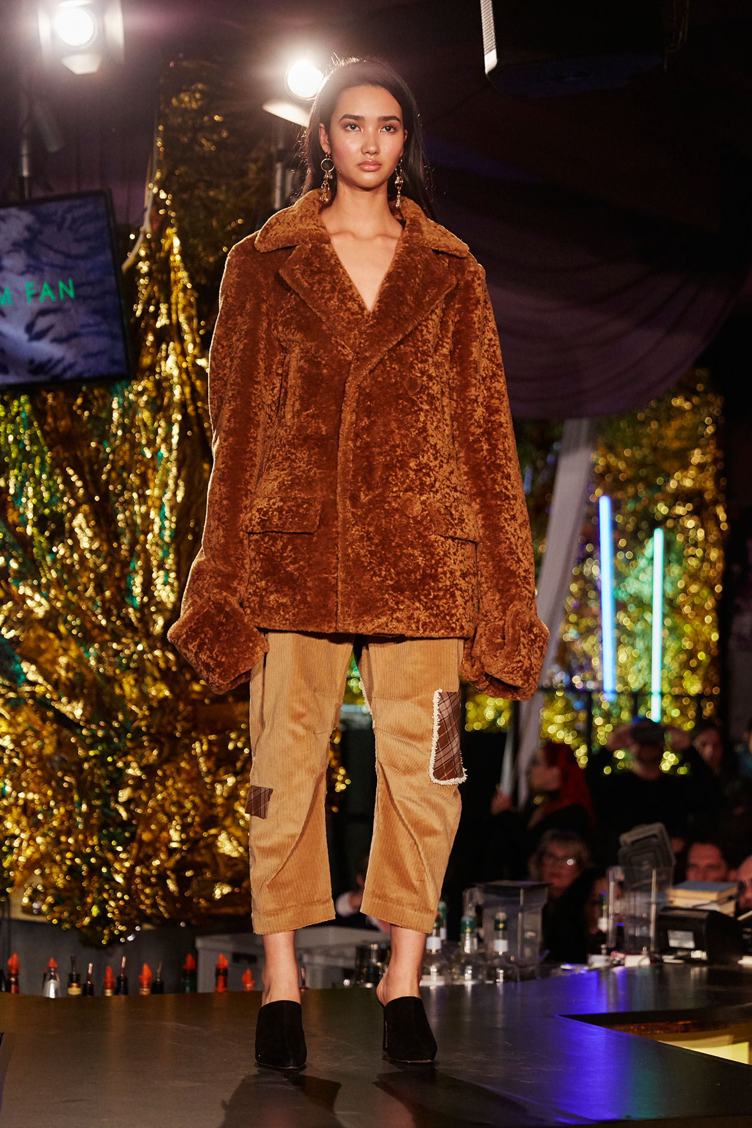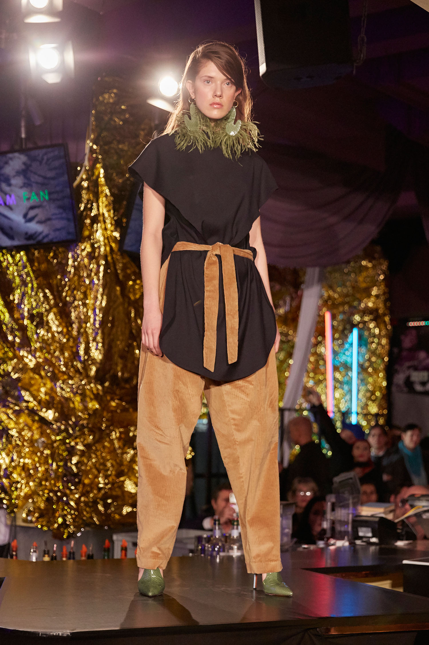 In der Karaoke Bar Knutschfleck am Alexanderplatz, im Epizentrum des Tourismus‘ sozusagen, wurden wir eingeladen, in ein anderes Ich zu schlüpfen, ins Nachtleben abzutauchen und bei Playback alles zu geben: Den Moment auszuleben, frei zu sein und loszulassen. Bevor es aber für uns soweit war, wechselten FANs Models ihre Rolle und hüllten sich in üppige Cordkreationen, schimmernde Paillettenroben, Animalprints, neuaufgelegte Klassiker und Kompositionen, die FANs Ying & Yang Attitüde perfekt unterstreichen sollten und beides wahren: Vorne Casual hinten Party.