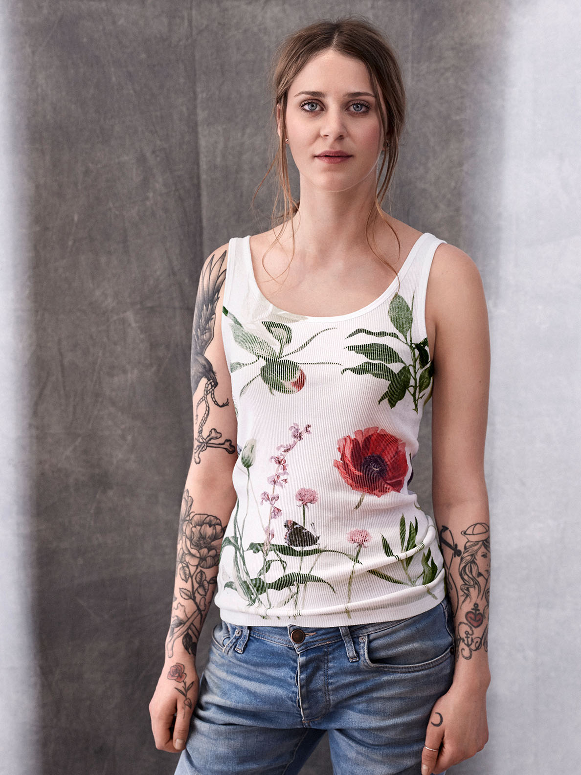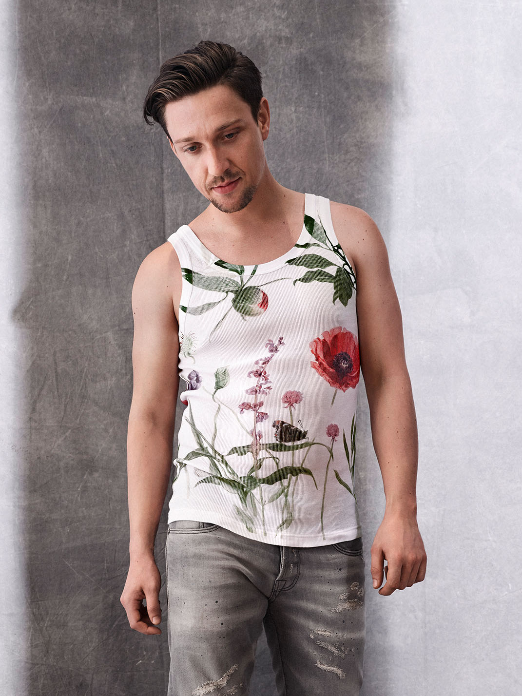 Der Doppelripp dient als Leinwand für eine außergewöhnliche, sommerliche Interpretation der Tank Top-Legende: Inspiriert von heimischen Wiesen und Wäldern hat der in der Schiesser-Heimatstadt Radolfzell lebende Künstler, Christian Dierks, jedes Blatt, jede Blüte, alle Gräser, jeden Schmetterling handgezeichnet. Diese ausgefallene Komposition aus Farben und Formen wird in einem besonderen Direktdruckverfahren von einem auf der Schwäbischen Alb ansässigen Spezialisten mit viel Detailtreue fotorealistisch auf den Tank Tops umgesetzt.