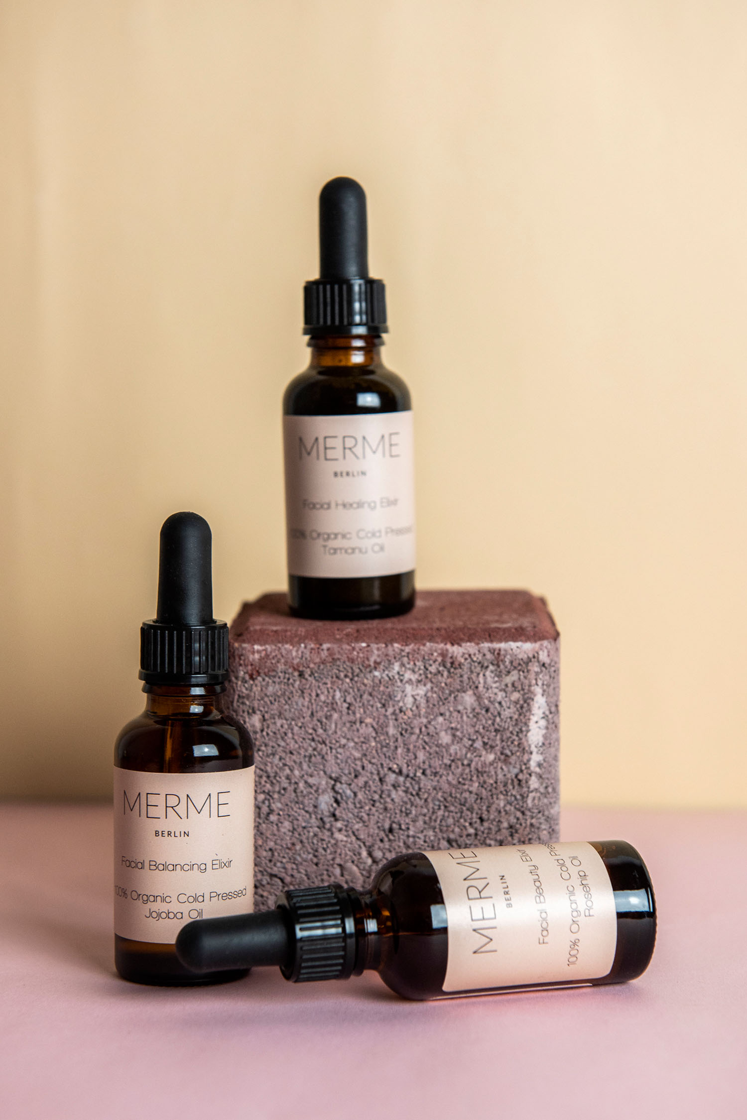 Die drei Gesichtsöle von Merme sind wie eine warme Dusche für verspannte Muskeln, denn sie entspannen die Haut. Ich verwende sie am liebsten am Abend und genieße das einmassieren ins Gesicht – besonders, wenn die Haut noch leicht feucht ist, ziehen die Öle blitzschnell ein. Das Facial Balancing Elixir ist ein kaltgepresstes Jojobaöl, es zieht in die tieferen Hautschichten ein und bringt hier die Talgproduktion wieder ins Gleichgewicht. Als ich das Facial Healing Elixir Fläschchen zum ersten Mal geöffnet habe, dachte ich zwar zunächst, das Öl sei schlecht geworden, denn tatsächlich sieht es ein wenig nach Moos aus, das sich in Wasser gelöst hat und sich nun zur Glibbermasse formatiert hat. Haha! Nach dem sich dieser Irrtum allerdings aufgeklärt hatte, ist es zu meinem Favoriten der drei Elixire geworden! Kaltgepresstes Tamanuöl regt die Zellerneurungen an und ist optimal geeignet für sehr empfindliche und problematische Hauttypen. Das letzte Öl im Bunde ist das Facial Beauty Elixir, das aus Hagebuttenöl besteht und die natürliche Kollagenproduktion anregt und erste Falten reduziert. Alle Öle sind Power-Öle, die mit Vitamin A, E, C, und D sowie Omega-Fettsäuren versetzt sind.