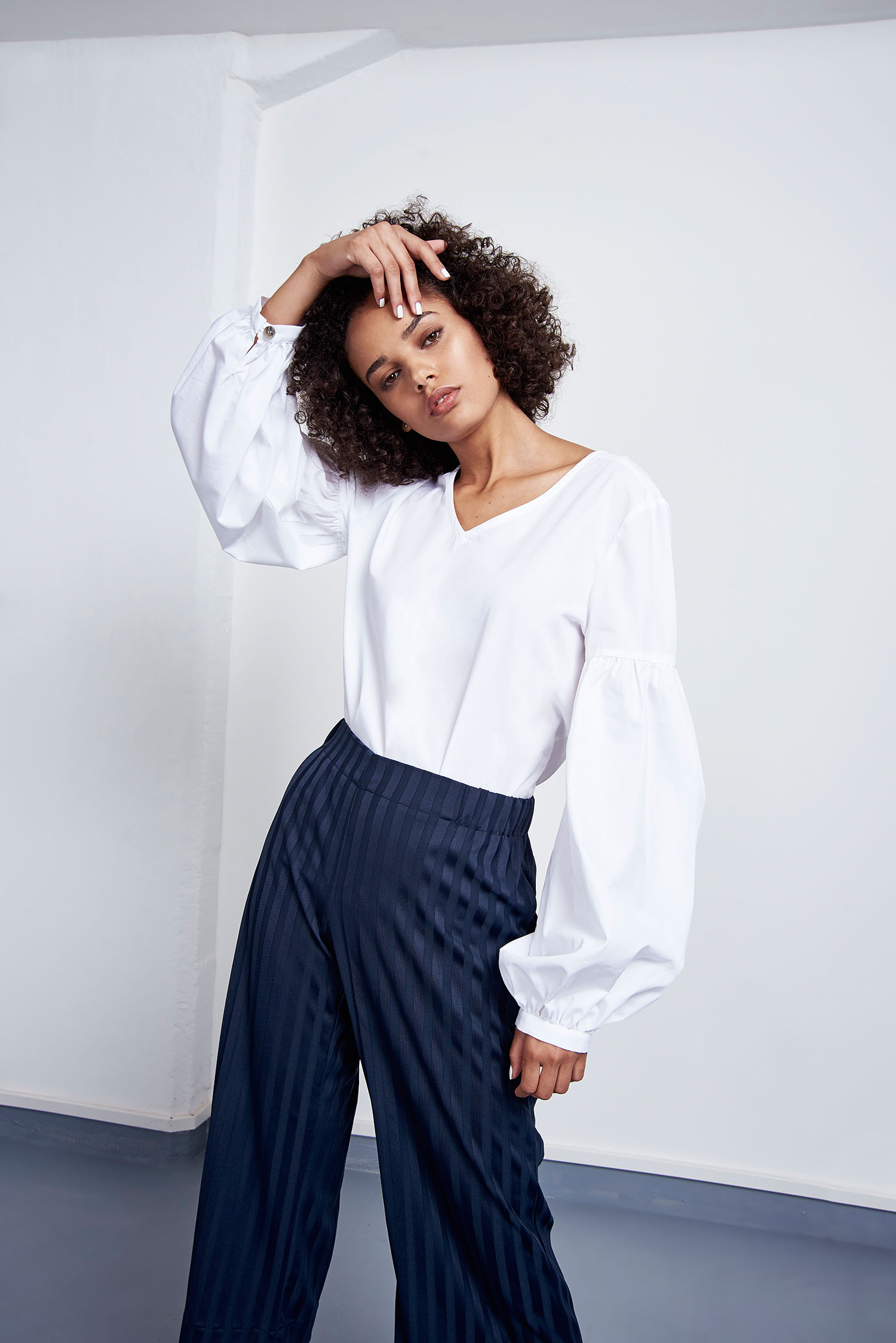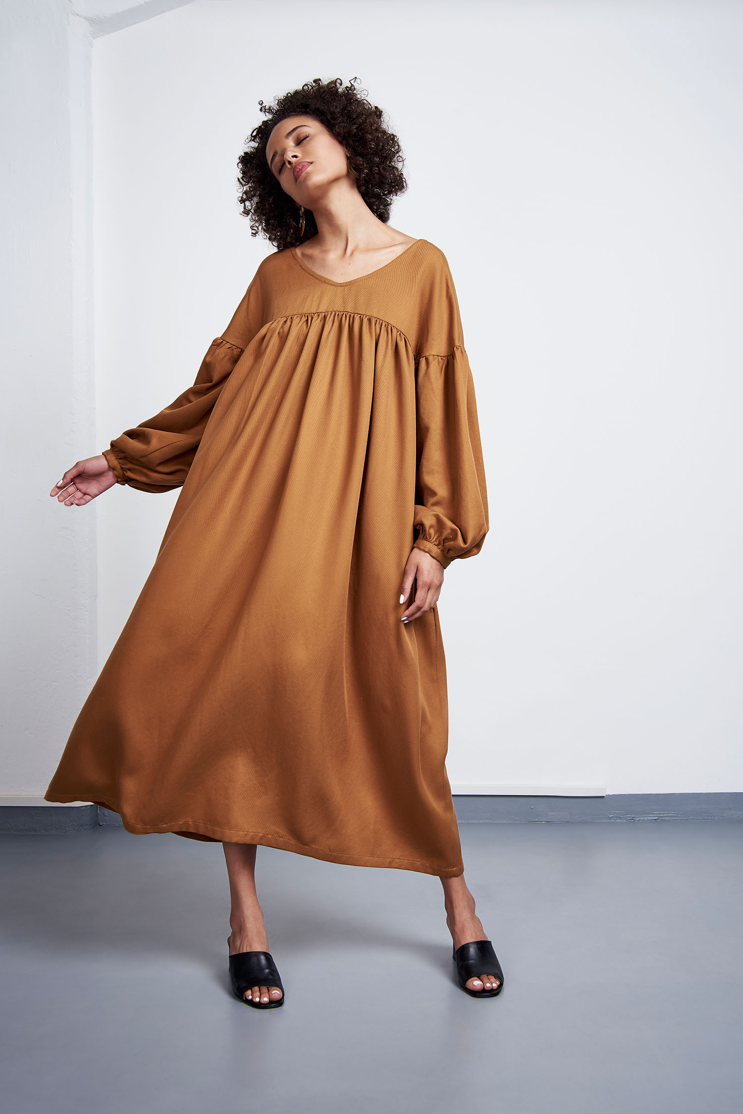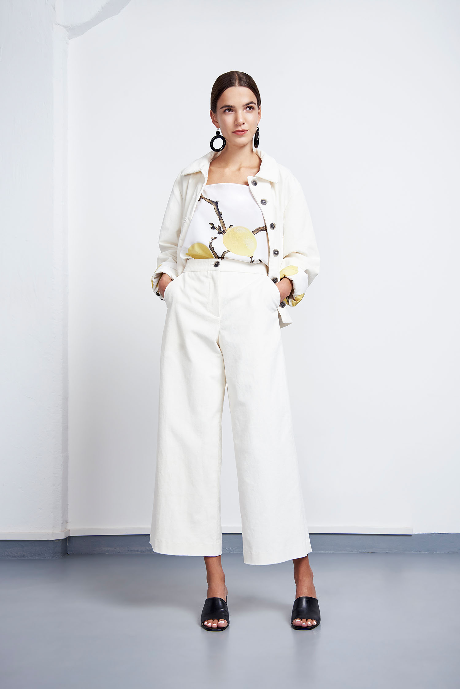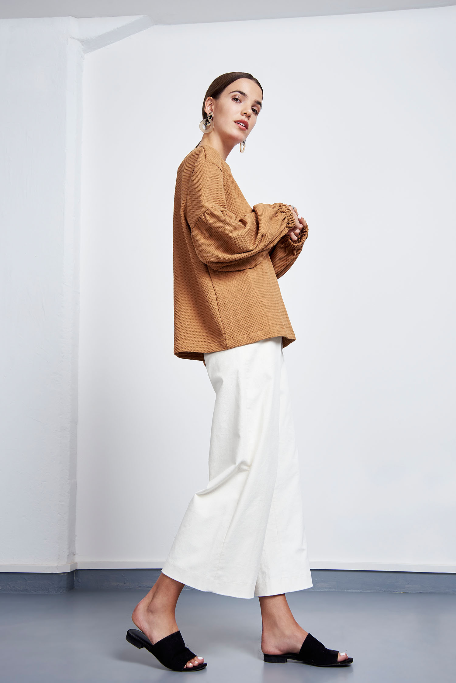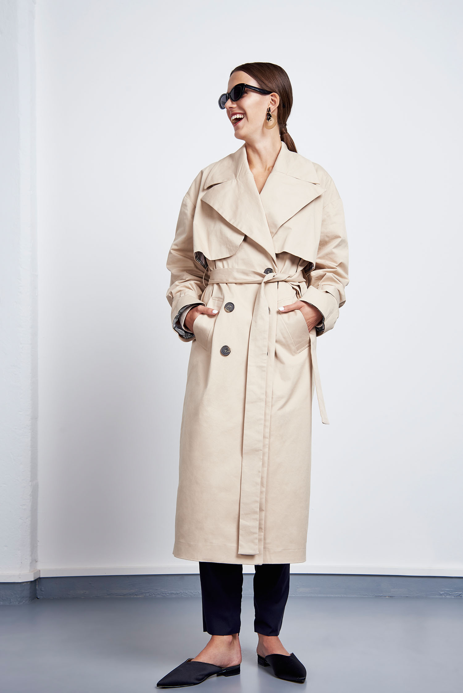 Zitronenprint, fließende Materialien und leichte, feminine Schnitte: Es kamen vorwiegend helle Farben wie cognac, weiß und gelb zum Einsatz. Dennoch finden sich dazwischen auch zarte Fliedertöne und ein elektrisierendes Blau. Die verwendeten Materialen weisen spannende Oberflächenstrukturen auf, so wie zum Beispiel ein gekreppter Tencel®, ein Recyclingpolyester Strick und ein Waffleknit aus Recyclingbaumwolle. Die Preisspanne von JAN ’N JUNE liegt zwischen 38€ für ein Oberteil und 260€ für einen Trenchcoat.