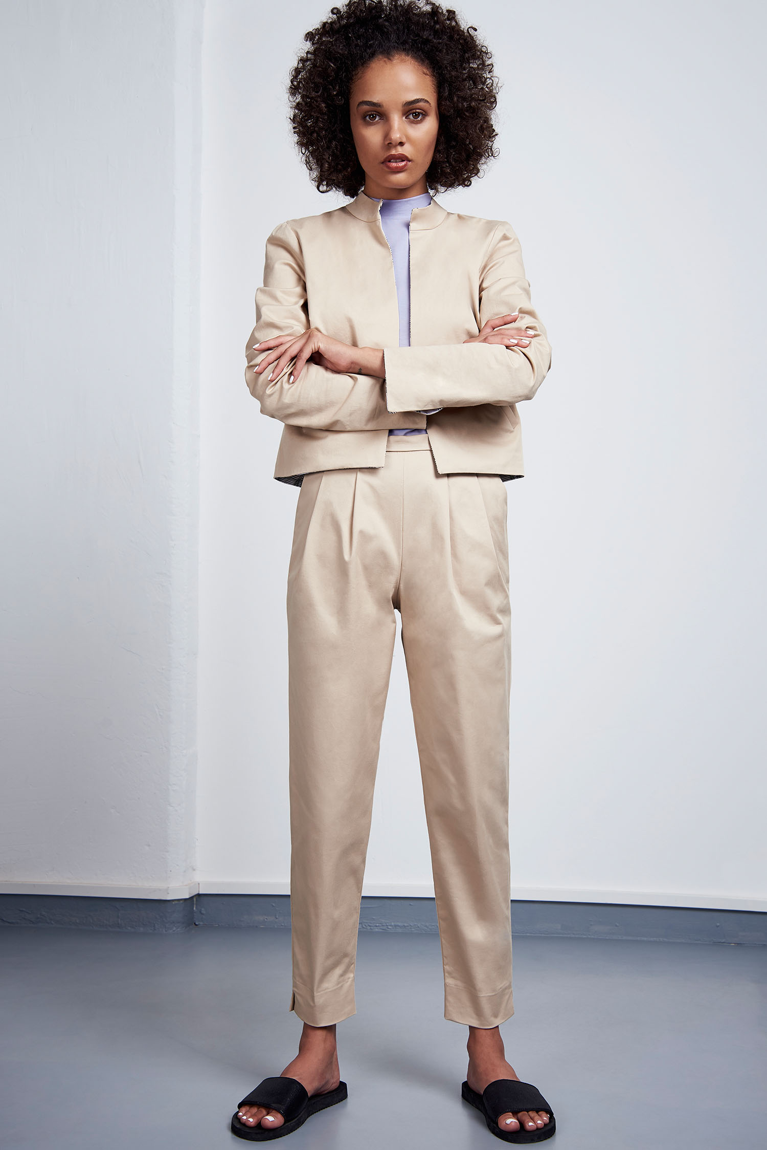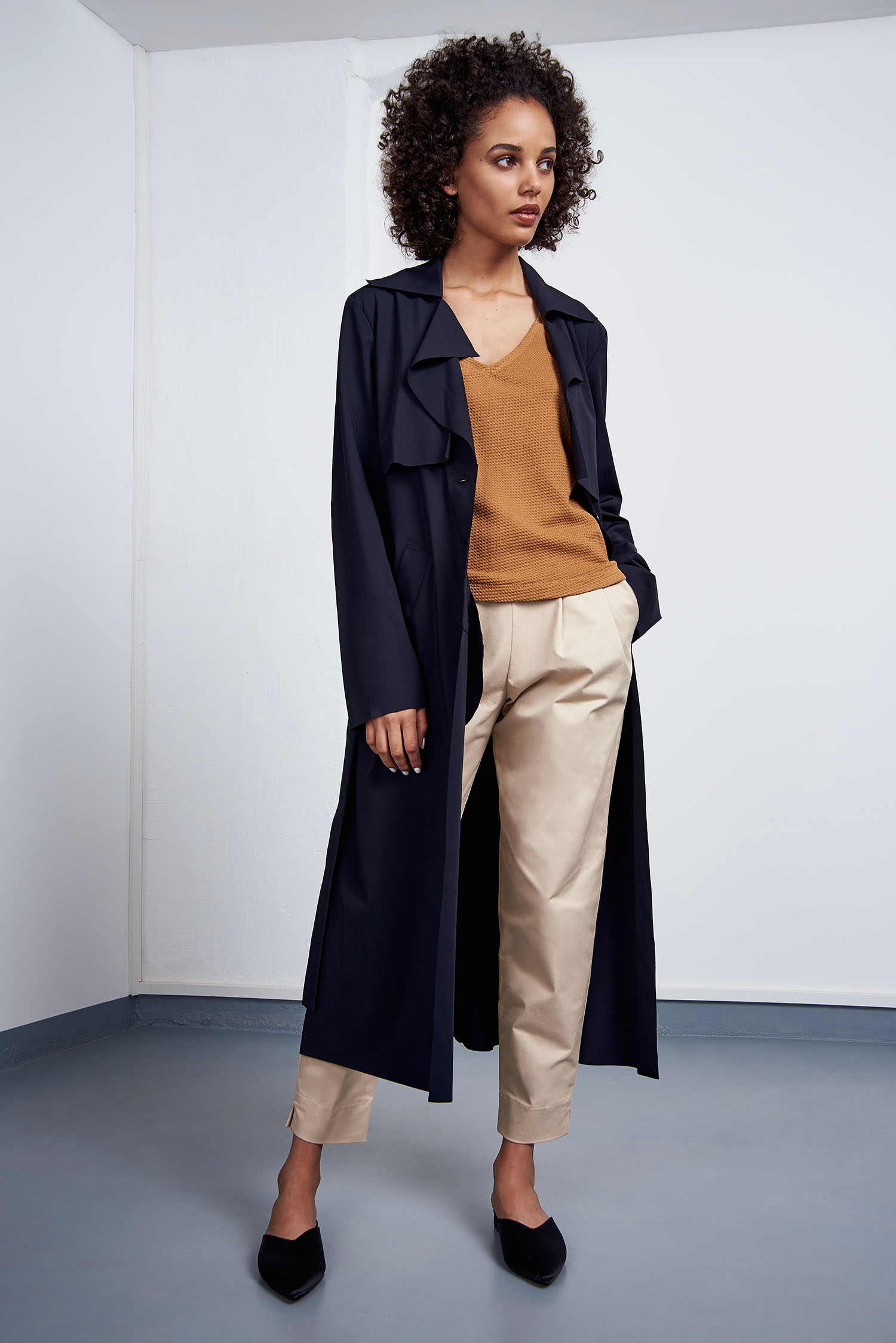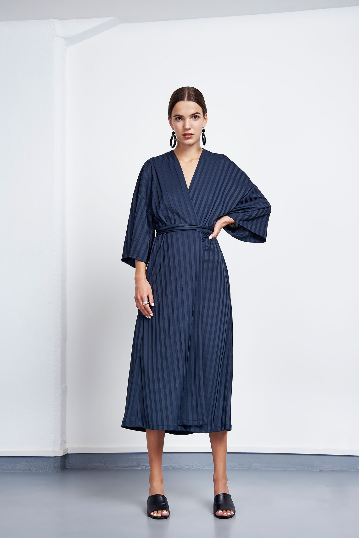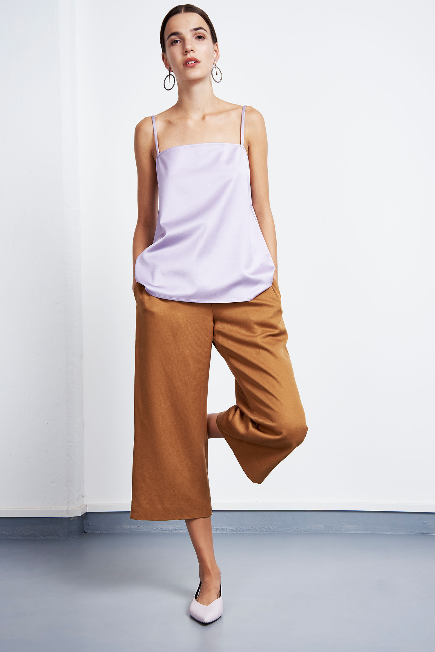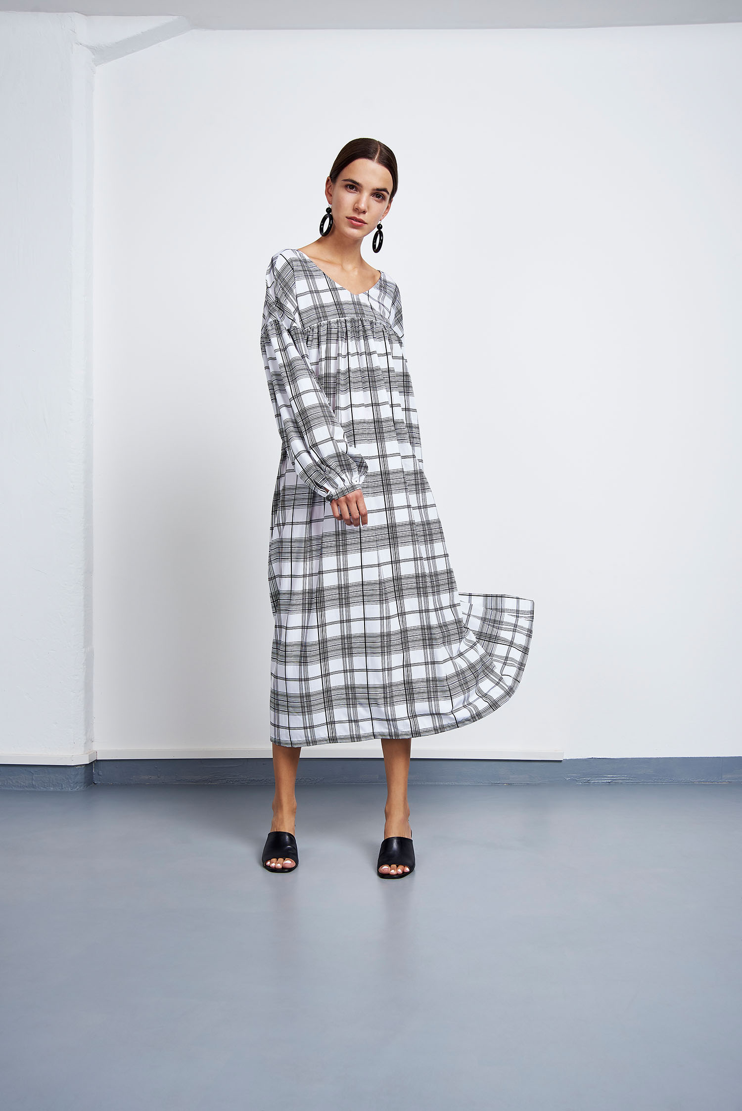 Zitronenprint, fließende Materialien und leichte, feminine Schnitte: Es kamen vorwiegend helle Farben wie cognac, weiß und gelb zum Einsatz. Dennoch finden sich dazwischen auch zarte Fliedertöne und ein elektrisierendes Blau. Die verwendeten Materialen weisen spannende Oberflächenstrukturen auf, so wie zum Beispiel ein gekreppter Tencel®, ein Recyclingpolyester Strick und ein Waffleknit aus Recyclingbaumwolle. Die Preisspanne von JAN ’N JUNE liegt zwischen 38€ für ein Oberteil und 260€ für einen Trenchcoat.