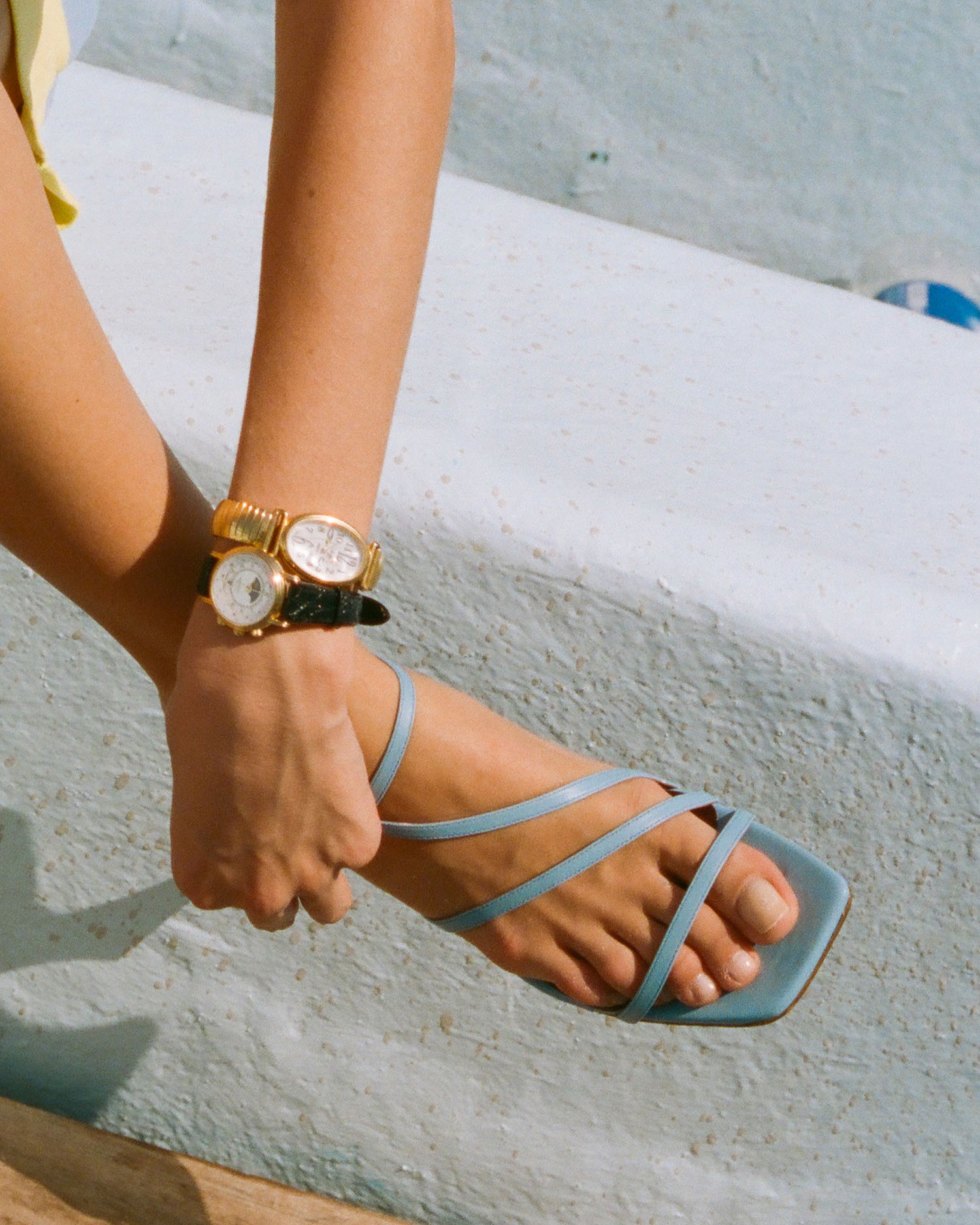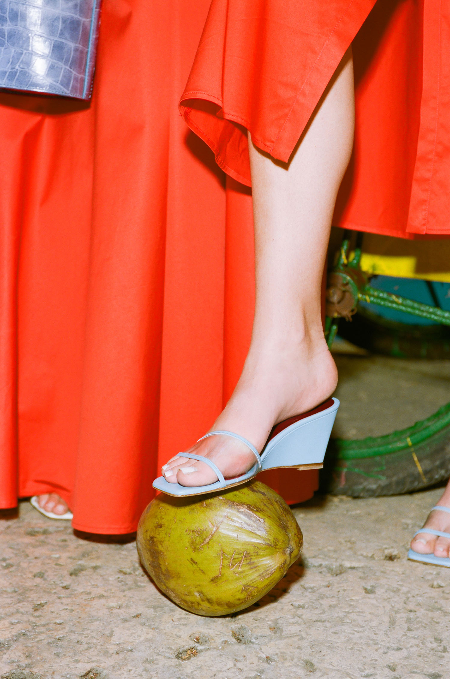 Ganz neu im Staud-Universum? Schuhe! Wie bereits oben erwähnt dreht sich alles um den Keil-Absatz und um zarte Sandalen mit Schnürriehmen – aber auch der klassische FlipFlop wird bei Staud zum Anlass genommen, um ein Schläppchen zu lancieren, dass sich deutlich von der Badeschlappe abhebt und trotzdem den Charakter der Zehensandale bewahrt.