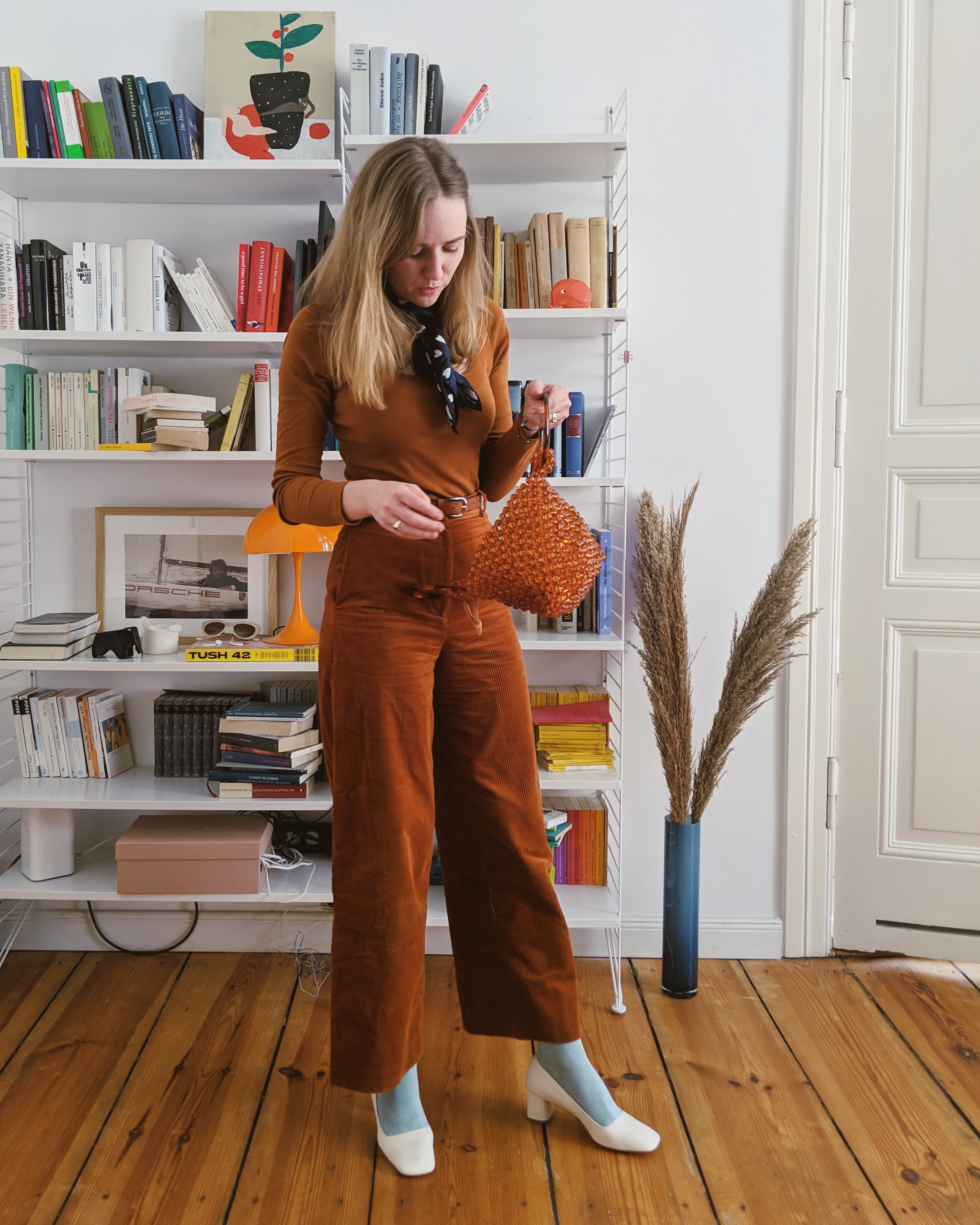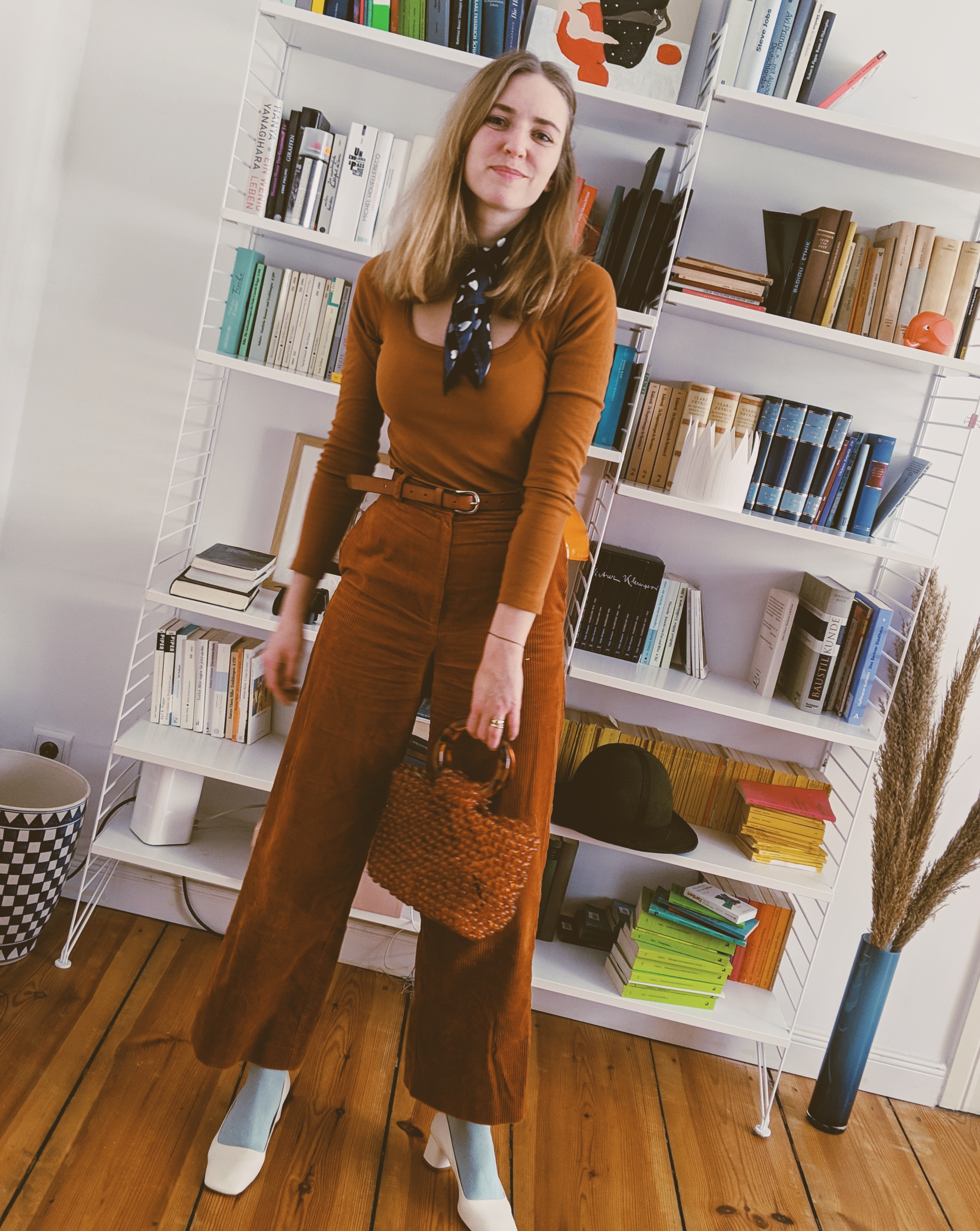 Wenn man feststellt, dass die Lieblingsfarbe aus dem Herbst, auch die Lieblingsfarbe des Frühlings ist: Kastanienbraun! Funktioniert in Kombination mit dunklem Blau und Weiß doch erstaunlich gut, oder? Und weil ich nicht warten konnte, bis die neuen aeyde–Pumps mit Carré-Ausschnitt ausgeführt werden können, wurden sie kurzerhand mit hellblauen Socken kombiniert. Mache ich viel zu selten, sollte aber definitiv öfter ausgeführt werden.