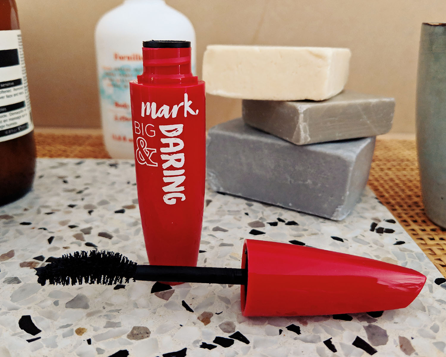 Und genau dann greife ich seit neuestem zu Mark Darings Big & Daring Mascara, die allein schon durch ihr dramatisches Bürstchen imponiert. Und Drama kann hier wirklich groß geschrieben werden: Ein bisschen verklebt (aber in schön), ganz schön üppig und definitiv voluminös kommt das Endergebnis daher. Wem Schwarz zu krass ist, dem empfehle ich einen dunklen Braunton. Den gibt es hier nämlich auch!