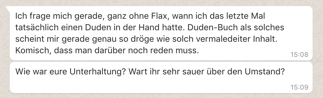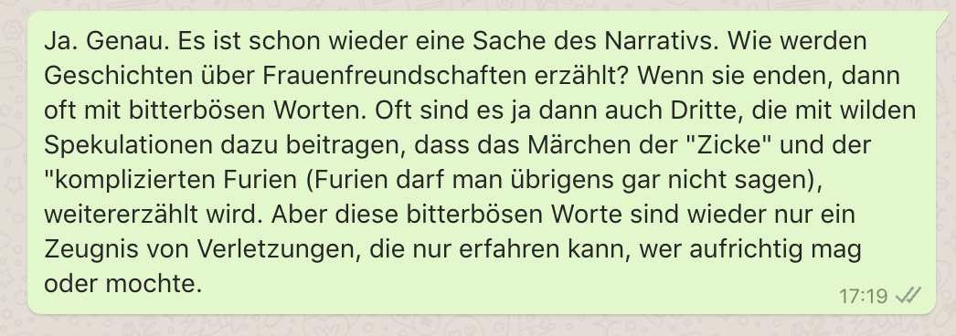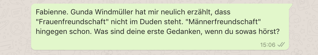 N: Über die heutige Relevanz des Dudens habe ich womöglich noch nie in meinem ganzen Leben nachgedacht und deshalb verstehe ich, was du sagen willst. Aber: Es ist immerhin der Duden! Bei mir gingen da die Alarmglocken an – so ganz egal ist das ja nicht, diese Leerstelle muss schließlich irgendeinen Ursprung haben. Erst im vergangenen Jahr war ich doch außerdem positiv überrascht über den „Richtig Gendern“-Band vom Duden Verlag gewesen, immerhin! Aber zurück zur Unterhaltung mit Gunda: Wir haben, wenn ich mich rech erinnere, vor Fassungslosigkeit erstmal gelacht. Das Lachen blieb mir Zuhause aber im Halse stecken. Da habe ich dann nämlich tatsächlich angefangen, ernsthaft darüber nachzudenken, ob da was dran sein könnte. Dass es sowas wie echte, aber vor allem ehrliche Frauenfreundschaft nicht gibt. Oder zumindest, ob „Männerfreundschaft“ wirklich etwas ganz anderes bezeichnet. Halt mich für übergeschnappt, aber ich meine diese beiden Fragen tatsächlich ernst, es fällt mir nur schwer, die verknoteten Gedanken in Worte zu fassen. Hilfe, Fabienne.