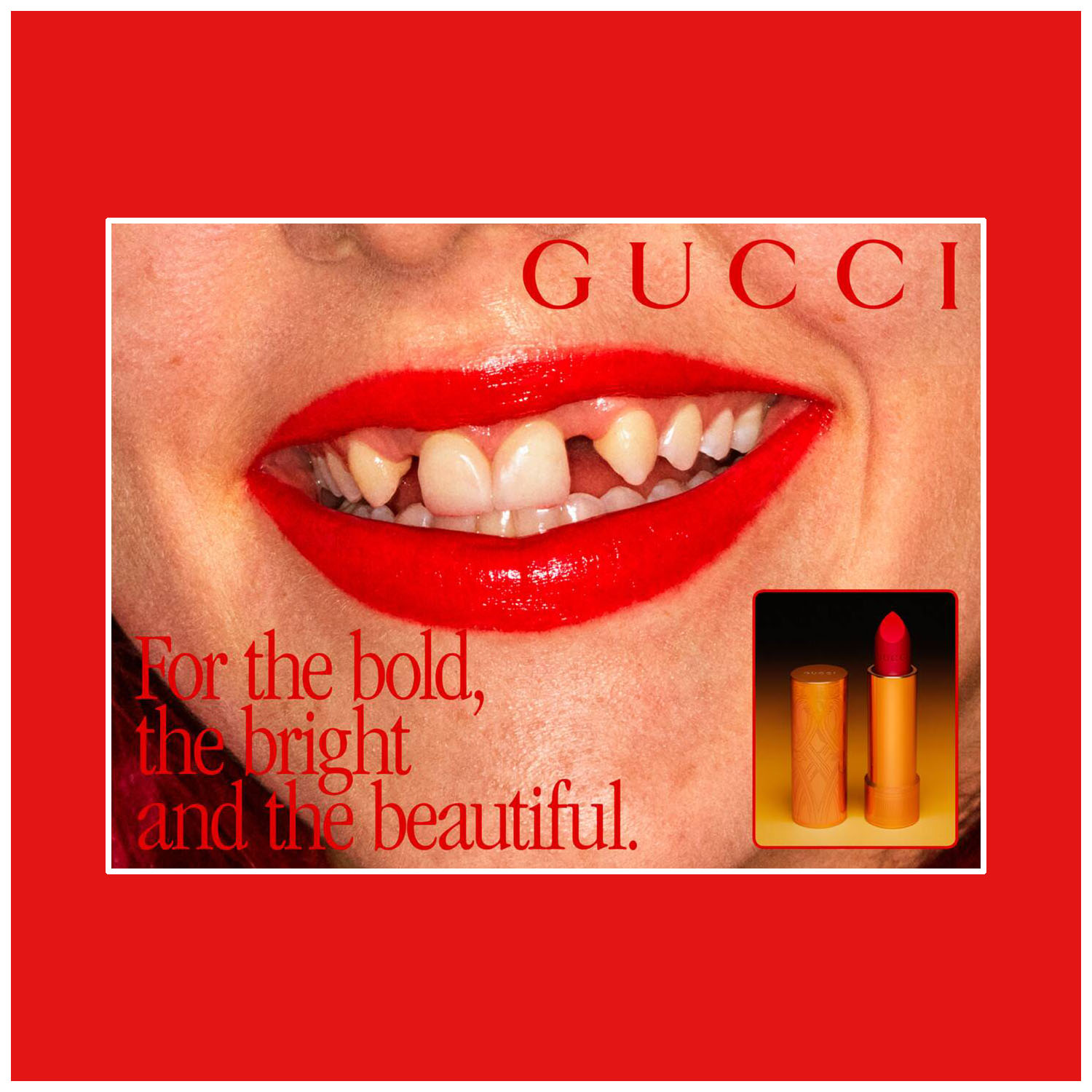 Kaia Gerber, Toni Garrn und natürlich all die Supermodels der 90er Jahre gelten in der Modewelt als vollkommen, verkörpern sie doch jene Schönheitsideale, die zuweilen als „klassisch“ bezeichnet werden und mit denen so viele von uns aufgewachsen sind. In heutigen Modekampagnen sind geschwungene Lippen, wallendes Haar, glatte Haut und ein Lächeln, das die geraden, weißen Zähne freilegt, noch immer die Norm. Wohl gerade deshalb wirkte die neue Gucci Beauty Kampagne, die am vergangenen Wochenende gelauncht wurde, wie ein nahezu schon befreiender Paukenschlag: Neben den drei Models Ellia Sophia Coggins, Achok Majak und Mae Lapres ziert auch die Frontsängerin Danni Miller der Punkband Surfbort die Kampagne. Stand sie für die Gucci Pre Fall 2019 Kampagne noch mit ihren restlichen Bandmitgliedern vor der Kamera, ist es dieses Mal ihr Mund samt markanter Zahnlücken dank fehlender Schneidezähne, der auf einem der Bilder prangt und die Aufmerksamkeit so vieler auf sich zieht. Er fällt auf, weicht von den Idealen ab, die wir sonst so aus dem Mode- und Beautykosmos gewohnt sind – und ist wohl gerade deshalb so erfrischend schön, weil er so ehrlich ist.