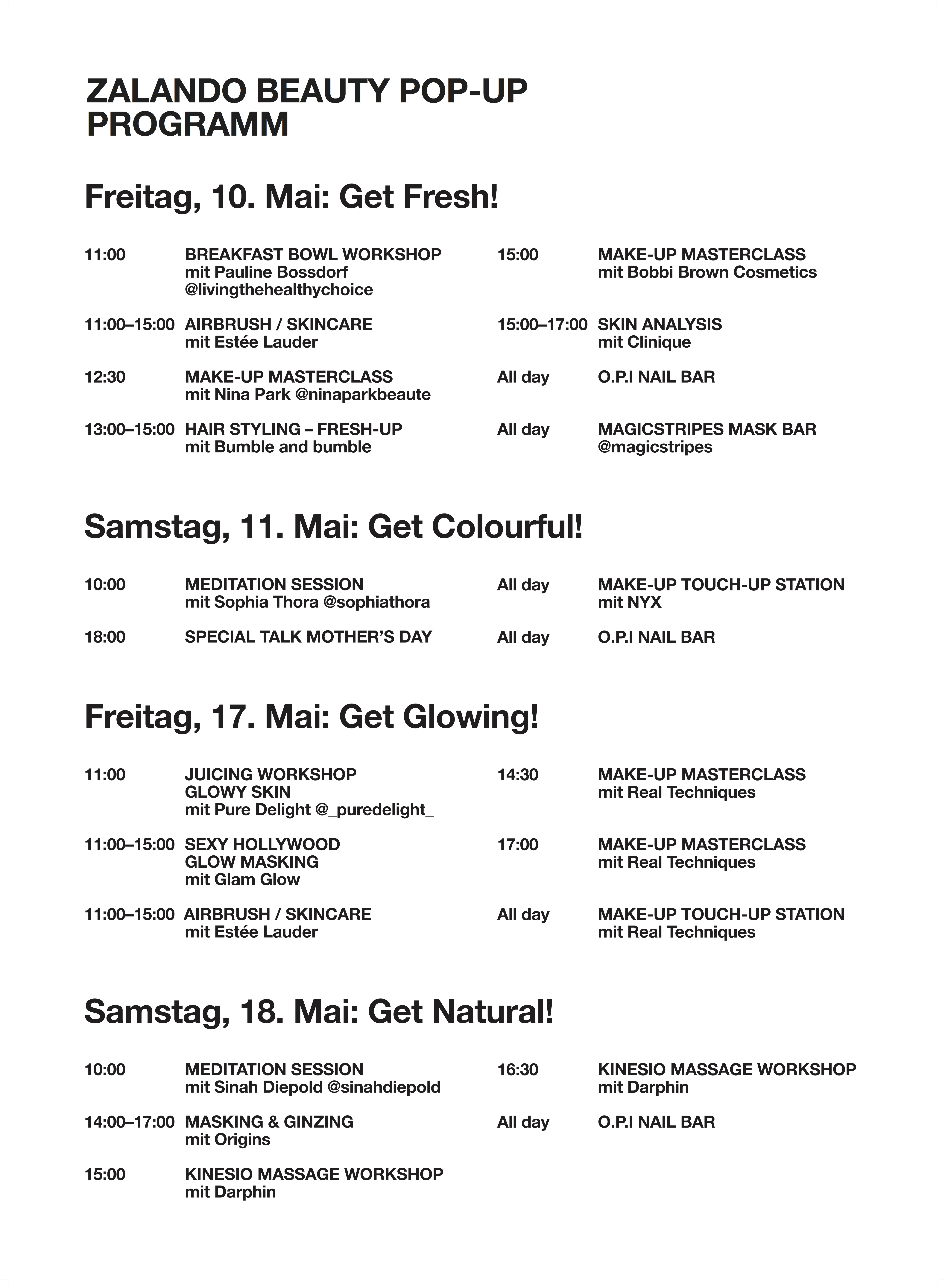 Ab Freitag wird der Store wieder für euch geöffnet sein (17. & 18.5.), um euch die verschiedensten Themenwelten wie Get Coloful!, Get Fresh! oder Get Glowing! näher zu bringen. Beauty-Profis versorgen euch in speziellen Treatments, Workshops und Masterclasses natürlich mit den richtigen Techniken und den passenden Produkte. Vorbeischauen ist also absolut empfohlen!