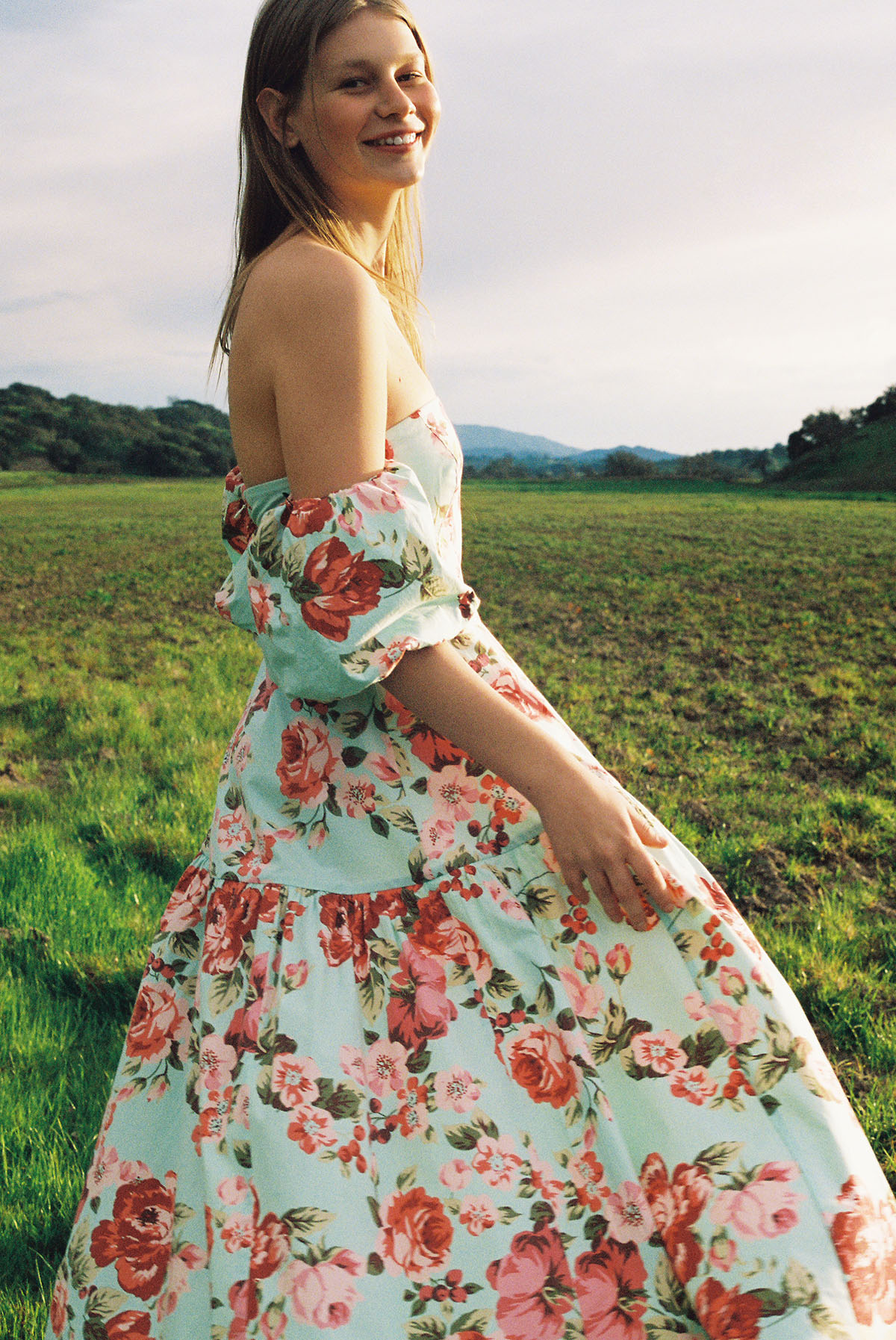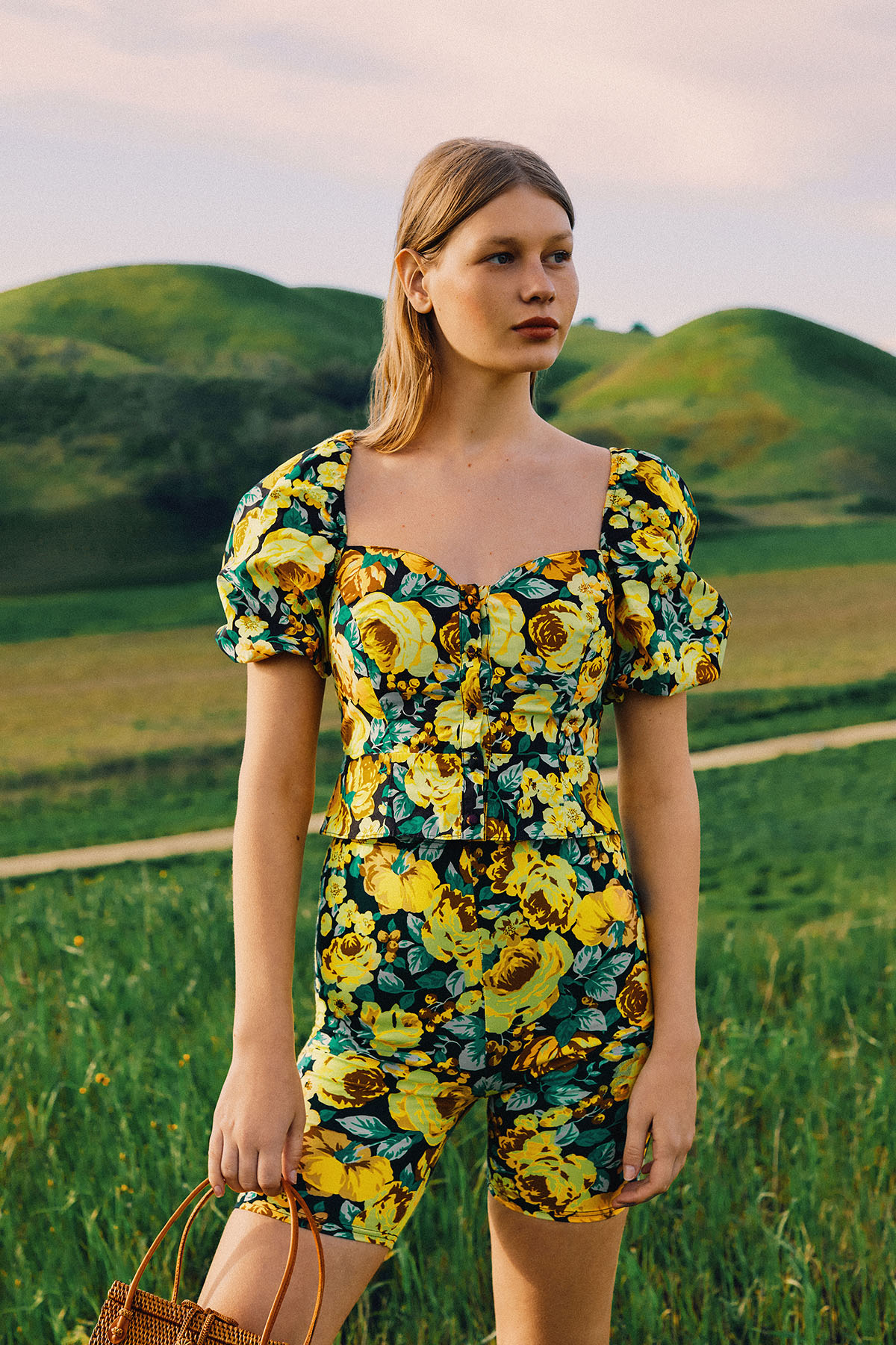 Die Kollektion lebt von der Kombination von romantischer Details und aufwendiger Prints mit denen Laura gekonnt den Geist der vergangenen Jahrzehnte transportiert. Das Spiel mit floralen Mustern und zarten Applikationen zeigt sich in Kleidern mit Puffärmeln, Blusen mit Volants oder eleganten Zweiteilern. Die Farbpalette in einem Mix aus Pastell- und Knallfarben wie Hellblau, Rosa, Gelb und Grün ist eine Ode an die imposanten Kleider der Barockzeit. Highlights der Kooperation sind das Minikleid mit historischem Print und die Rüschenbluse die mit ihrer transparenten Look besonders sinnlich wirkt.