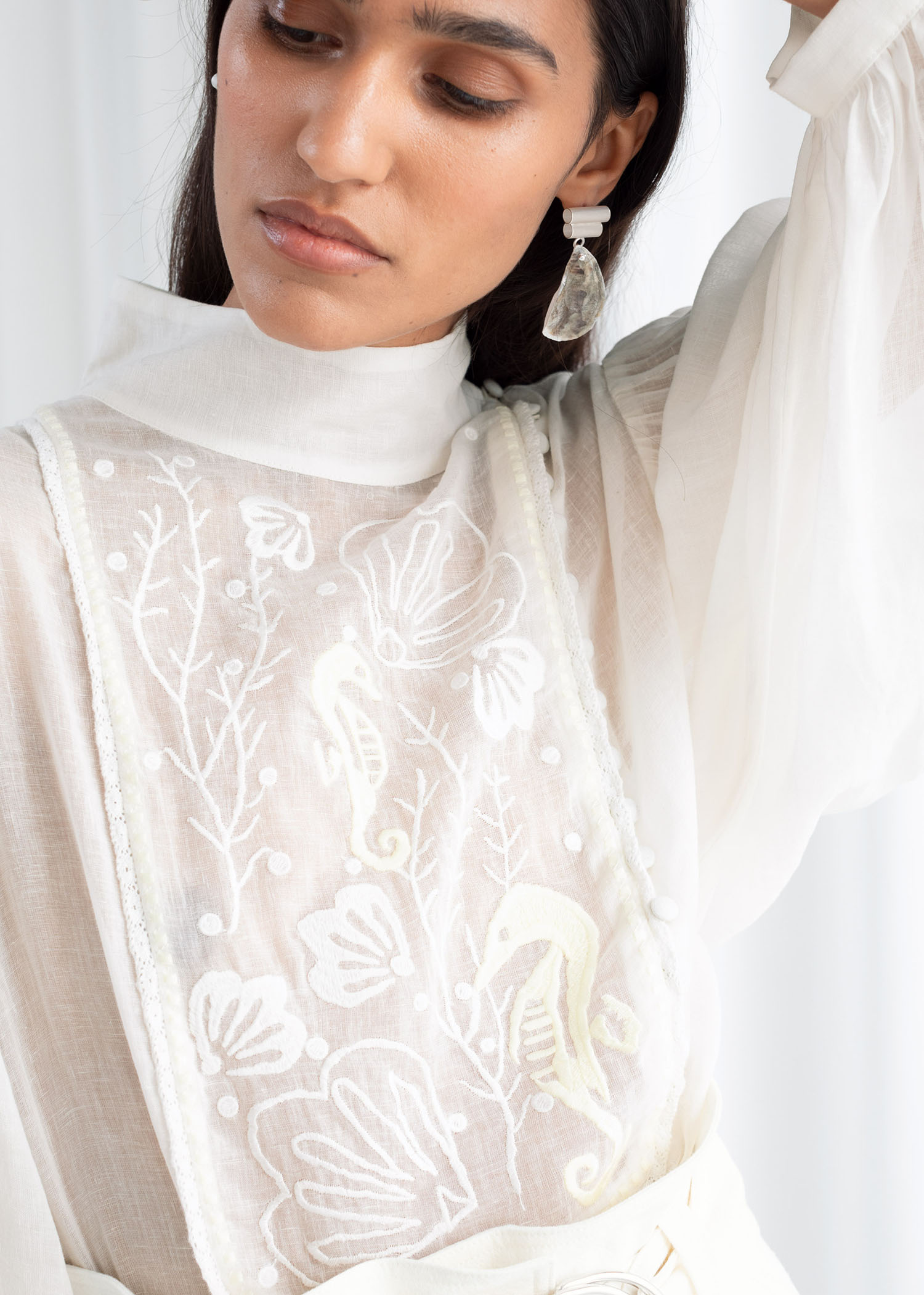 Als Ergänzung zu Mias Schmuckkollektion kreierte das Stockholm Design-Atelier von & Other Stories eine Ready-To-Wear- Kollektion, ebenfalls inspiriert von den Schätzen des Meeres. Die Kollektion spielt mit Tönen von Perlmutt, Weiß und Blau, und zeigt bestickte, ganz leichte Kleider, einen Overall und Blazer, eine Tunika, Tie-Dye Shorts und eine Denimjacke, die allesamt aus nachhaltigeren Materialien wie Tencel, Bio-Baumwolle und recyceltem Polyester bestehen.