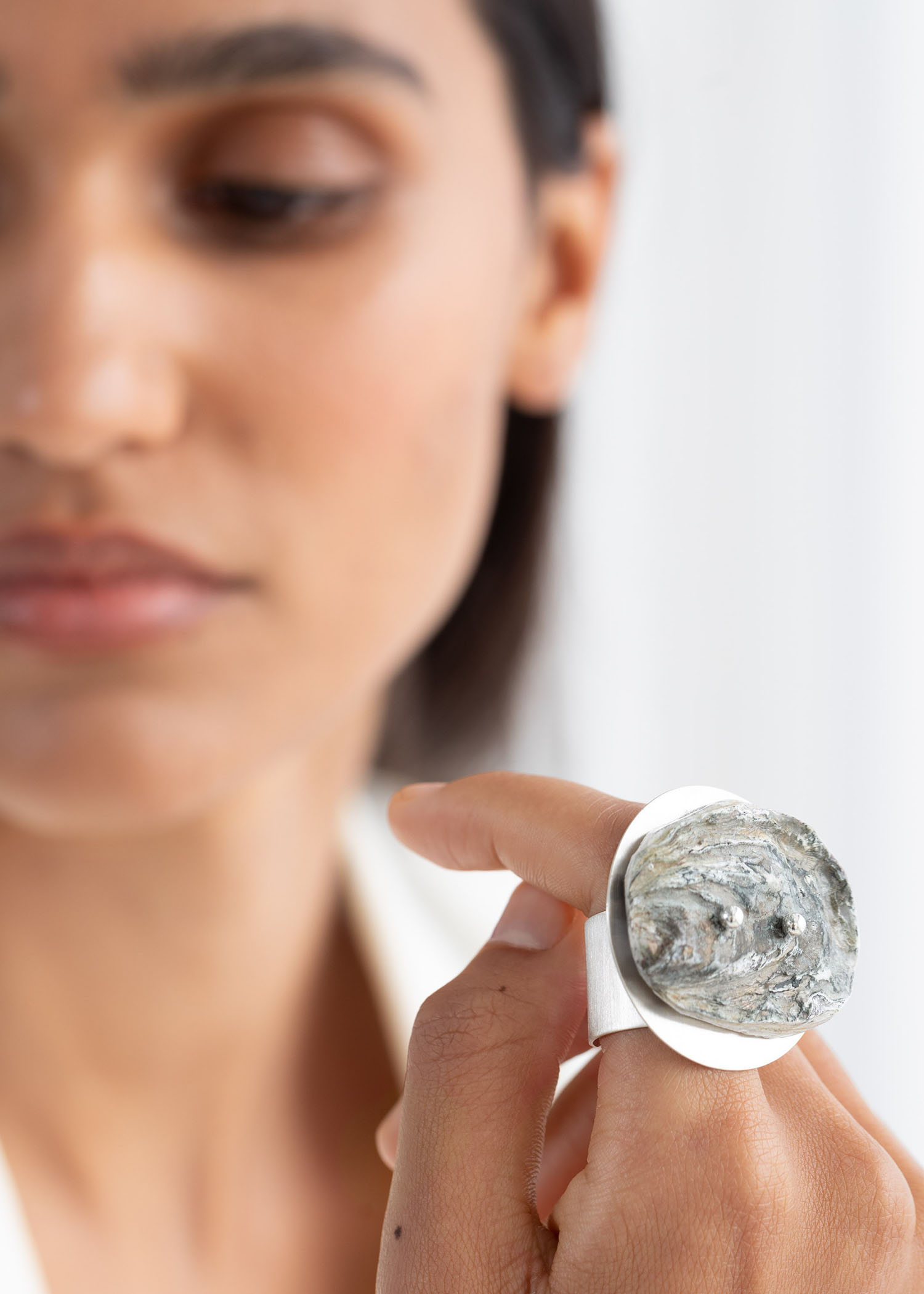 Und genau dafür zog Mia in Stockholm von Fischrestaurant zu Fischrestaurants, um die Austernschalen abzuholen, in ihrem Atelier zu reinigen und den Muscheln in einer stark limitierten und von Hand gestalteten Kollektion ein zweites Leben zu schenken. Veredelt wurden die natürlichen Materialien übrigens mit recyceltem Silber und daraus sind sieben Kreationen entstanden, darunter Ringe, Ohrringe, eine Haarklammer und eine Halskette, die wir euch heute nicht vorenthalten wollen.