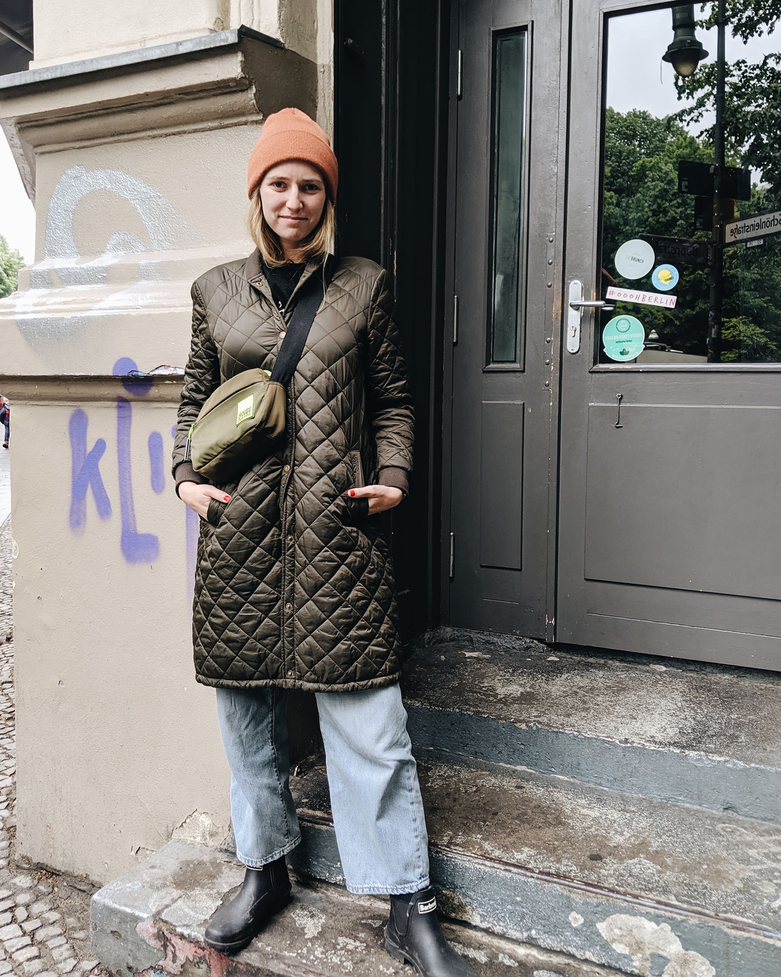 - Mütze von Weekday (ähnlich hier ), Mantel von Barbour, Hose von Levi’s (ähnlich hier ), Gummistiefel von Barbour, Tasche von Ganni