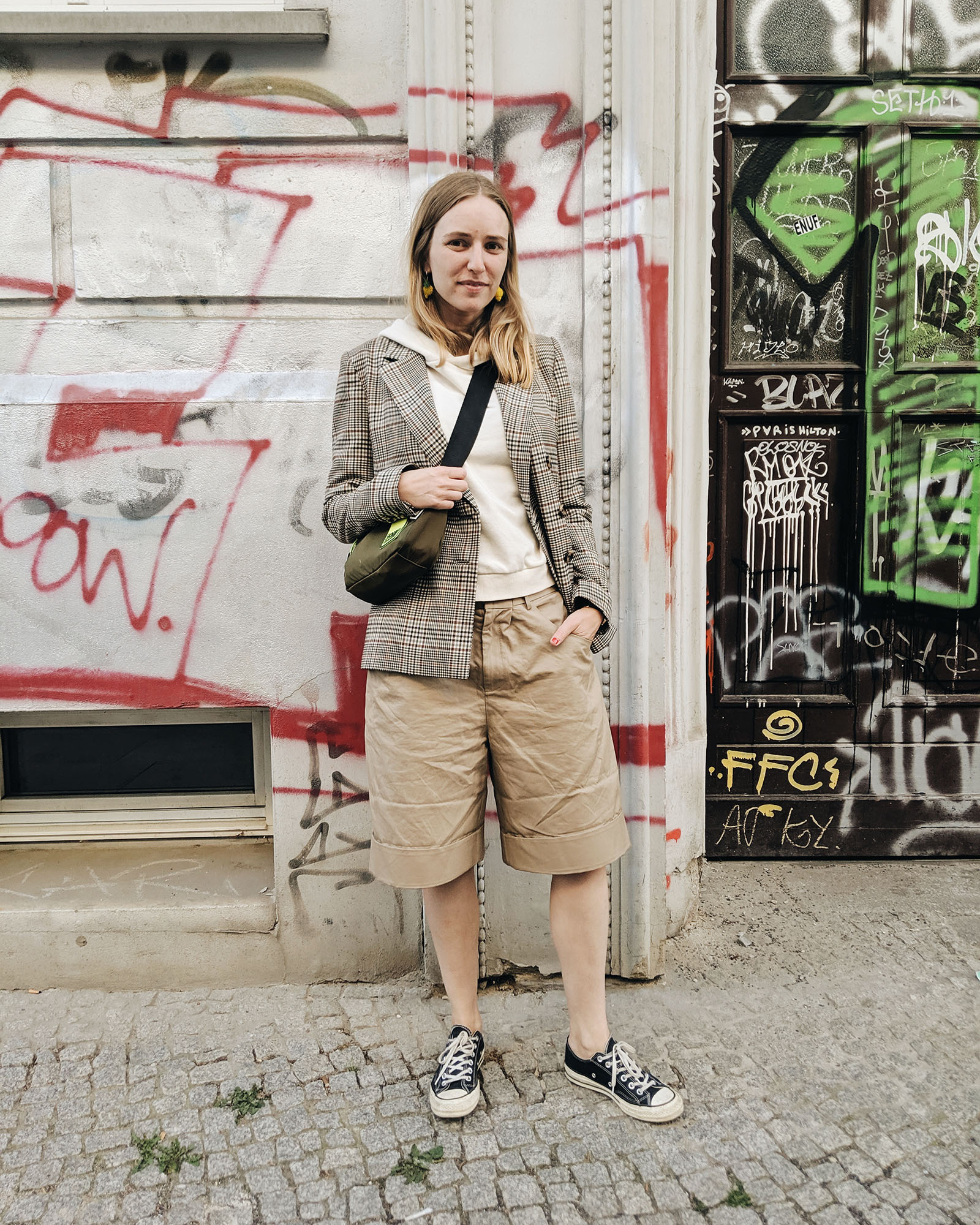- Blazer von & Other Stories (alt), Hoodie von Edited the Label, Hose von Acne Studios (alt), Schuhe von Converse, Tasche von Ganni, Ohrringe von Folkdays x Jane Wayne