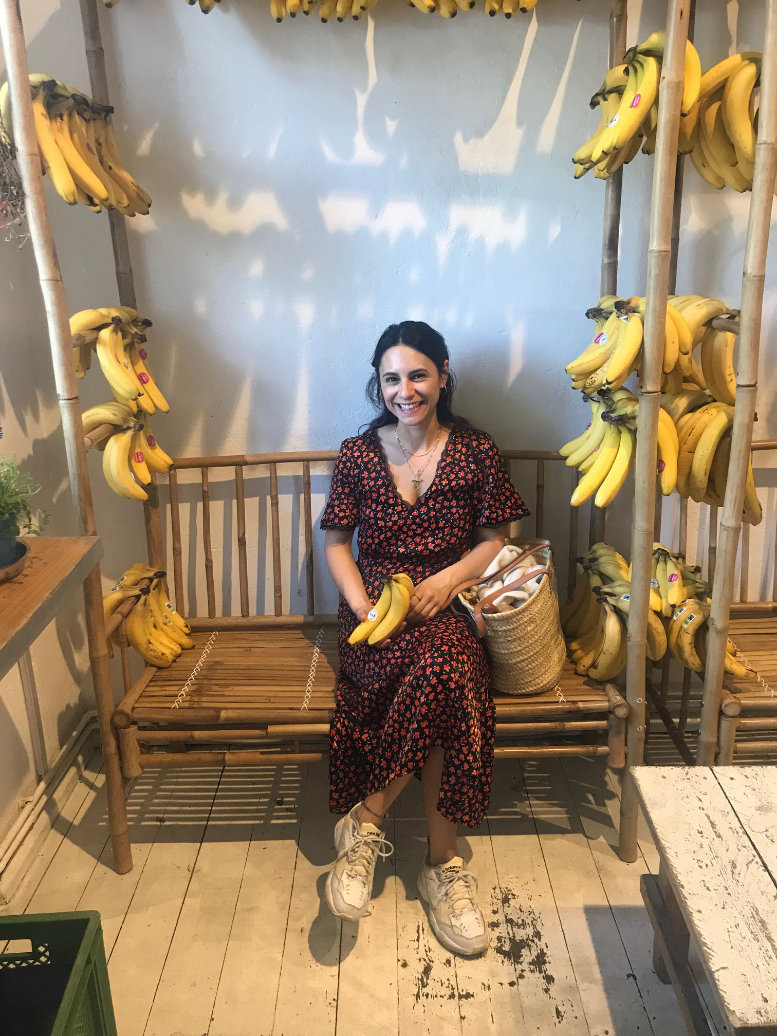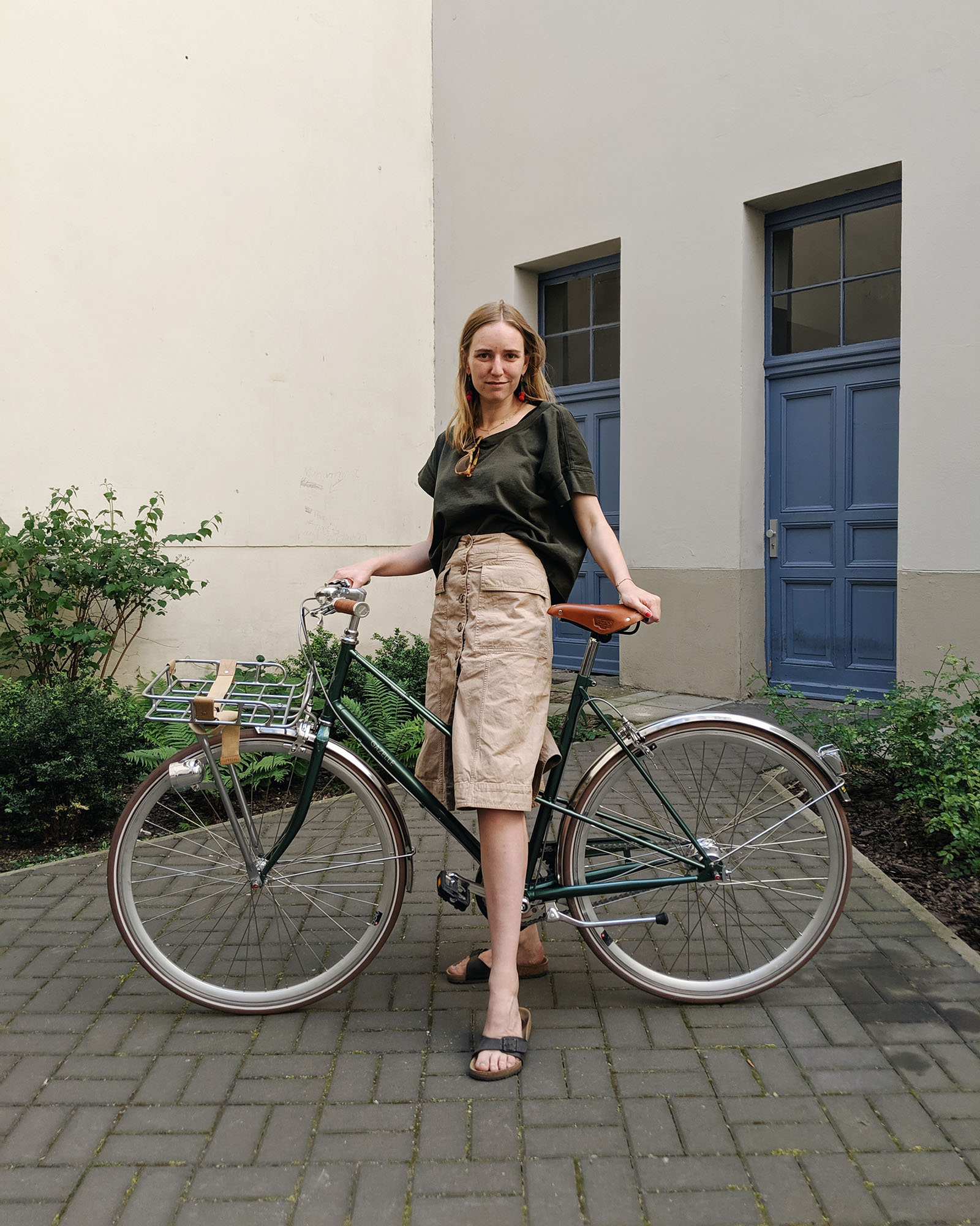 - Fahrrad von Gazelle, Shirt von Acne Studios , Rock von Acne Studios, Schuhe von Birkenstock, Ohrringe von Folkdays x Jane Wayne, Sonnenbrille von Viu Eyewear