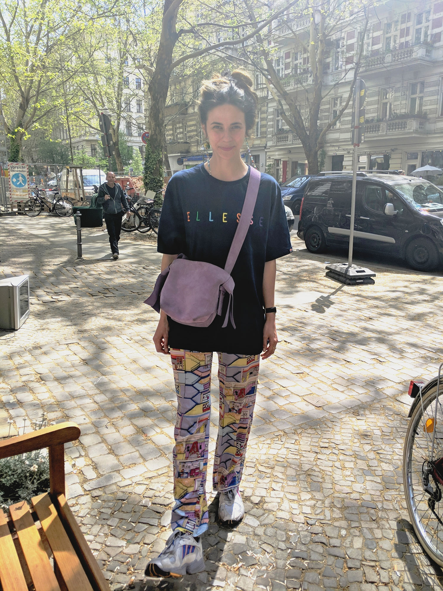 - Shirt von Ellesse (ausverkauft), Hose von Stine Goya, Tasche von Acne Studios, Schuhe von Adidas Yung