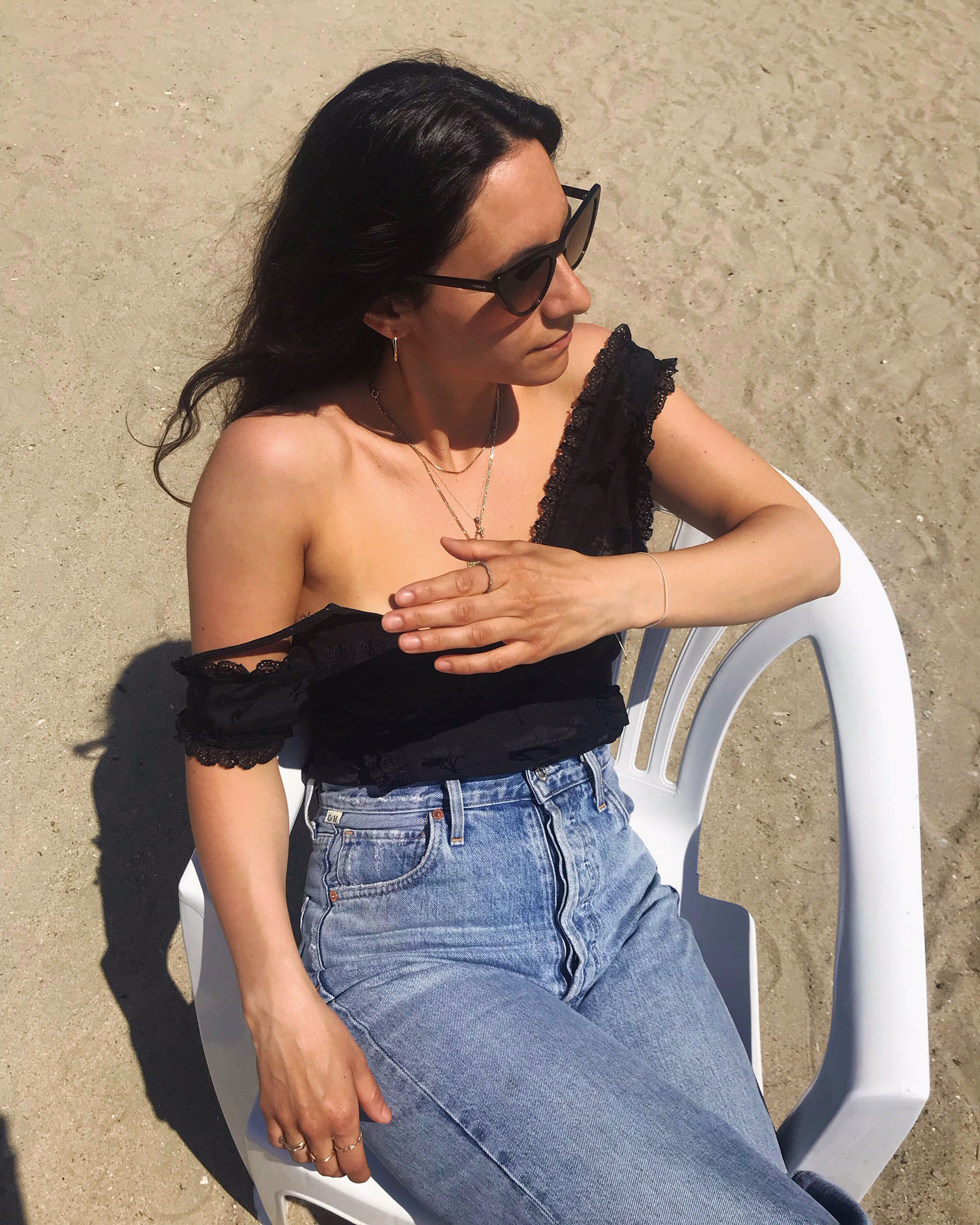 - Top von Ganni, Hose von Citizens of Humanity, Sonnenbrille von Gigi Hadid für Vogue Eyewear
