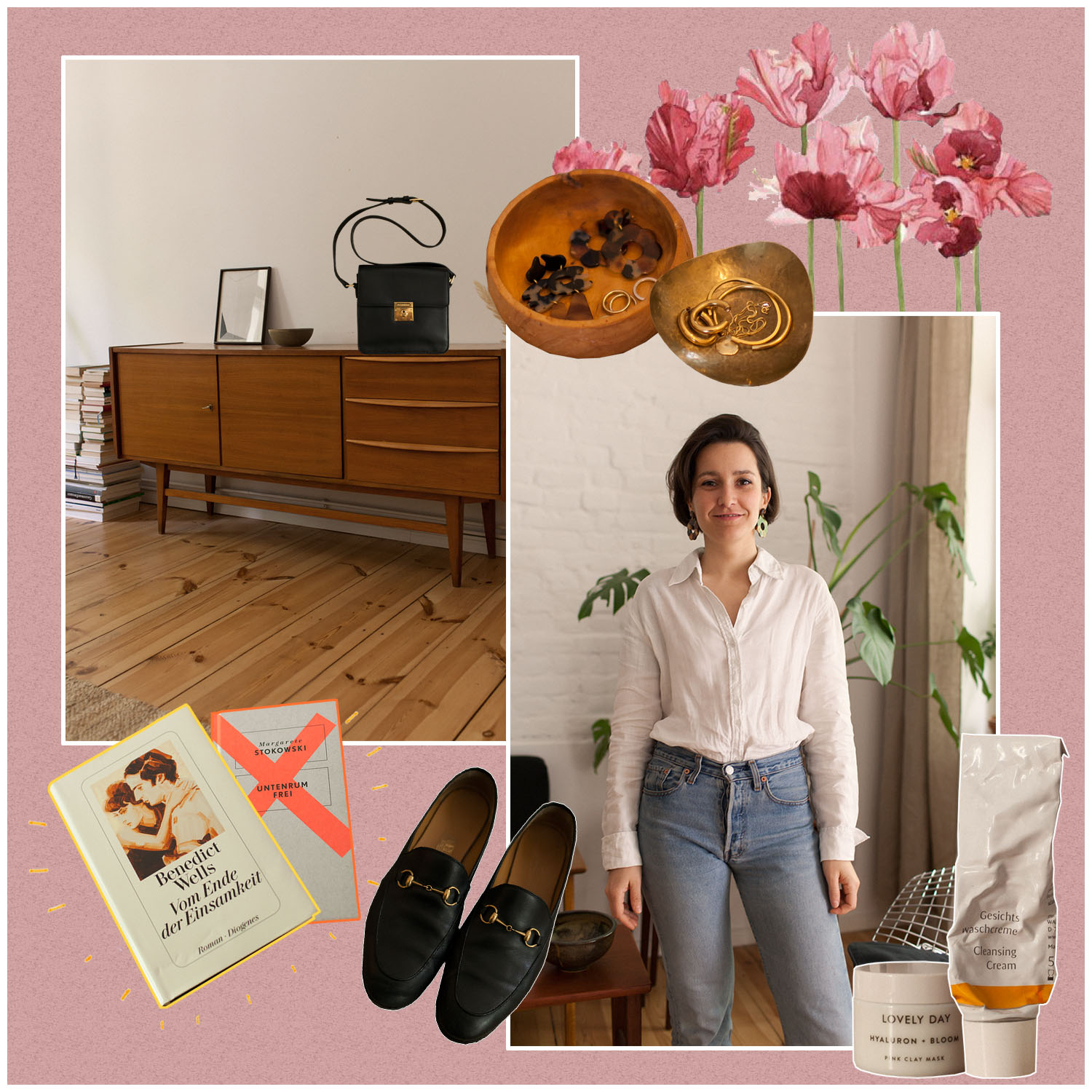 Die schönen Armreifen und Ringe sind von meiner lieben Freundin und Schmuckdesignerin Kiki Dieterle und kommen täglich zum Einsatz. Meine filigrane Kette von Anna Arroyo kombiniere ich am liebsten zum basic Shirt und den tollen Ohrringen von Laura Lombardi, die es auch bald bei Neuzwei zu kaufen gibt. In die Statement-Ohrringe von Après Ski hatte ich mich auf Instagram sofort verliebt, sodass ich sie auch unbedingt für den Laden bestellen musste!