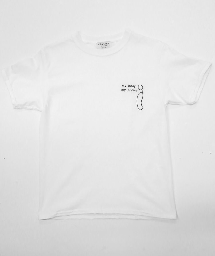 Statementshirts gelten in der Mode seit jeher als Kommunikationsmittel, das die eigene Botschaft – sei sie nun politisch oder nicht – in die Öffentlichkeit trägt, insofern sind die Modelle von Collina Strada also nichts neues. Und doch bezieht das Label mit seinen T-Shirts Position, regt somit vielleicht sogar Diskussionen an, ganz ohne dabei die Thematik selbst als Trend zu deklarieren. Vielmehr werden die Botschaften subtil in die Mode integriert, ganz selbstverständlich. In ihren Entwürfen greift Hillary Taymour Themen wie Klimawandel, Selbstliebe oder die Abtreibungsdebatte auf und spiegelt auf diese Weise die gesellschaftlichen Bereiche wider, mit denen auch sie sich persönlich auseinandersetzt.