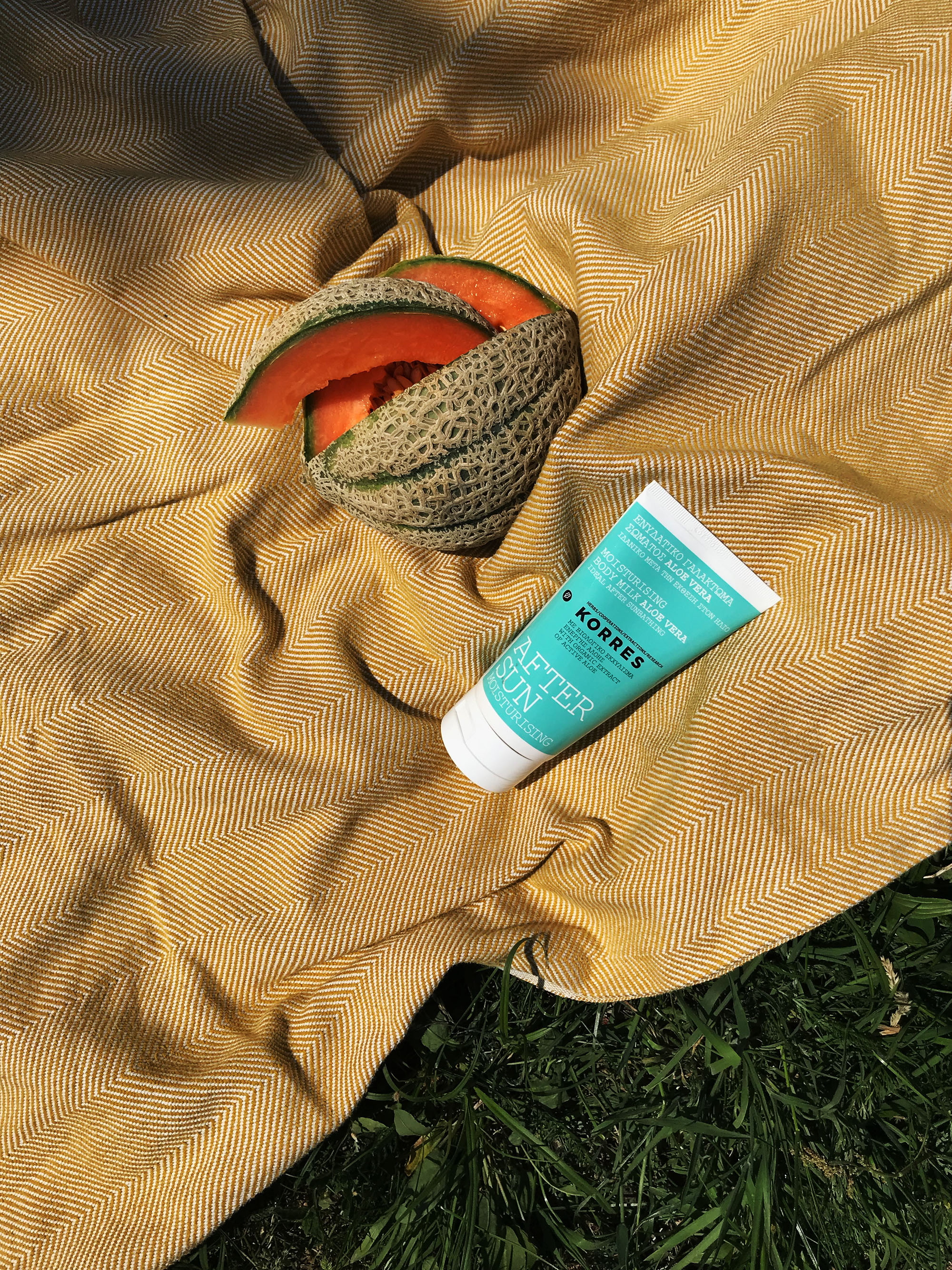 Nach einem Tag in der Sonne ist die Haut gereizt und ausgetrocknet. Genau jetzt ist es also wichtig, sie reichhaltig zu pflegen und mit Feuchtigkeit zu versorgen. Meine liebste Aftersun Creme ist von Korres, denn sie klebt nicht und zieht schnell ein. Der Hauptwirkstoff ist hier Aloe Vera – und genau die ist reich an Vitamin C, E, Zink und Antioxidantien. Die Creme lindert Rötungen und gereizte Haut. Die Aftersun Creme enthält ein wenig Parfum, aber keinen Alkohol und ist pH-neutral.