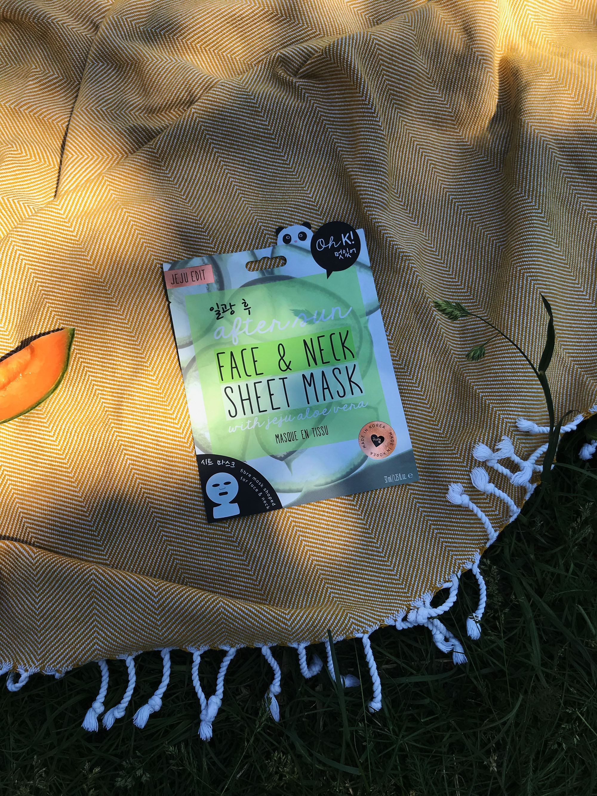 Ich habe noch nie eine Sheet Maske getestet, die über das Gesicht hinausreicht. Aber oho: Die Aftersun Maske mit Aloe Vera von Oh ok! verfügt über ein kleines Extra am Kinn, das man über seinen Hals und Nacken ziehen kann. Sieht gruselig aus, funktioniert aber wunderbar! Denn gerade Nacken und Hals, genau wie unser Gesicht, sind der Sonne komplett ausgeliefert und brauchen extra Pflege. Allerdings: Die Maske enthält Alkohol! Und wer das auf der Haut nicht gut verträgt, sollte vorsichtig sein.