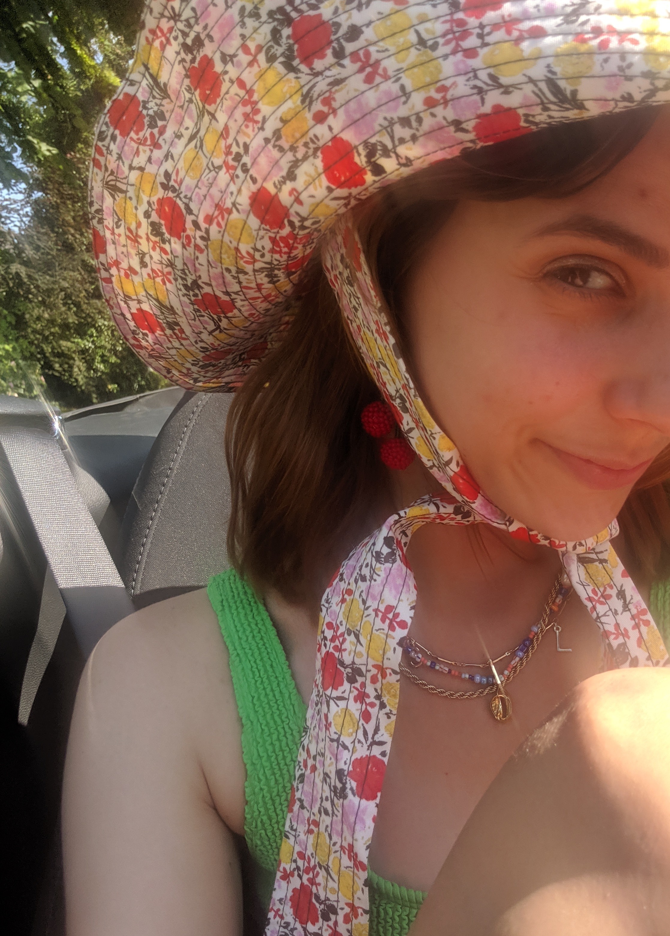 Hut von Ganni, Bikini von Monki, Kette von Ciaoamore & Jukserei, Ohrringe von Jane Wayne x Folkdays