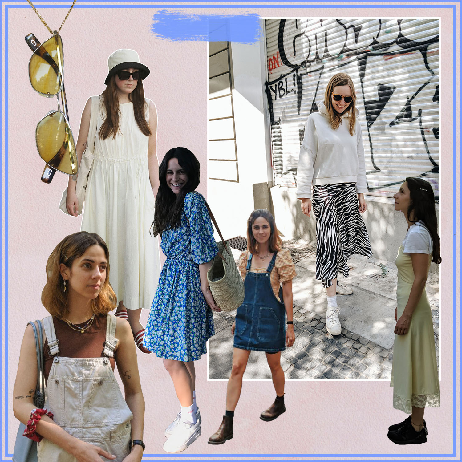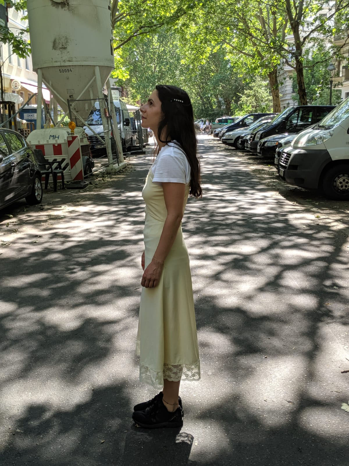 Links: Kleid (Nachthemd) vom Flohmarkt, T-Shirt von & Other Stories, Sneaker von Adidas