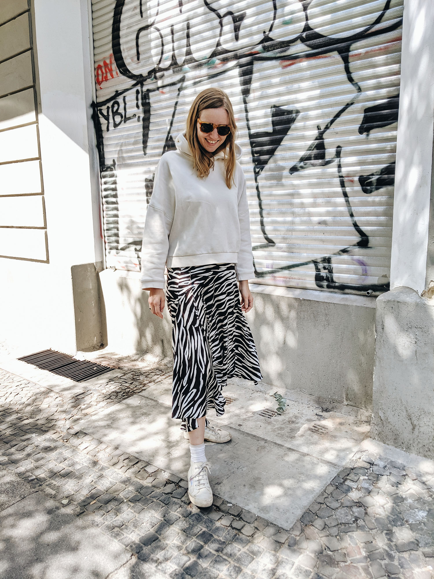 Hoodie von Edited the Label, Rock von Ganni (leider unauffindbar – schönste Ganni Stücke findet ihr aber hier), Brille von Monki, Schuhe von Superga