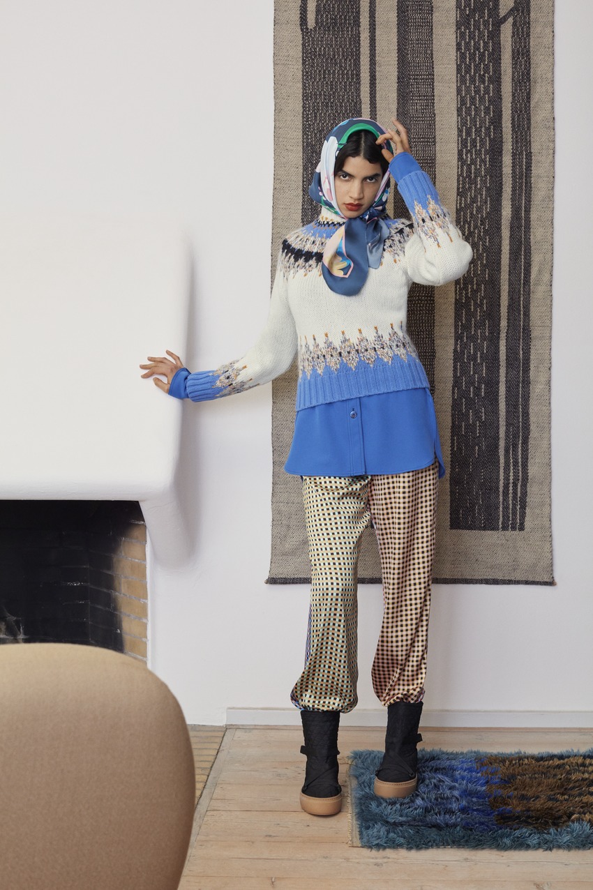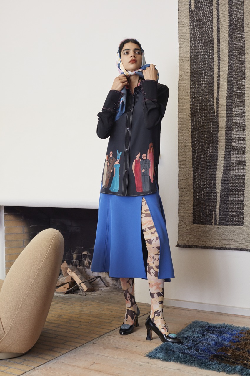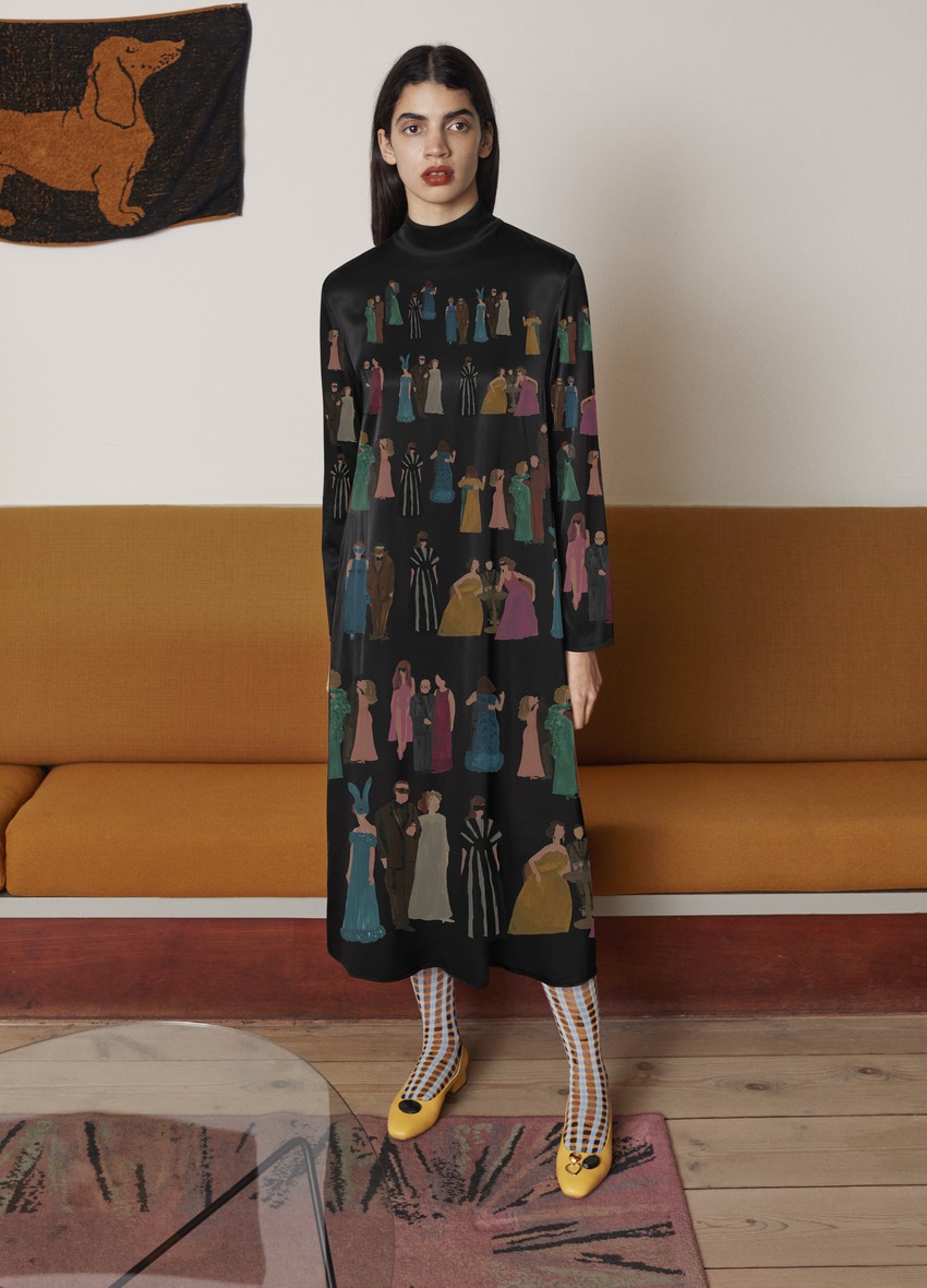 Und so sehen wir selbstverständlich ein One-Shoulder-Kleid mit Polka Dots an schwarzem Samt, ein High-Neck-Seidenkleid mit gezeichneten Schwänen, ein taillierter Mantel sowie karierte Hosen. Der typische Capote Stil der 70er Jahre diente außerdem als Inspiration für luxuriöse Blusen aus Seide und übergroßen Krägen und Ärmeln.