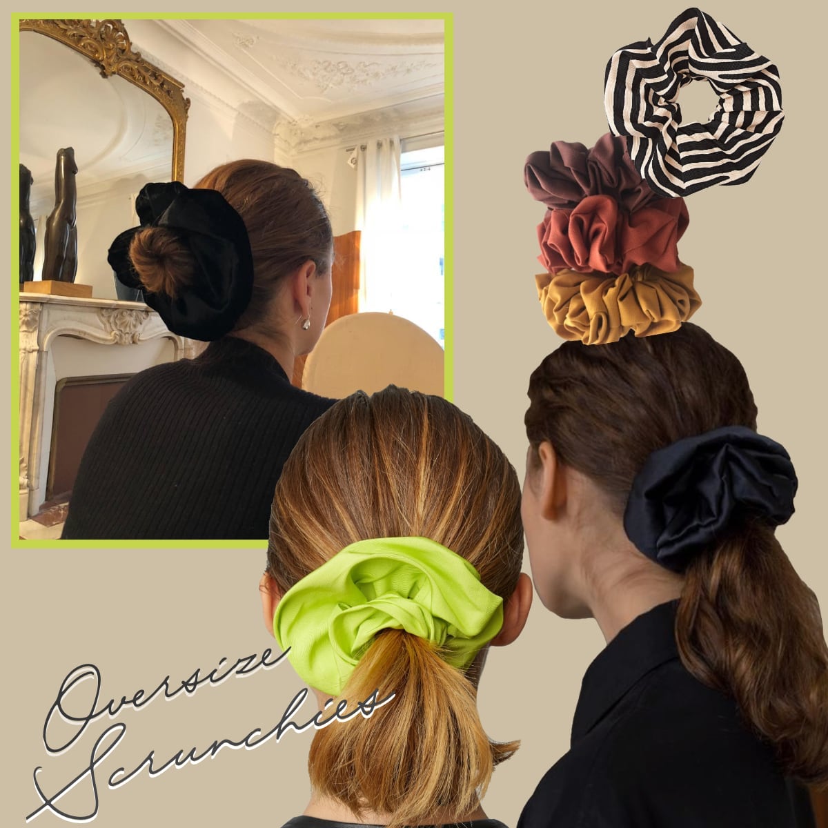 Ich habe so gut wie keinen Hinterkopf und ich weiß, dass ich all jenen unter euch, die schon länger mitlesen, damit inzwischen gehörig auf den Senkel gehen muss, aber es ist so, ihr könnt euch gar nicht vorstellen, wie viel Toupier-Handwerk in diesen Nicht-Frisuren steckt, jeden Tag, allein schon, um gegen den Flunder-Kopf anzukommen, der in Wahrheit exakt an der selben geraden Linie entlang verläuft wie der Nacken. Alles, was imstande ist, die Birne optisch zu voluminisieren, wird meinerseits also seit jeher dankbar angenommen – Scrunchies zum Beispiel, und zwar ohne Unterlass, nicht zuletzt, weil überhaupt gar nichts, was auch Ruth Bader Ginsburg trägt, je verkehrt sein kann. Neulich, als ich eigentlich Ausschau nach etwas ganz anderem hielt, stolperte ich schließlich über die Deluxe-Version dieser Haargummis, die ohnehin mächtig was her machen oder retten können, insbesondere an Tagen, die einem aufgrund von akuter Outfit-Langweile nahezu den Garaus machen, ihr wisst schon. Auf die Gefahr hin, dass ich nun sowieso schon klinge, als sei mir das Hirn heute Morgen zu den Ohren heraus geflutscht, setze ich an dieser Stelle noch einen oben drauf und verfalle erhobenen (platten) Hauptes in grenzenlose Schwärmereien hinsichtlich der von mir seitdem beäugten XXL-Scrunchies, die von einer Mondänität sind, wie wir sie für gewöhnlich nur von Jackie Kennedy kennen.