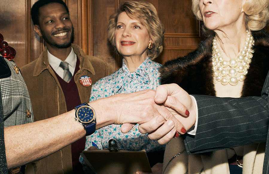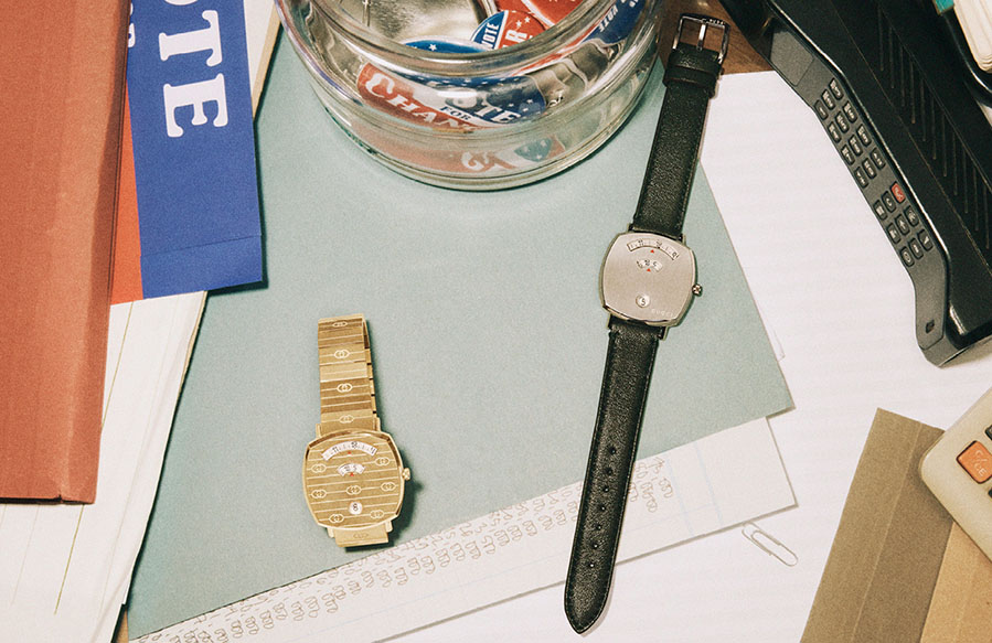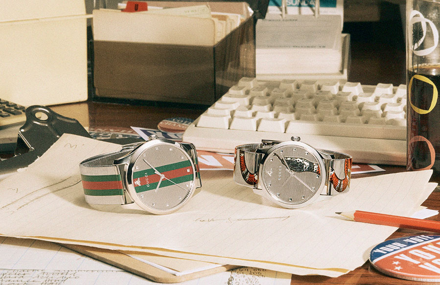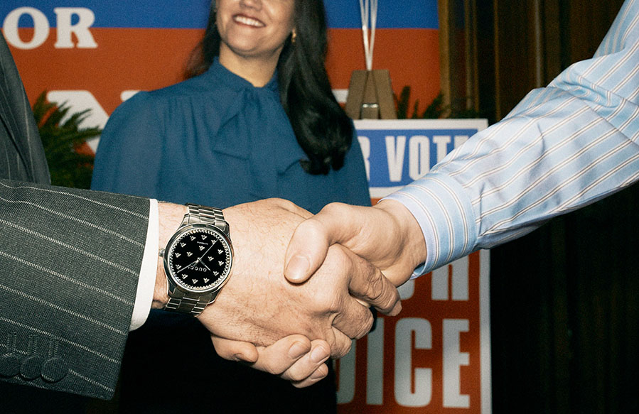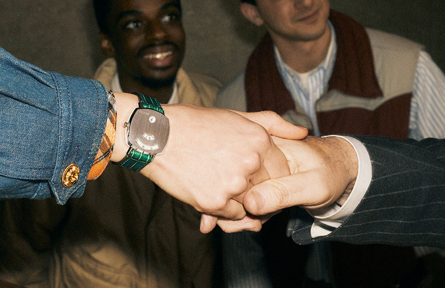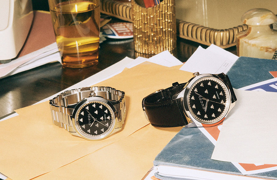 Erst vergangene Woche durften wir mit einer feinen Auswahl der neuen Gucci Timepieces Uhren shooten und heute konnten wir uns im Meeting die übrigen Modelle der Linie ansehen. Inspiriert vom Handschlag, von warmen Gesten und vom Zusammenkommen, funkeln Bienen auf der G-Timeless Automatic, während das starke Design des „Grip“ Modells an Handgelenken unterschiedlichen Alters und Herkunft für sich spricht. Die Zusammenführung der unterschiedlichsten Menschen findet durch den Handschlag statt.