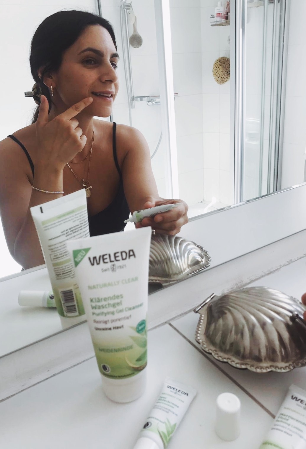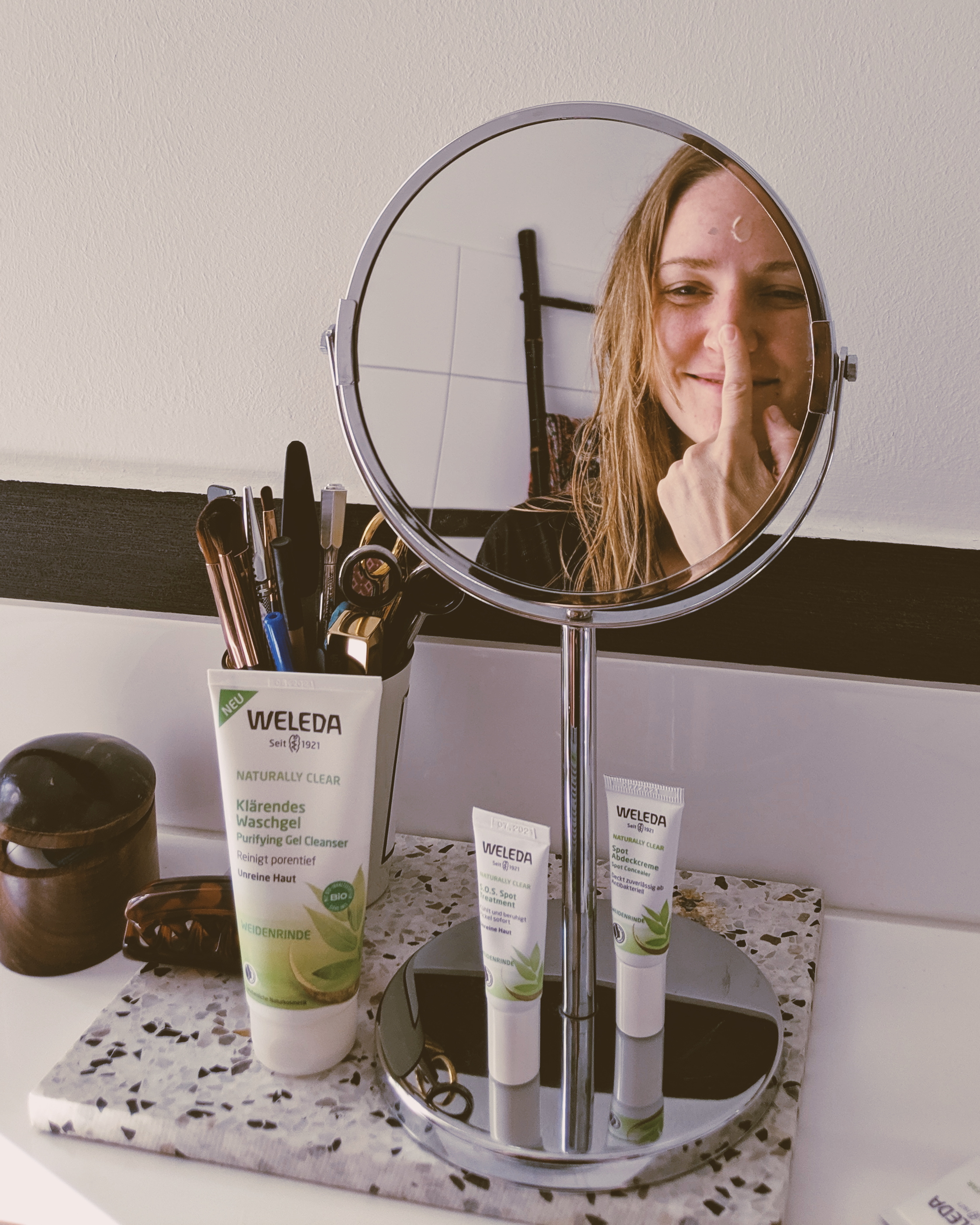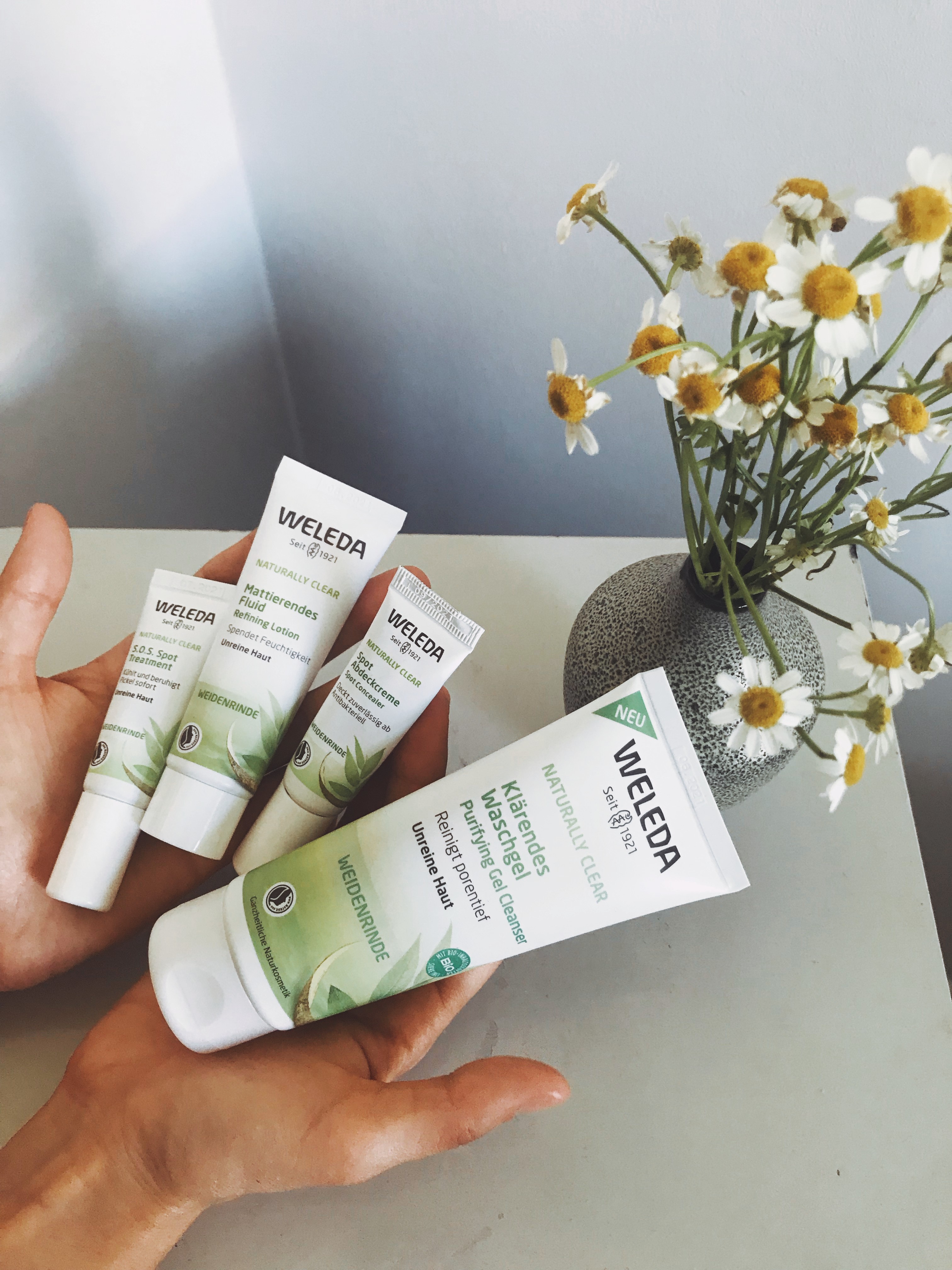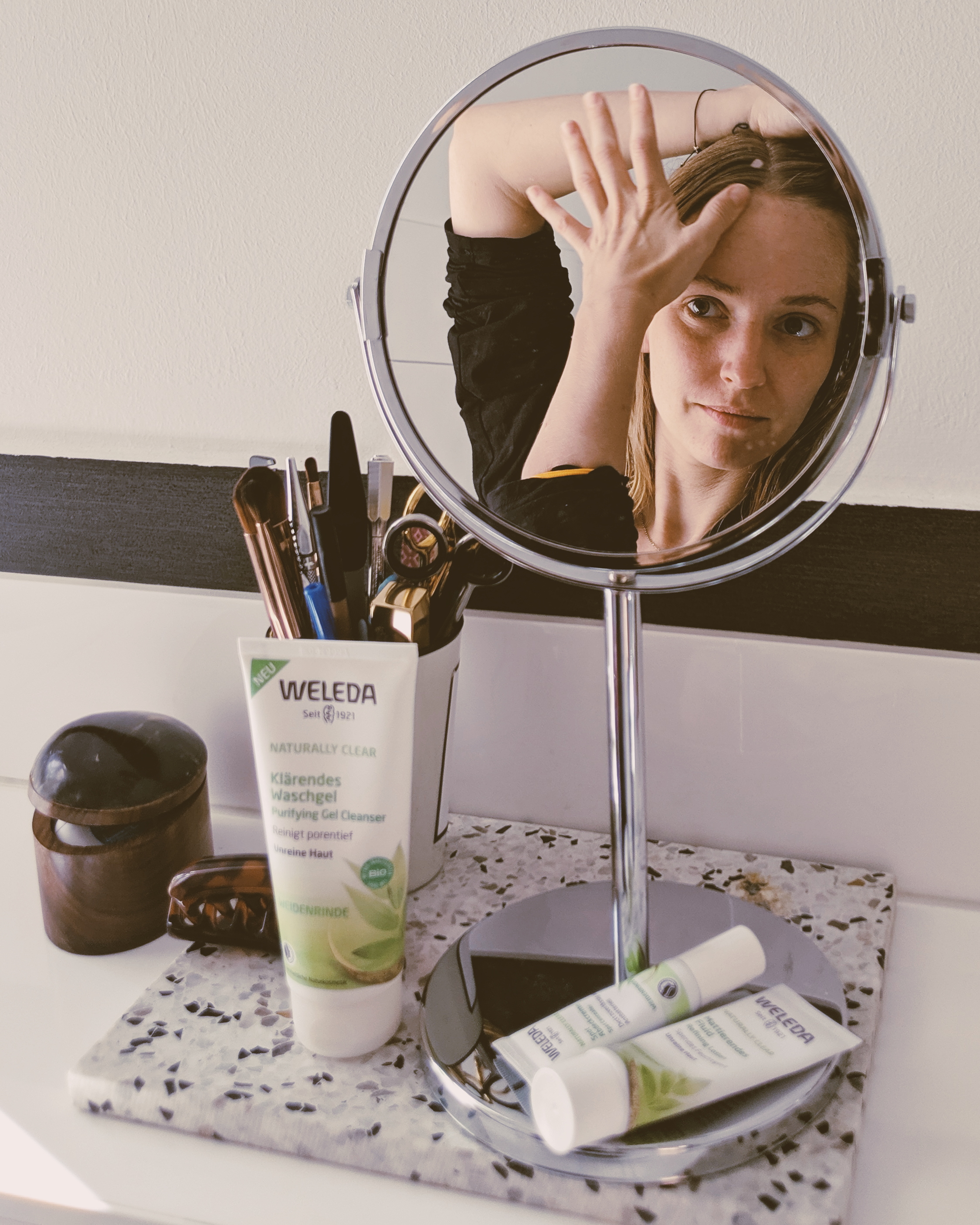 Ich liebe es, auf anderen Kanälen wie etwa Youtube oder Instagram ehrliche Produkttests von Menschen zu lesen, denen ich gern folge. Natürlich muss es sich hierbei um eine vertrauenswürdige Quelle handeln, schließlich ist der Markt gigantisch und mir und auch meinen Freundinnen fällt es oft schwer, die richtige Wahl zu treffen. Welche ist die beste Gesichtscreme für meine Haut? Und welcher Inhaltsstoff hilft wirklich gegen Unreinheiten? Was tut mir gut? Und was nicht? Ich rate immer zum Ausprobieren. Aber, das ist ganz wichtig, am besten nicht zu viele Produkte miteinander mischen, sondern ein paar Wochen beim gleichen zu bleiben – sonst findet man nämlich nie heraus, welches Produkt sich gerade mit der Haut verträgt und welches nicht. Als die Anfrage von Weleda für diese Kooperation in unser Mail-Fach flatterte, war ich ganz ehrlich aus dem Häuschen. Durch die UV-Strahlung, das viele Schwitzen und all die unterschiedlichen Produkte, die ich immer wieder ausprobiere, befindet sich meine Mischhaut derzeit in keinem guten Zustand. Noch dazu wird die gesamte T-Zone gerne mal von Pickeln und Mitessern befallen, auch jetzt noch als Erwachsene. Obwohl die Pubertät doch längst überstanden ist. Ich sage nur: Stress und/oder Hormone, ihr kennt das bestimmt. Wie lassen sich diese Unreinheiten denn nun auf kurze und lange Sicht bekämpfen, wie lässt sich die Haut unterstützen? Sämtliche Produkte, die Pickel einfach austrocknen lassen funktionieren für mich jedenfalls nicht – denn das führt zu Pickelmalen bzw. kleinen Pigmentflecken auf meiner Haut. Und hier kommt schließlich die neue Pflegeserie von Weleda ins Spiel: Naturally Clear.