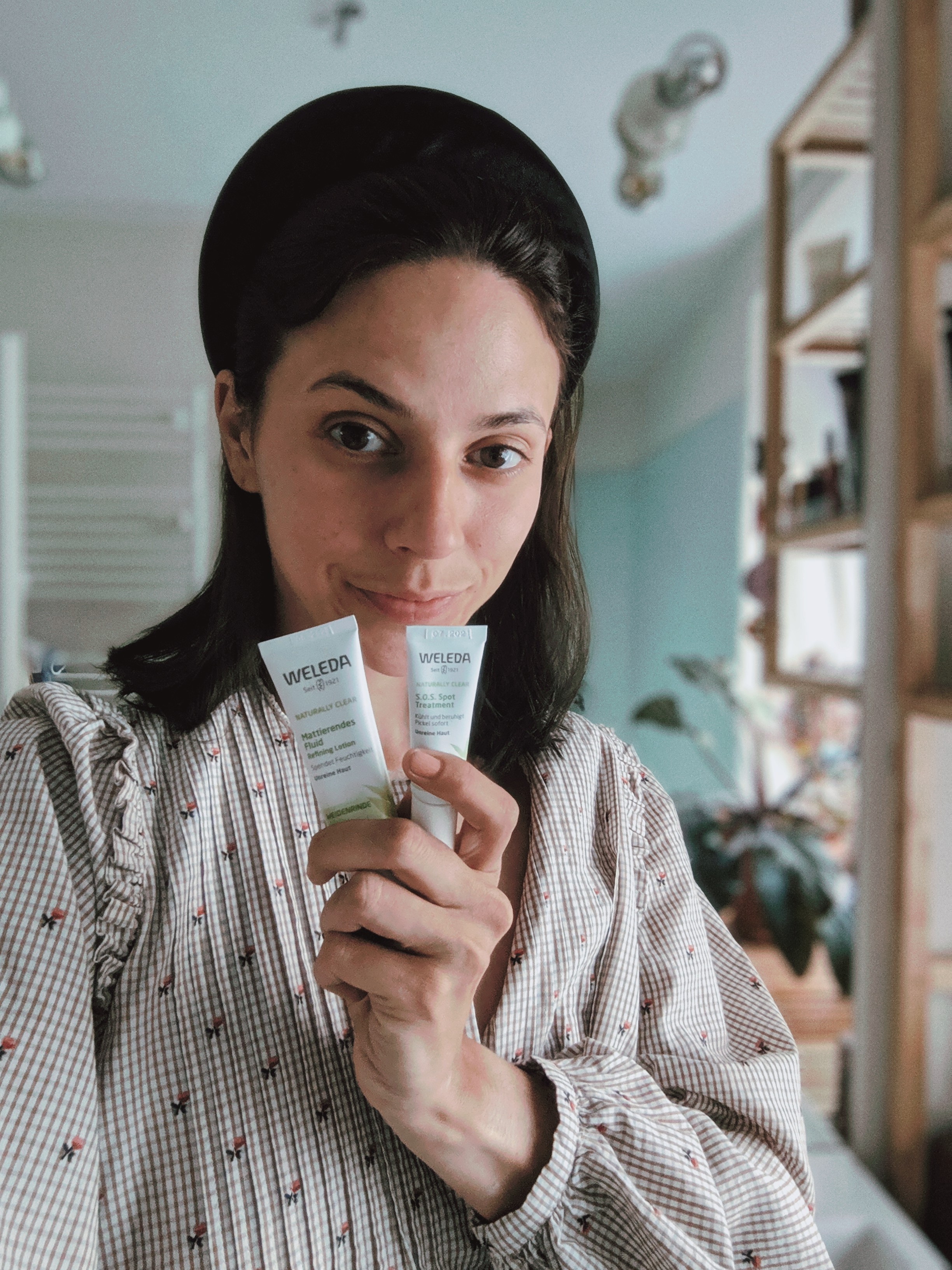 Ich war wirklich sehr gespannt auf diese neue Pflegeserie. Der/die ein oder andere wird vielleicht schon in einem älteren Artikel gelesen haben, dass ich ein Weleda-Groupie bin und sich das regenerierende Granatapfel-Öl immer in meinem Badezimmerschrank befindet. Da sich meine Gesichtshaut oft im Ungleichgewicht befindet, spielte mir die Kooperation mit Weleda perfekt in die Karten. Endlich der Haut eine Ruhepause gönnen und sich auf eine einzige Produktlinie fokussieren. Das erste, das ich gemacht habe, ist, das klärende Gesichtswasser zu testen. Die Konsistenz ist gel-artig und beim Auftragen schäumt es leicht auf. Sofort ist man in eine Kräuterwolke gehüllt, was nicht nur meine Haut, sondern auch meine Sinne beruhigt. Als ich mit dem Produkttest begann, hatte ich kleine Pickelchen auf der Stirn. Es hat eine Woche gedauert, bis ich ein neues Hautgefühl bekommen habe. Ich habe mich sowas von zusammengerissen und die Pickel abends mit dem S.O.S. Spot Treatment behandelt. Am Morgen nach der Reinigung und der Pflege habe ich dann dieselben Stellen mit der Spot Abdeckcreme abgedeckt. Bloß nicht anfassen danach! Wenn es besonders heiß war, habe ich das mattierende Fluid vor dem Abdecken der Pickel auf die Haut aufgetragen. Nach einigen Wochen konnte ich dann erst Ergebnisse sehen. Eher positiv aufgefallen ist mir, dass keines der Produkte die Haut austrocknet und die Pickel wurden immer weniger. Ich behaupte nicht, dass die Weleda Naturally Clear Serie Wunder bewirkt, denn gegen hormonell bedingte Pickel ist man leider manchmal machtlos. Dennoch ist meine Haut viel, viel besser geworden, vielleicht auch wegen des Drückens, das ich jetzt sein lasse und ganz bestimmt wegen des antibakteriellen Weidenrindenextrakts. Nach und nach kommt meine Haut wieder ins Gleichgewicht, das spüre ich ganz deutlich, und sowohl ich als auch meine Haut können wieder durchatmen.