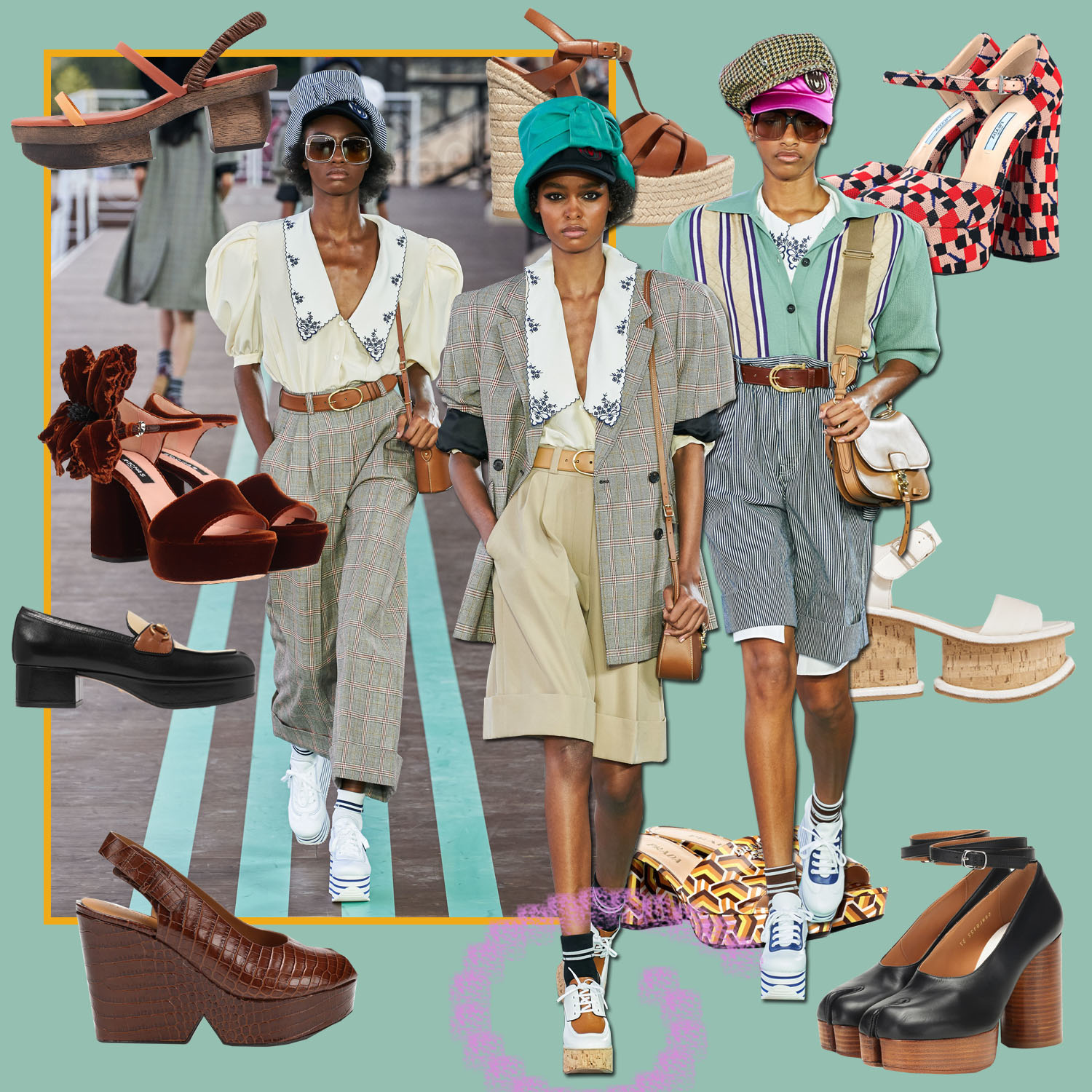 Zig Paar hohe Schuhe tummeln sich in meinem Schuhschrank. Manche tragen Blockabsatz, andere Kitten Heel und wieder andere wollen es richtig wissen, mich in die Höhe schießen lassen und einen Carrie-ähnlichen Moment herbeizaubern. Ich führe selten eines dieser Modelle aus, weswegen ich irgendwann aufgehört habe, mich dieser Sammelleidenschaft hinzugeben. Ich trage sie ja doch nicht, diese filigranen Kunstwerke, die ich zwar so sehr liebe, die für Berliner Straßen aber irgendwie nicht gemacht sind. Ein Trauerspiel. Seit wenigen Wochen aber gibt es für mich wieder eine Lösung, um ein bis fünf Zentimeter zu meiner Größe hinzuzuschummeln und bei den flachen Kumpaninnen für Abwechslung zu sorgen: Und die nennt sich Platform, hört auf die Bezeichnung Wedge oder ganz einfach auf Plateau! Ich kann mir selbst nicht helfen, aber der unbändige Drang, hochbesohlte Schuhe und Sandalen auszuführen ist stärker als zuvor und wurde zuletzt durch die fantastische Cruise Collection von Miuccia Prada für das jüngere Label Miu Miu gekrönt: