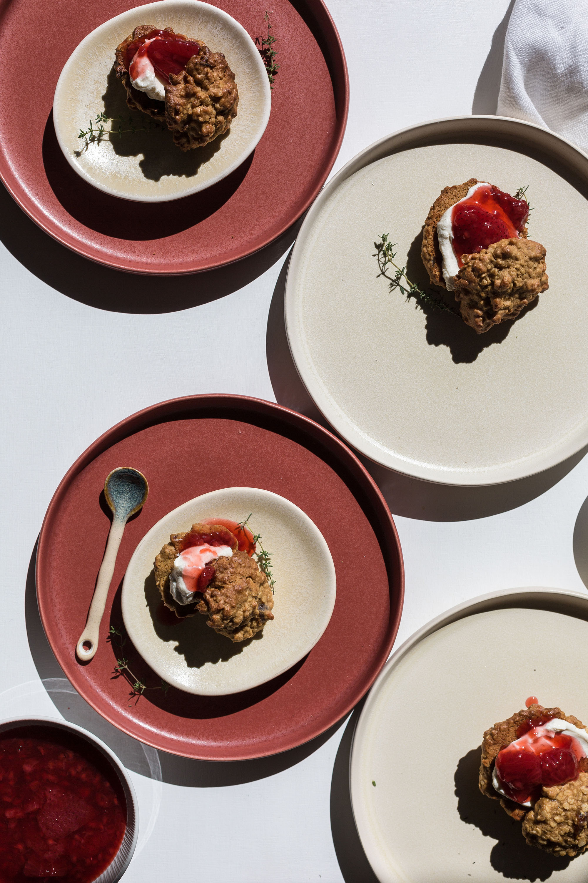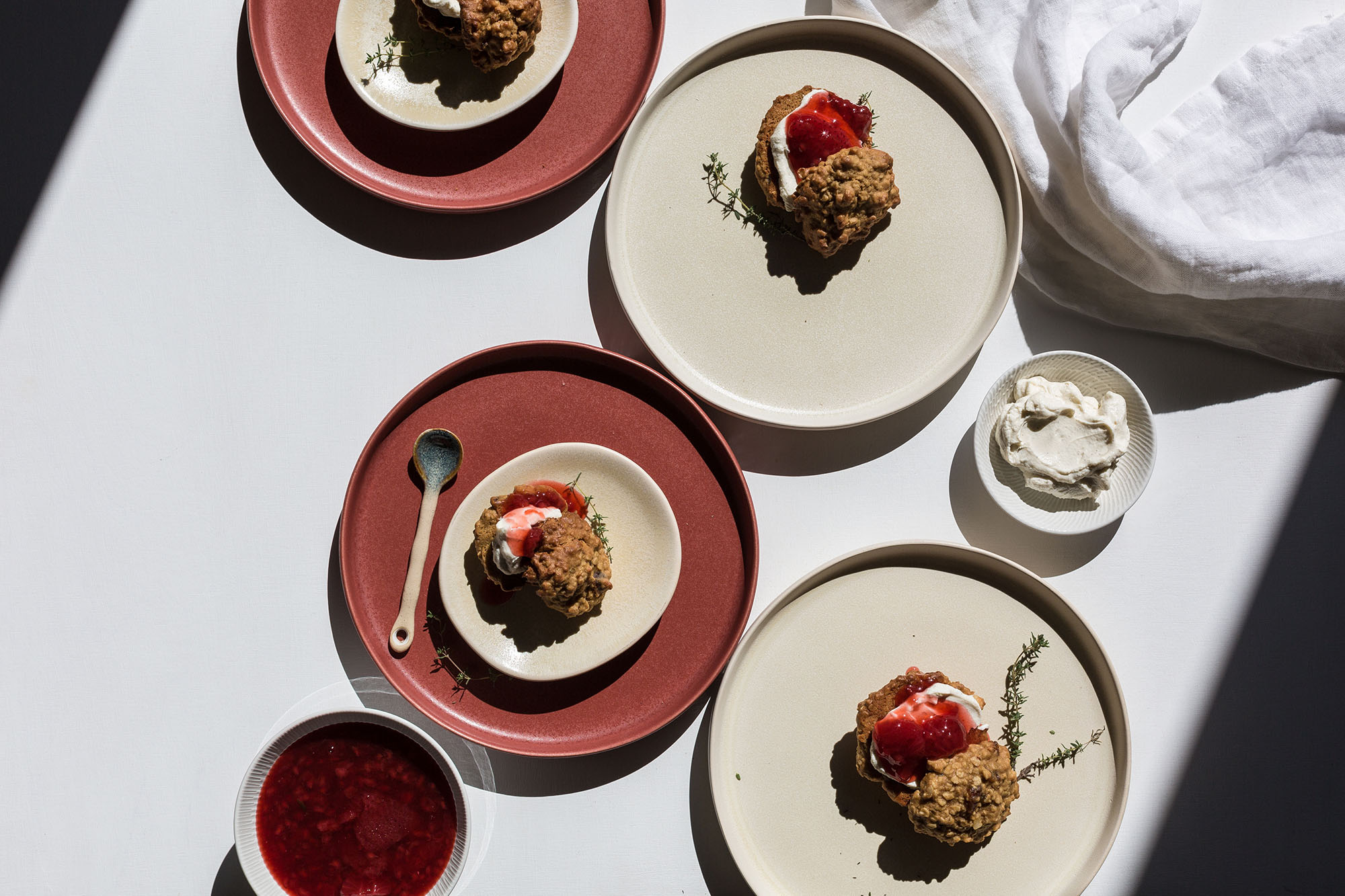Die Haferkekse mit Vanille-Labneh und Erdbeerkompott servieren. Ein wunderbares Frühstück oder gesundes Dessert im Sommer!