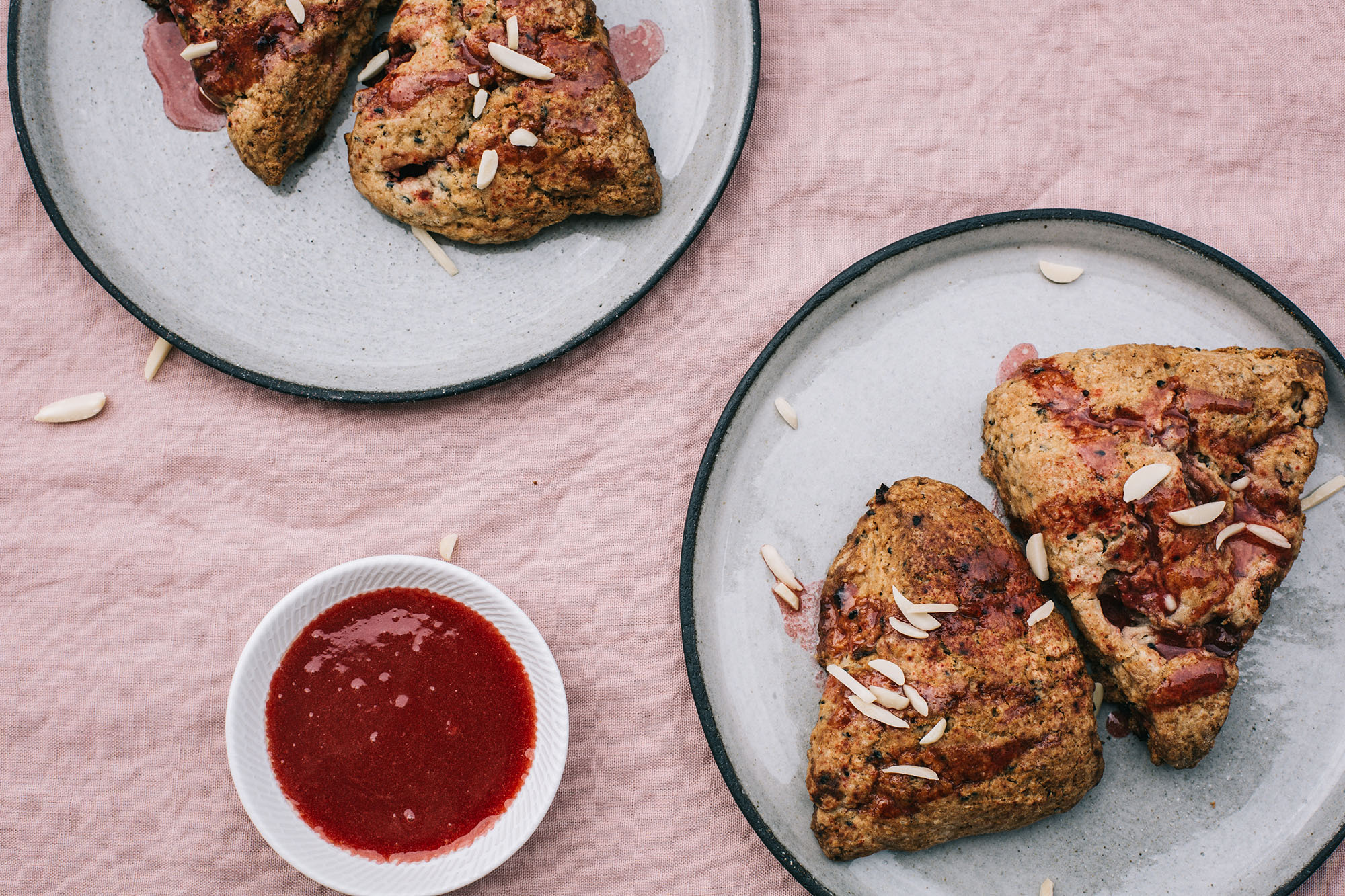 Essen und Schwangerschaft ist ja so eine Sache: Erstmal war mir wochenlang übel, so schlimm, dass rein gar kein Ingwertee oder Cracker neben dem Bett geholfen hätten. Der Gedanke an Essen ließ mir alleine schon die Galle hochkommen und verzweifelt suchte ich immer wieder die Örtlichkeiten auf, sobald ich etwas gegessen hatte. Ihr könnt euch ja vorstellen, dass eine solche Situation für jemanden, der täglich mit Lebensmitteln zu schaffen hat, echt schwierig war. Als die Zeit endlich vorbei war, fragte ich mich schon neugierig, ob sich nun seltsame Gelüste bemerkbar machen und wie sich auf meine Rezepte und mein Essverhalten auswirken würden. Aber Fehlanzeige: Ich verspürte nur die große Lust auf Backen und Erdbeeren. Und da ich versuche, möglichst gesund zu essen (mit einigen Ausnahmen, ein Burger, eine Pizza oder eine Portion Pommes in der Woche müssen schon drin liegen), ließ ich Weißmehl und weißen Zucker konsequent weg. Außer bei der Glasur der Scones – da musste ein wenig Puderzucker her.