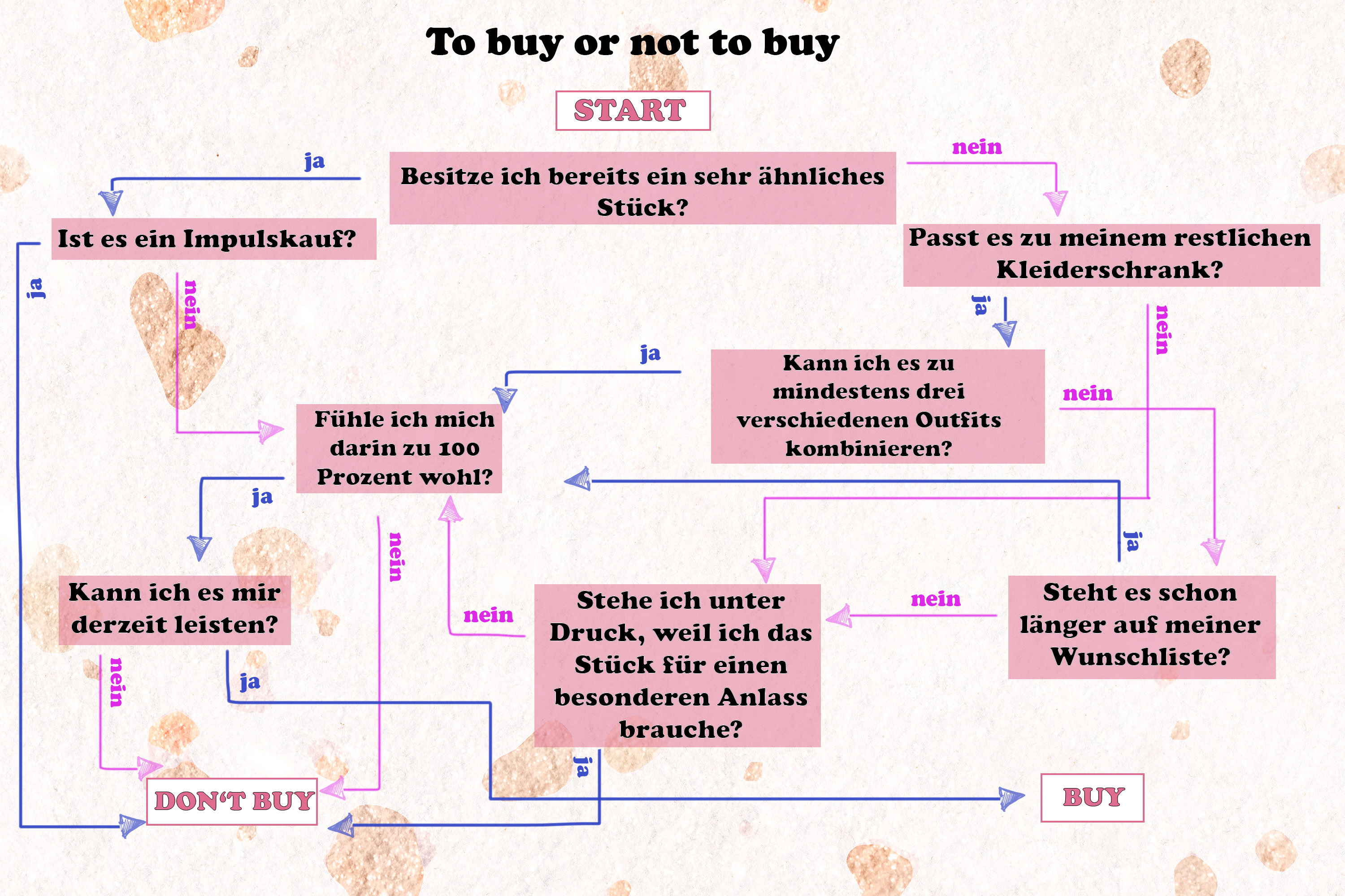 Fehlkäufe sind verdammt dämlich und noch dazu unnötig. Das kann ich aus eigener Erfahrung sagen, denn inmitten meiner Zwanziger verführten mich oftmals Kleidungsstücke, die ich meist weder brauchte, noch mit hundertprozentiger Überzeugung wollte. Mittlerweile weiß ich es besser, kaufe wesentlich bewusster und gebe noch dazu weniger Geld aus. Meine Tipps habe ich vor einigen Wochen bereits mit euch geteilt, weil so ein langer Text ja auf die Schnelle aber nicht immer das Richtige ist, habe ich mich heute für euch an einen kleinen „Psychotest“ gewagt − sozusagen als Hilfestellung und Schutz in Fällen grober Unentschlossenheit. Wie immer gilt: Am Ende hat jeder selbst das letzte Wort.