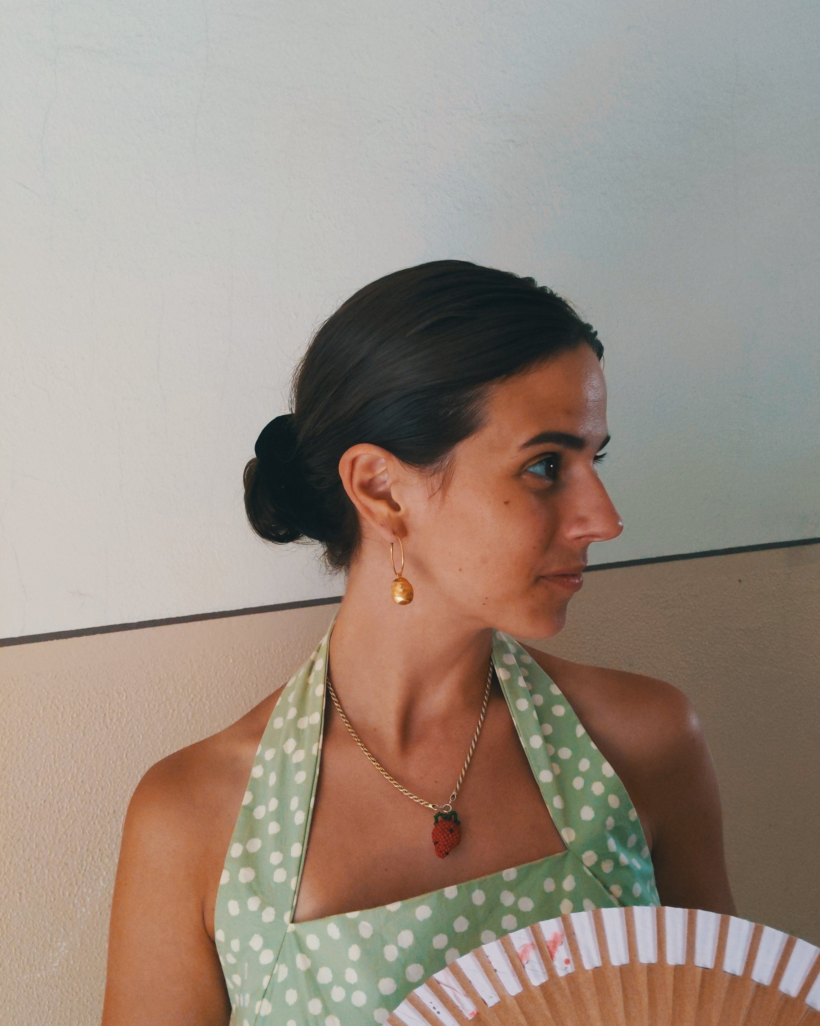 Ohrringe: Jane Kønig, Kette: Jukserei, Erdbeere: Folkdays x Jane Wayne