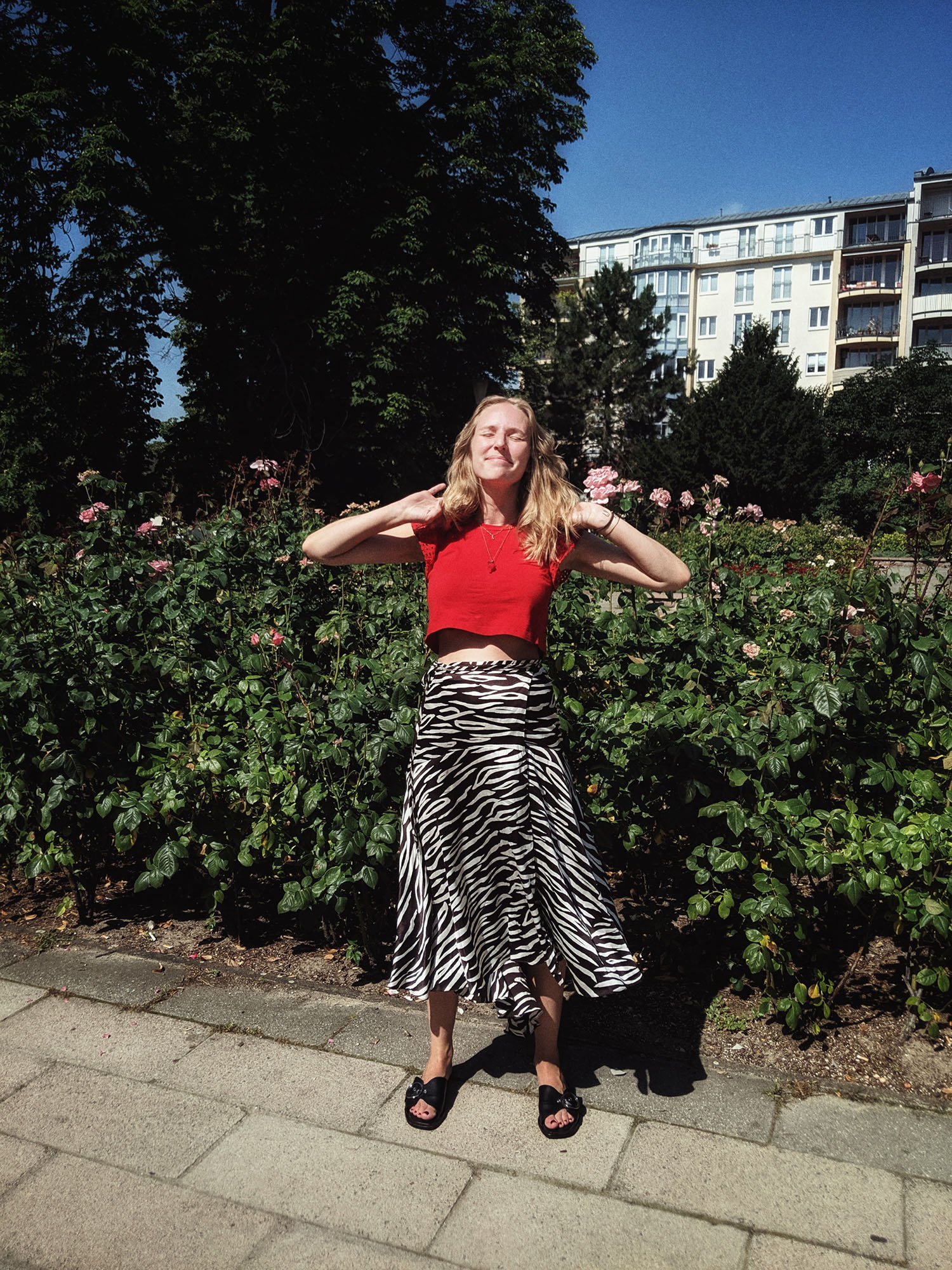 Zebra-Wickelrock von Ganni (ausverkauft), Shirt von & Other Stories (alt), Schuhe von Edited the Label