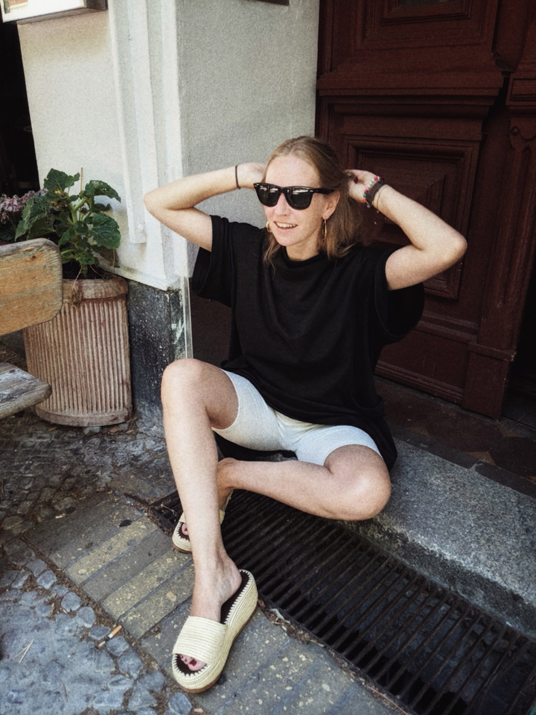Links: Shirt von Acne Studios (alt), Radlerhose von & Other Stories (ausverkauft), Brille von Ray-Ban, Schuhe von Nandi