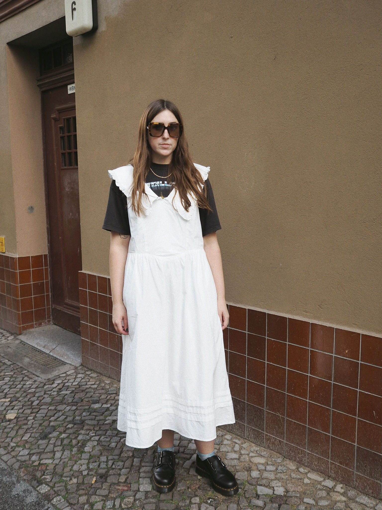 Rechts: Vintage T-Shirt, Kleid von Urban Outfitters, Schuhe von Dr. Martens, Sonnenbrille von Gucci via Vestiaire Collective