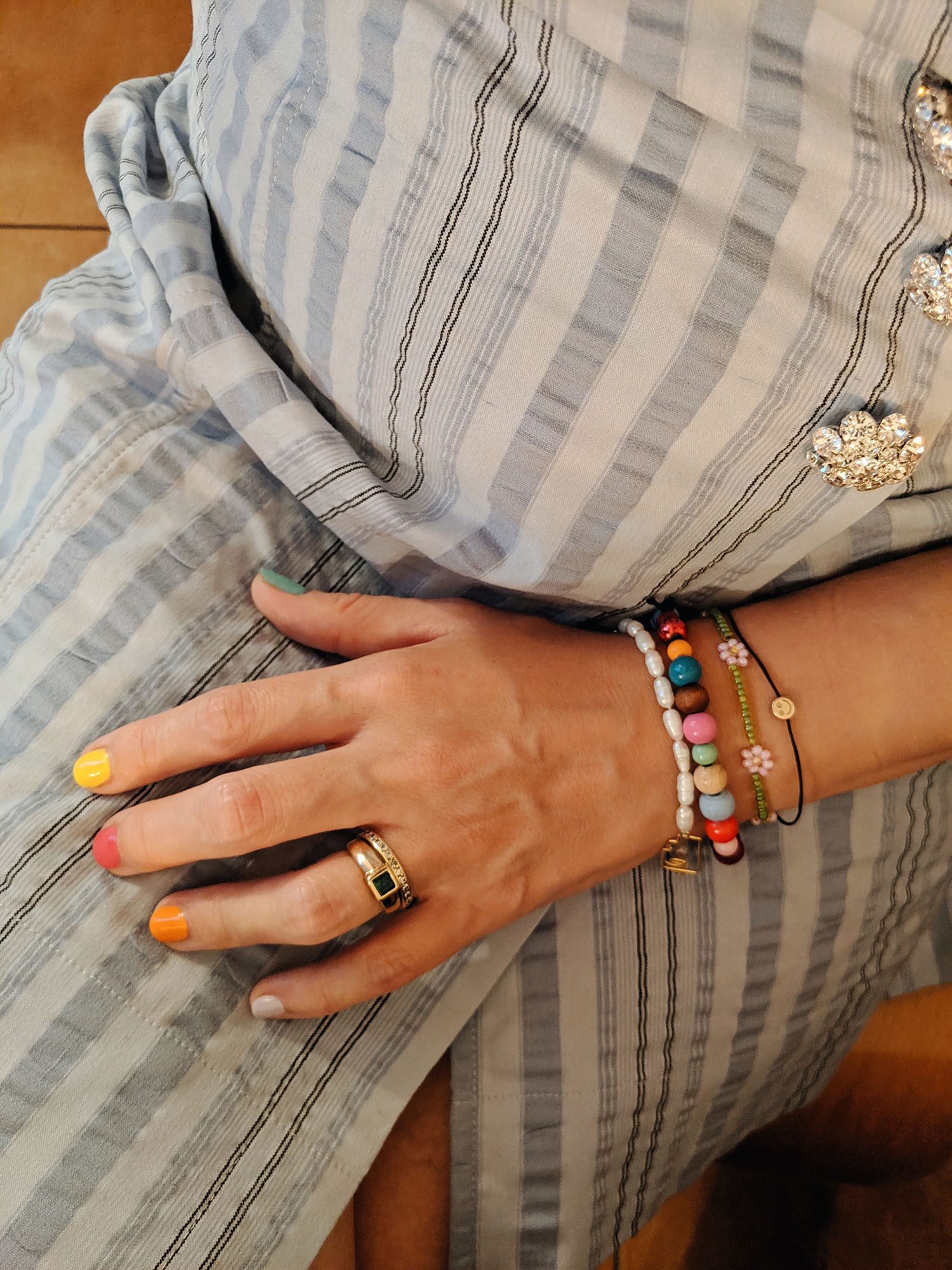 Rechts: Kleid von Ganni, Armbänder: selbstgemachte Freundschaftsgeschenke / Nina Kastens & Margova Jewelry