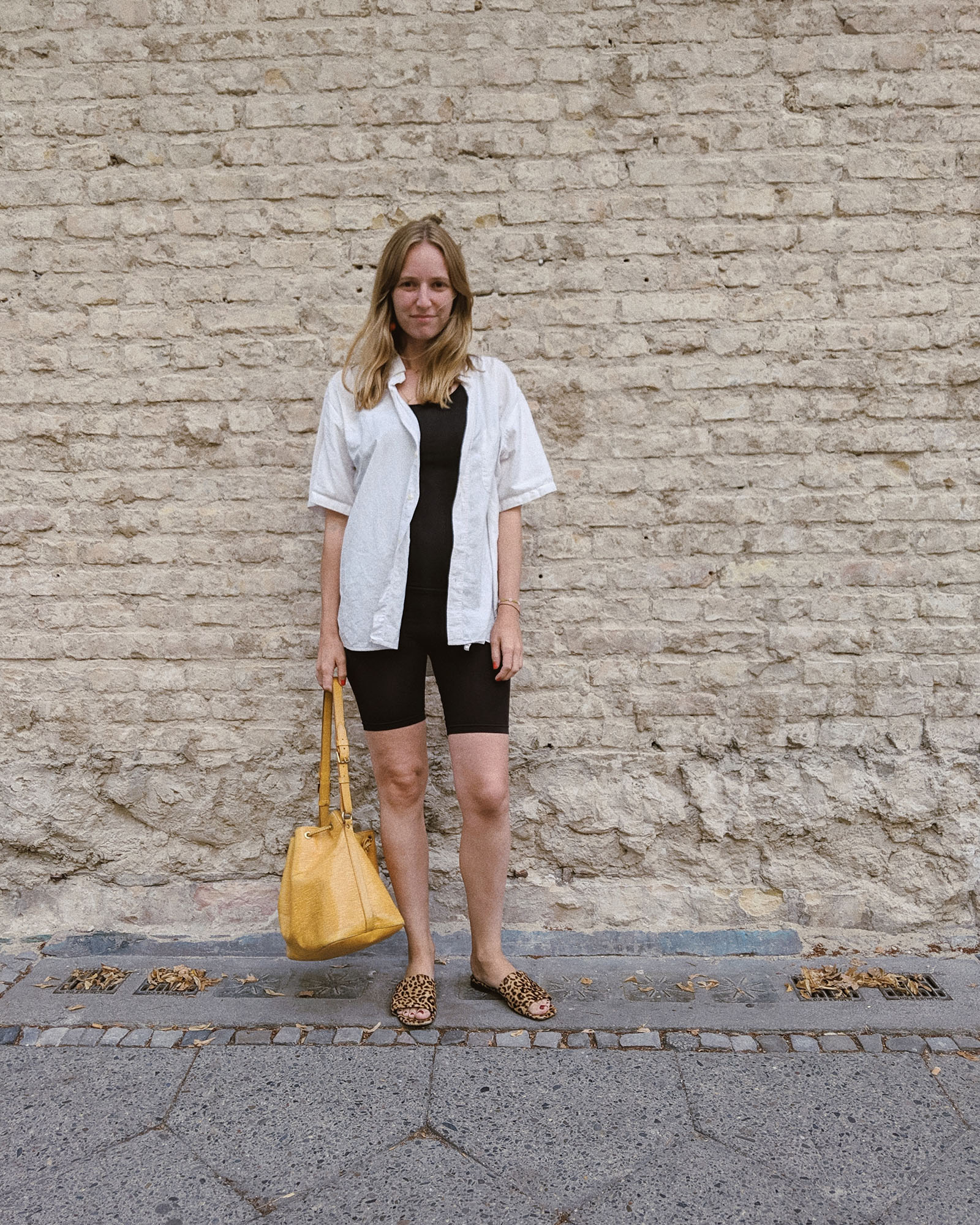 Links: Hemd von Lacoste, Top von Skiny , Radlerhose von Mamalicious, Schuhe von Edited the Label, Tasche von Louis Vuitton via Vestiaire Collective
