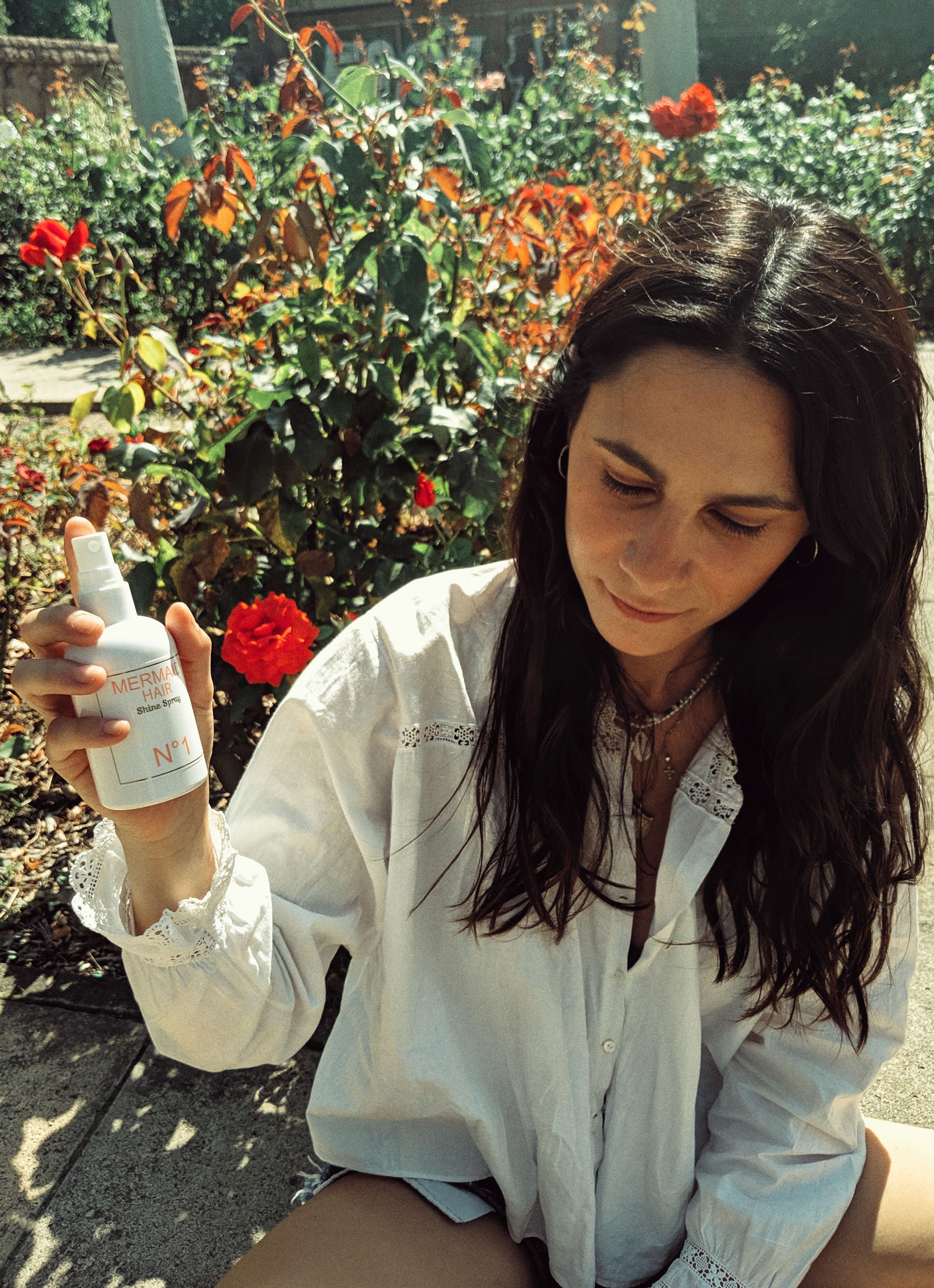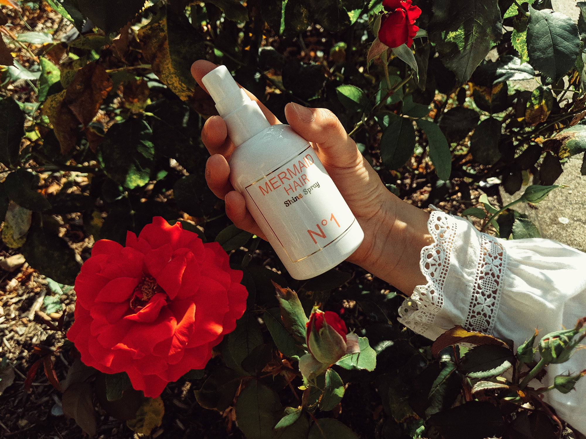 Nachdem ich meine Haare gewaschen und getrocknet habe, gebe ich gerne einige Pumpstöße von dem Shine Spray von Mermaid (über niche-beauty.com) auf meine Längen. Sofort fühle ich mich wie im Hochsommer, denn das Spray riecht nach Orangenblüte und Kokosnuss.