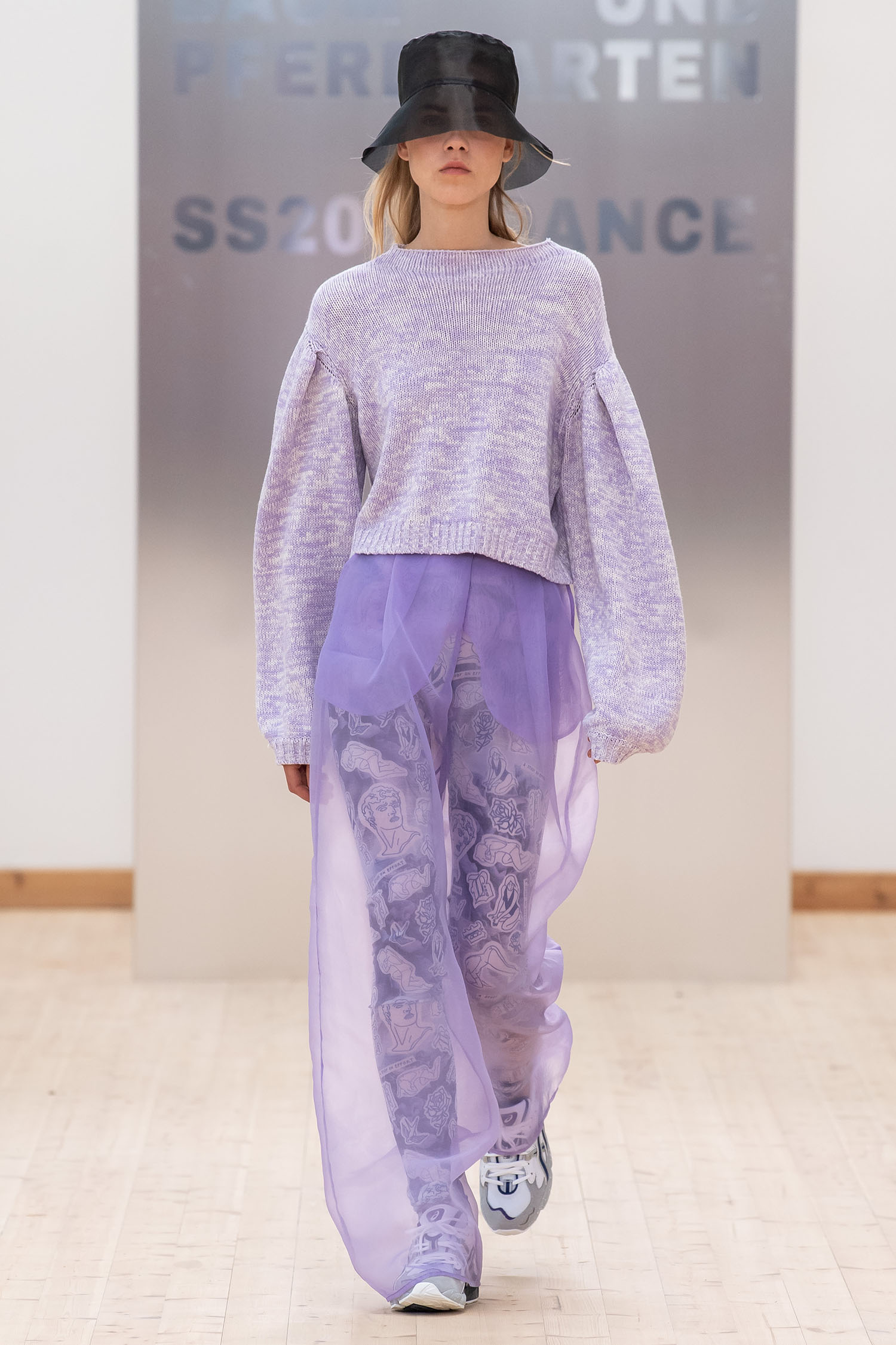 Bereits für diesen Herbst setzte Baum und Pferdgarten auf körperferne Transparenzen, starkes Lila, Rose und Schwarz und sorgte so im Handumdrehen für neue Silhouetten, die Layering auf eine neue Stufe hob. Grund genug, weiter daran festzuhalten und sogar Bucket Hats aus einem zarten Organza zu kreieren.
