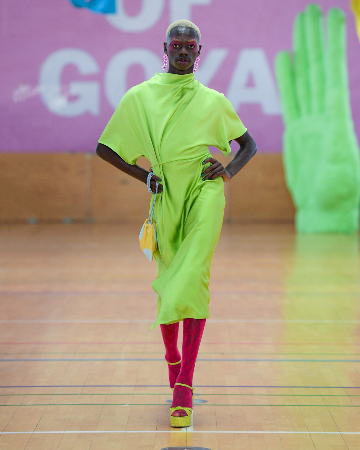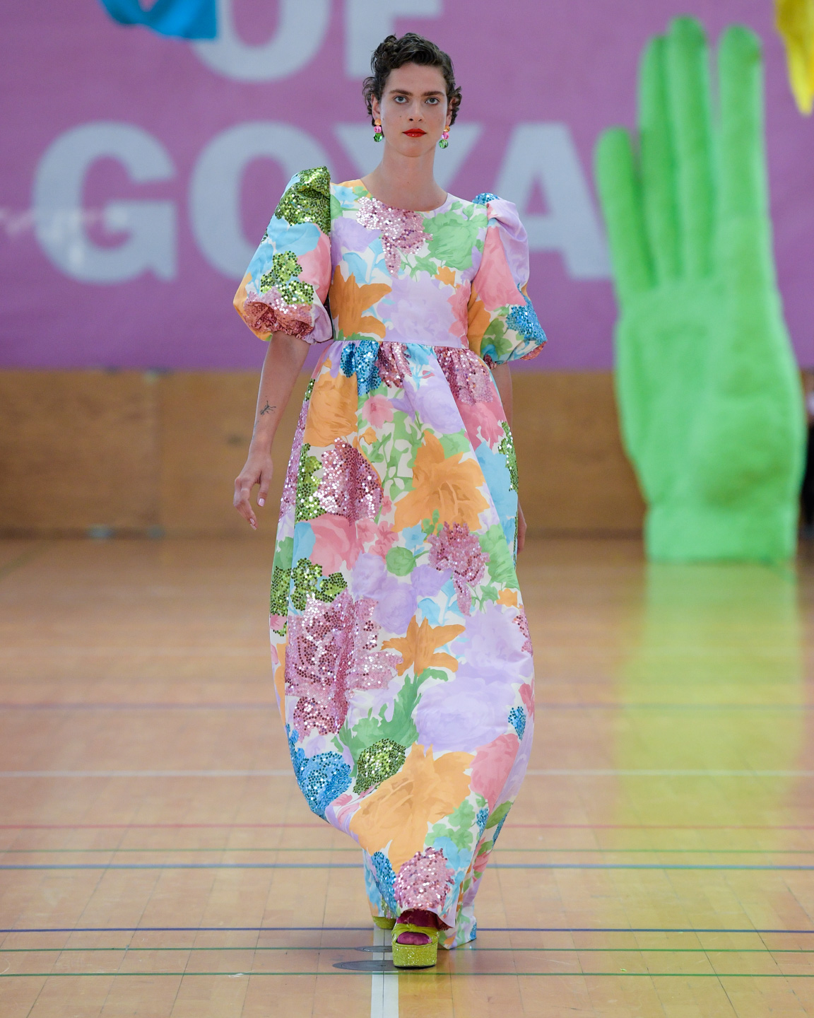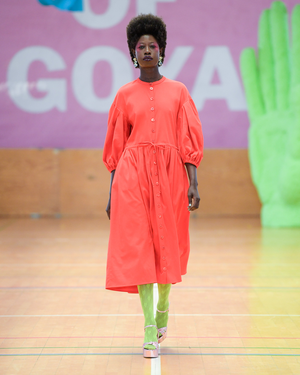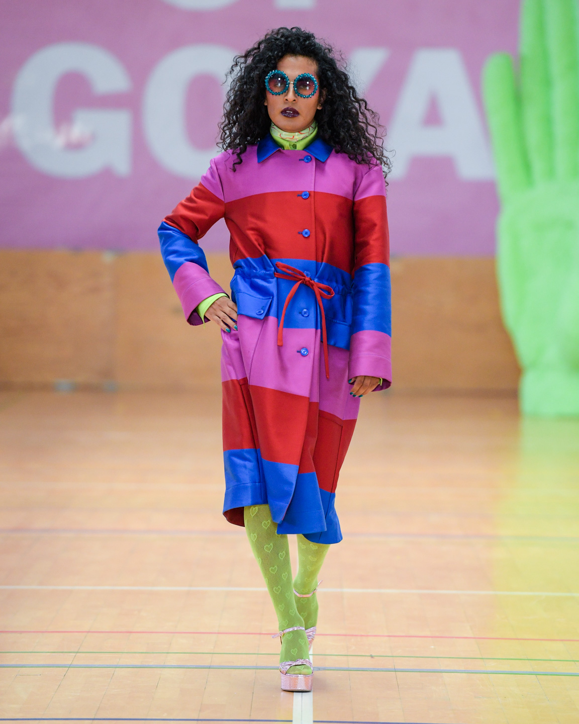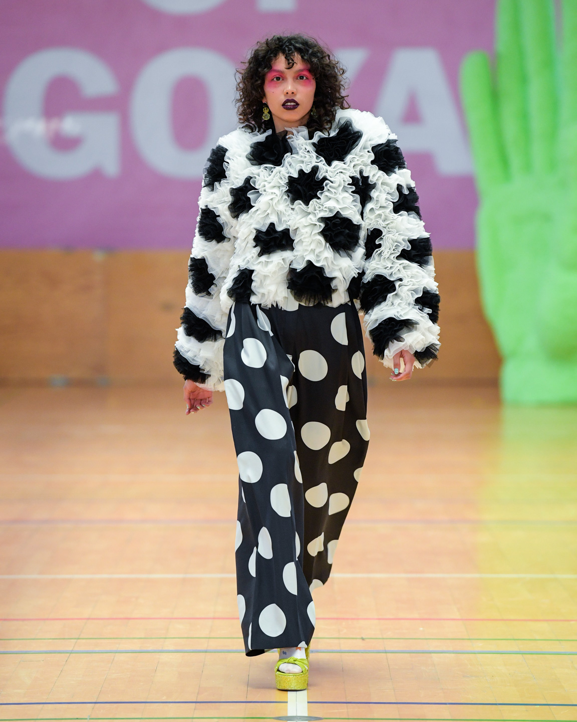 Bereits die aufgebaute Kulisse in der Turnhalle ließ vermuten, dass die Show von Stine Goya flamboyant werden würde – und tatsächlich glichen die kommenden Minuten vielmehr einer Zelebrierung von Mode und Diversität, als einer gängigen Modenschau. Inspiriert von der Ballroom Kultur steht die Spring Summer 2020 Kollektion unter dem Motto „House of Goya“ und zeigt sich in einer extravaganten Ästhetik, die in den bunten Entwürfen, aber auch im Cast Platz findet. So wurden die Designs eher von Persönlichkeiten als bloßen Models präsentiert, die in einer koketten Attitüde über den Turnhallenboden schritten und für ihren Auftritt jede Menge Jubelrufe erhielten. Für den Cast selbst arbeitete Stine Goya mit Mitgliedern aus lokalen und internationalen Ballroom und Kiki Häusern zusammen, um sich nicht einfach einer Kultur zu bedienen, sondern diese vielmehr direkt zu integrieren.
