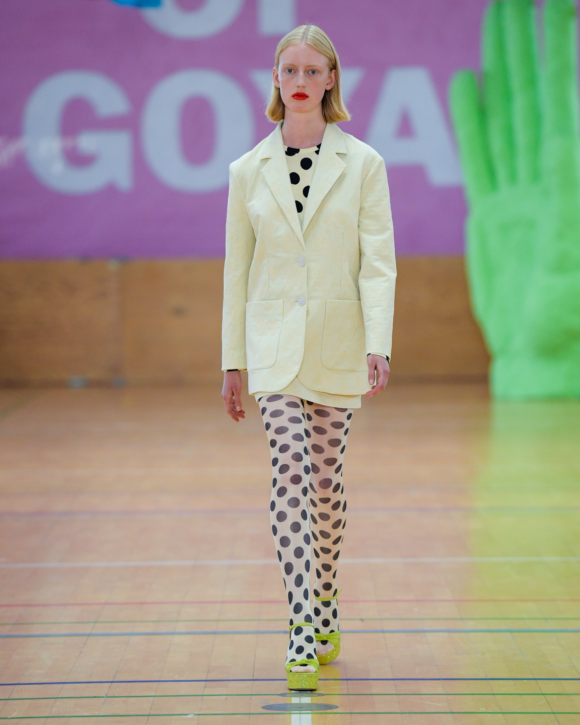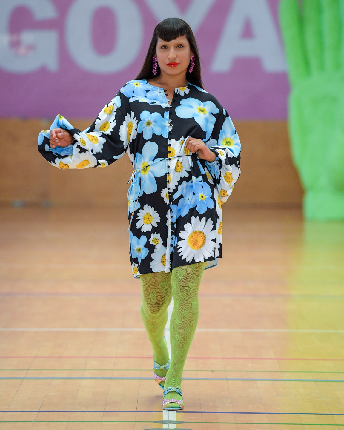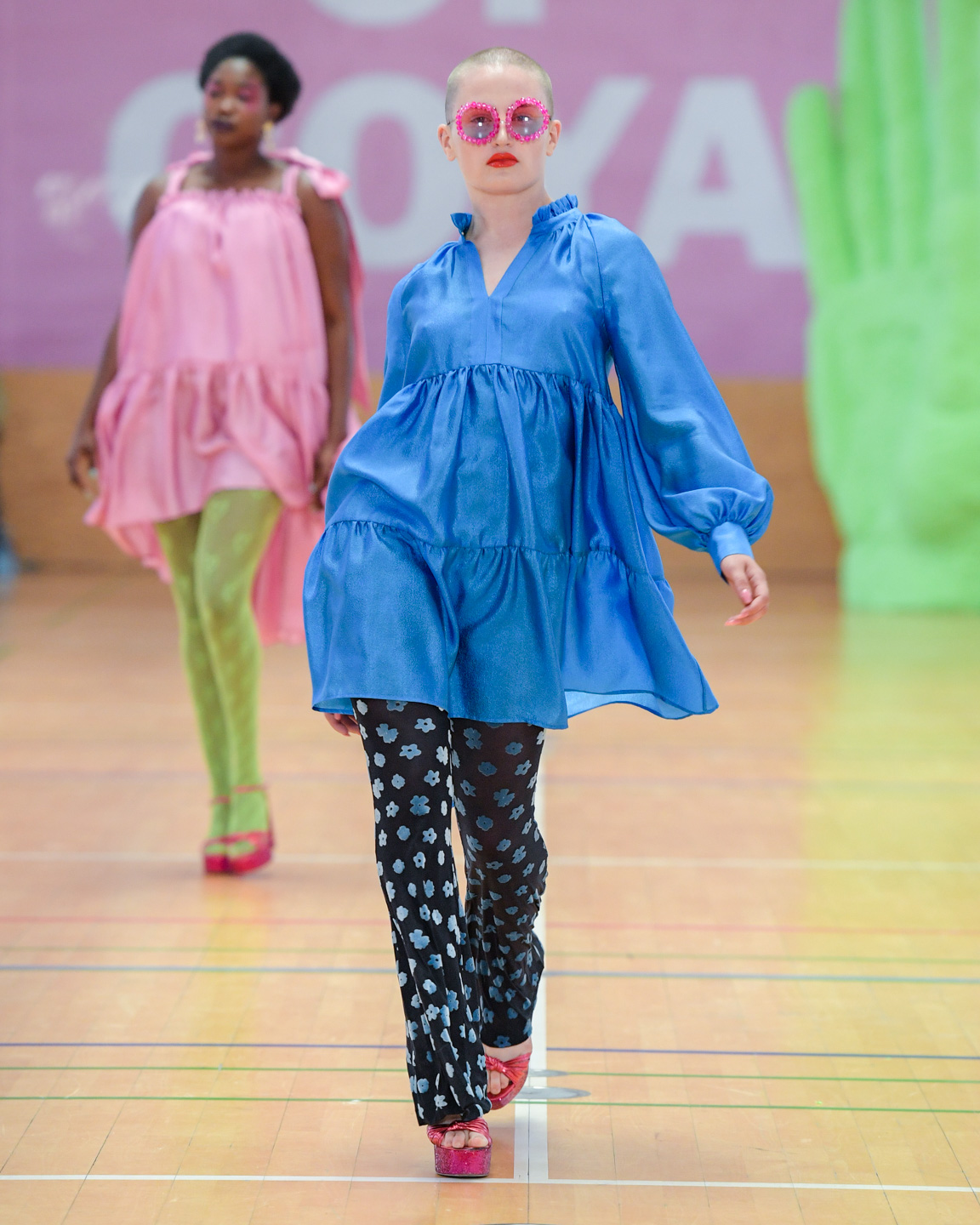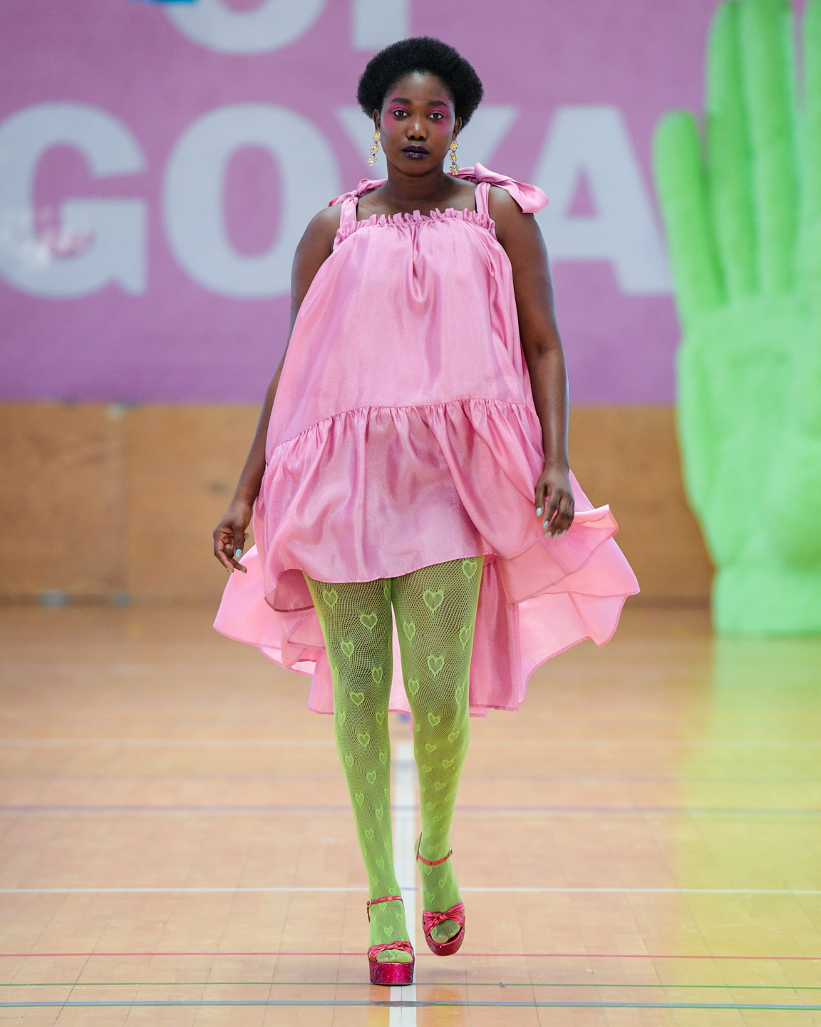 Bereits die aufgebaute Kulisse in der Turnhalle ließ vermuten, dass die Show von Stine Goya flamboyant werden würde – und tatsächlich glichen die kommenden Minuten vielmehr einer Zelebrierung von Mode und Diversität, als einer gängigen Modenschau. Inspiriert von der Ballroom Kultur steht die Spring Summer 2020 Kollektion unter dem Motto „House of Goya“ und zeigt sich in einer extravaganten Ästhetik, die in den bunten Entwürfen, aber auch im Cast Platz findet. So wurden die Designs eher von Persönlichkeiten als bloßen Models präsentiert, die in einer koketten Attitüde über den Turnhallenboden schritten und für ihren Auftritt jede Menge Jubelrufe erhielten. Für den Cast selbst arbeitete Stine Goya mit Mitgliedern aus lokalen und internationalen Ballroom und Kiki Häusern zusammen, um sich nicht einfach einer Kultur zu bedienen, sondern diese vielmehr direkt zu integrieren.
