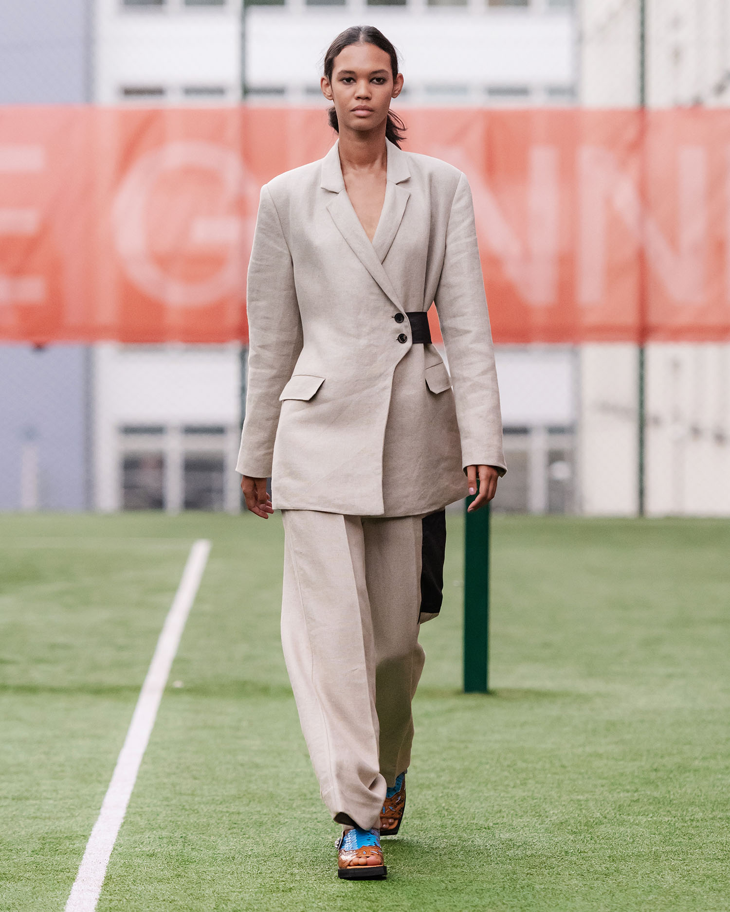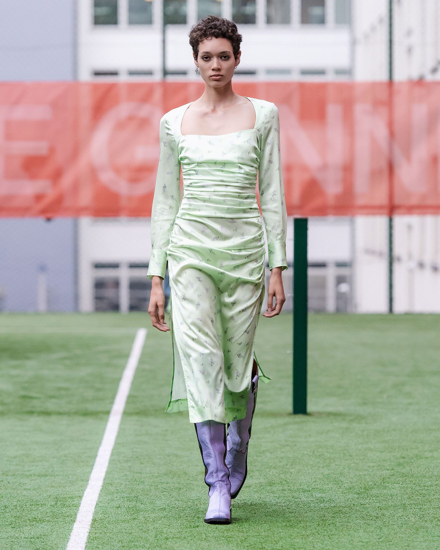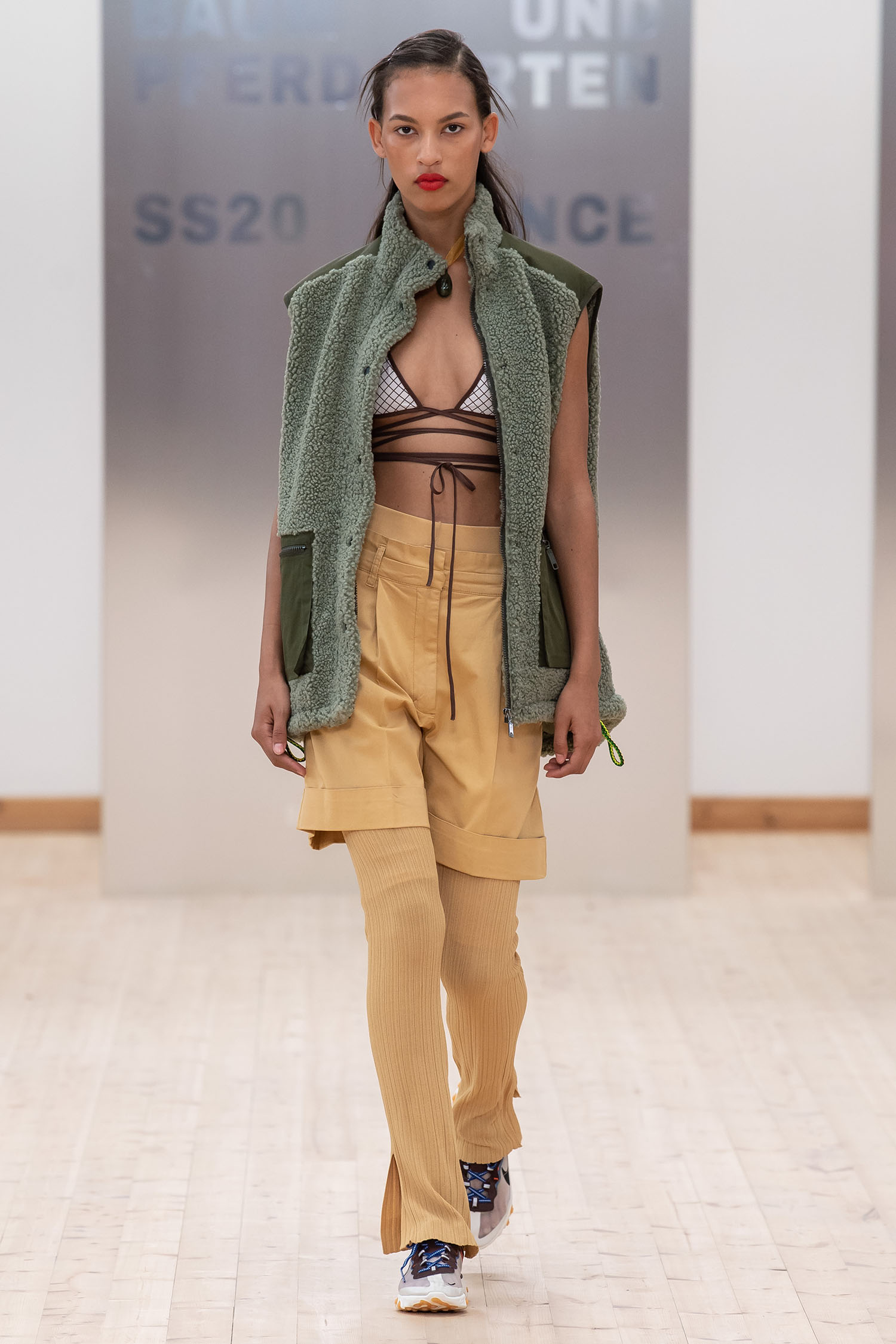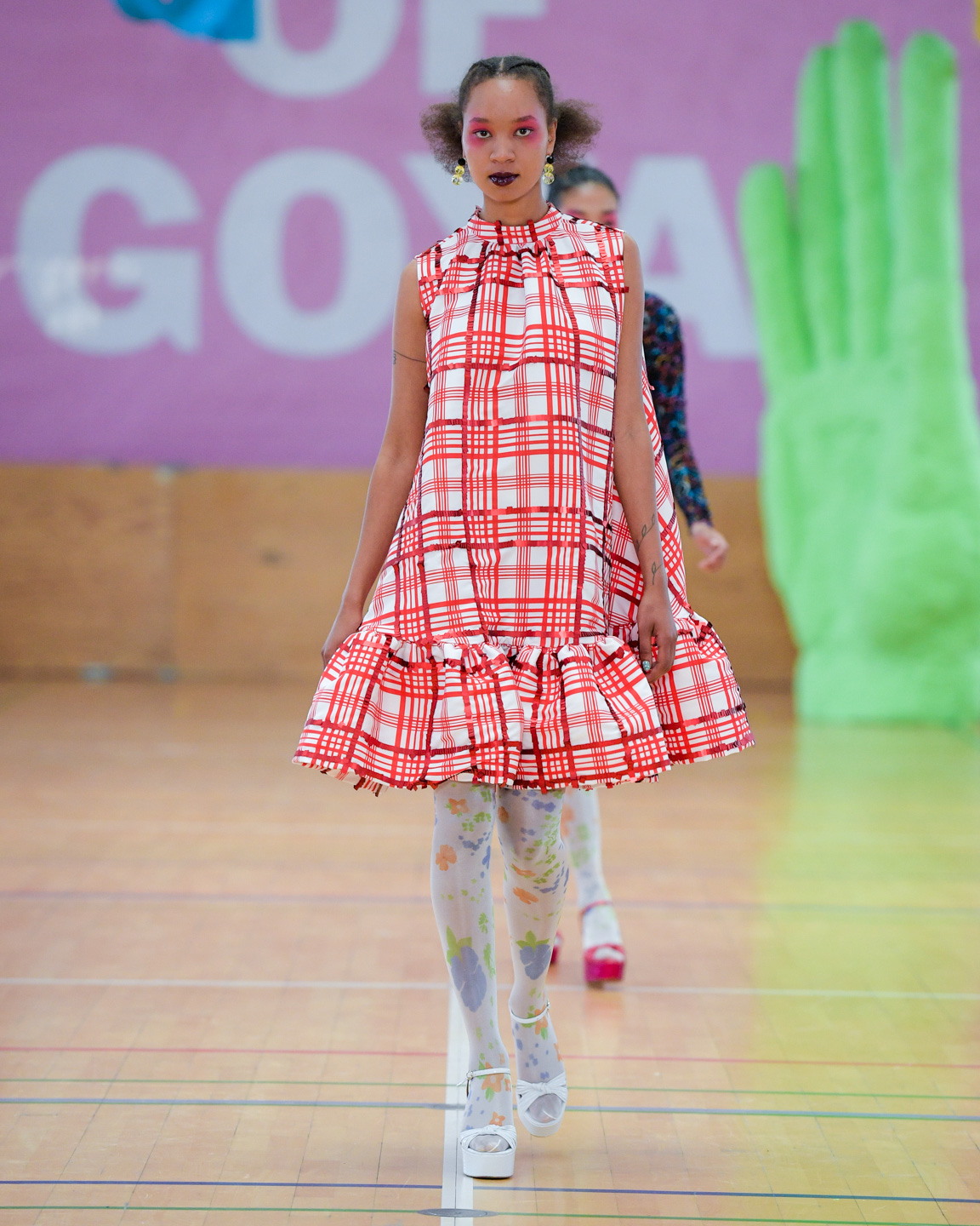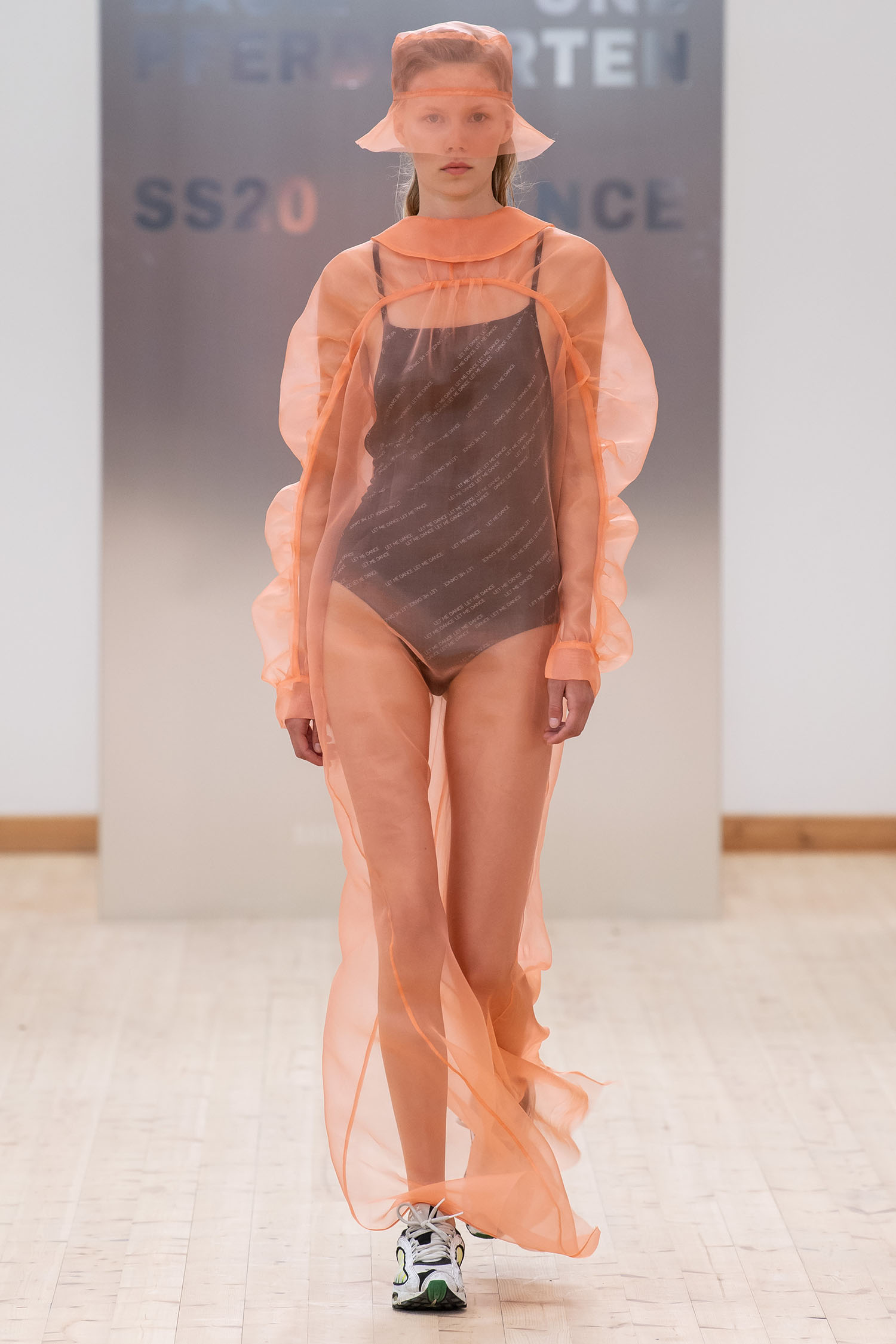 Bereits die aufgebaute Kulisse in der Turnhalle ließ vermuten, dass die Show von Stine Goya flamboyant werden würde – und tatsächlich glichen die kommenden Minuten vielmehr einer Zelebrierung von Mode und Diversität, als einer gängigen Modenschau. Inspiriert von der Ballroom Kultur steht die Spring Summer 2020 Kollektion unter dem Motto „House of Goya“ und zeigt sich in einer extravaganten Ästhetik, die in den bunten Entwürfen, aber auch im Cast Platz findet. So wurden die Designs eher von Persönlichkeiten als bloßen Models präsentiert, die in einer koketten Attitüde über den Turnhallenboden schritten und für ihren Auftritt jede Menge Jubelrufe erhielten. Für den Cast selbst arbeitete Stine Goya mit Mitgliedern aus lokalen und internationalen Ballroom und Kiki Häusern zusammen, um sich nicht einfach einer Kultur zu bedienen, sondern diese vielmehr direkt zu integrieren.